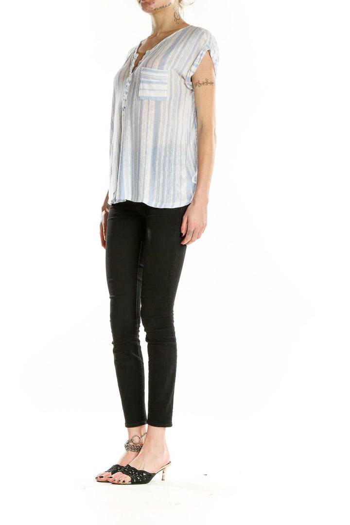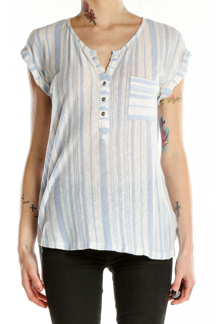 Embrace effortless summer style with this breezy blue and white striped linen top from C&C California. The relaxed fit and soft linen fabric offer supreme comfort for warm days, while the vertical stripes create a flattering, elongating effect. Features include a henley-style neckline with button placket, a convenient chest pocket, and casual rolled short sleeves. The lightweight linen material ensures excellent breathability and a cool feel against the skin. Perfect for pairing with your favorite jeans or shorts, this versatile top is an excellent addition to any casual wardrobe. In excellent condition, this medium-sized piece measures 38" in the bust, making it ideal for a relaxed, breezy fit.