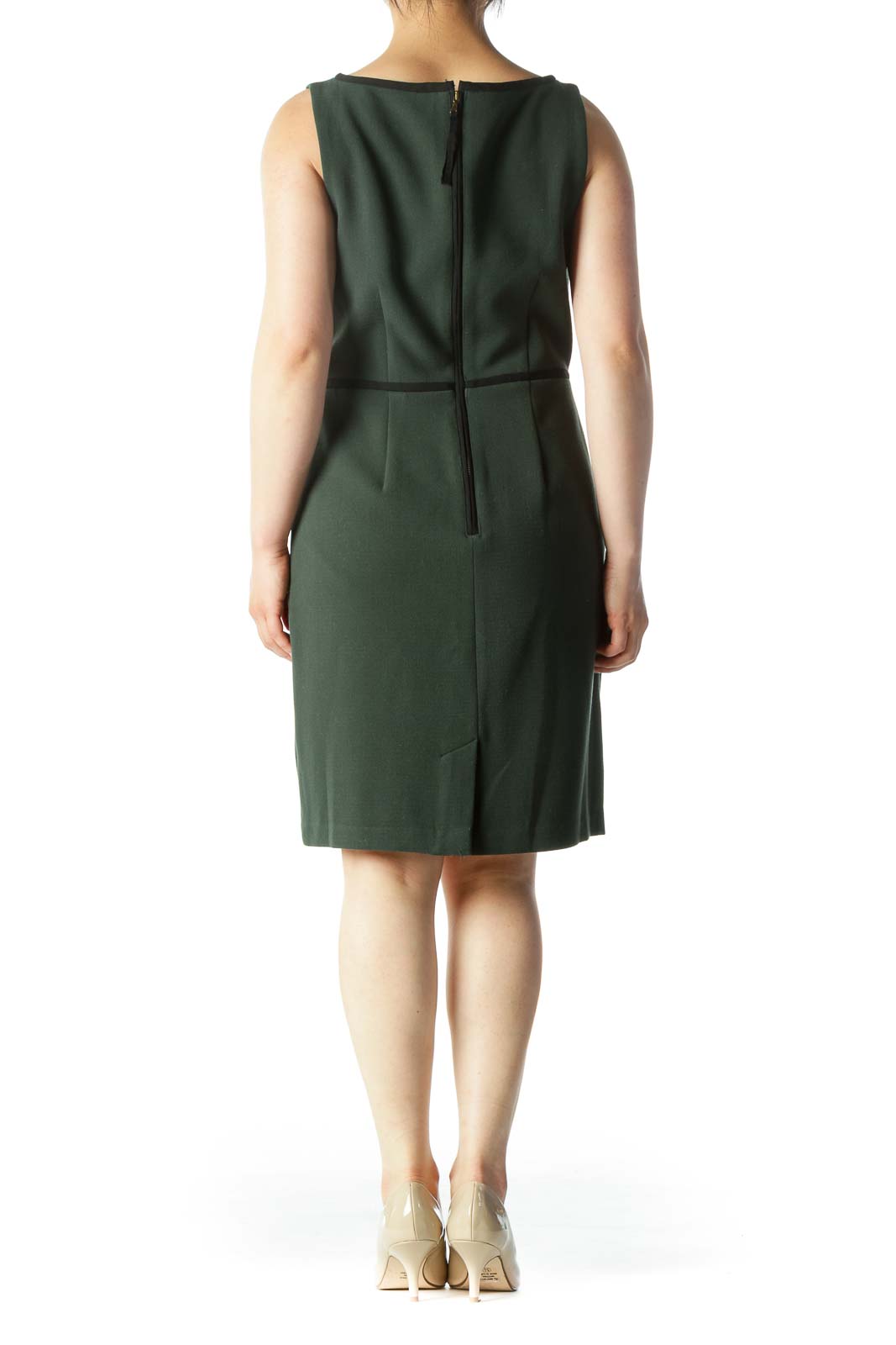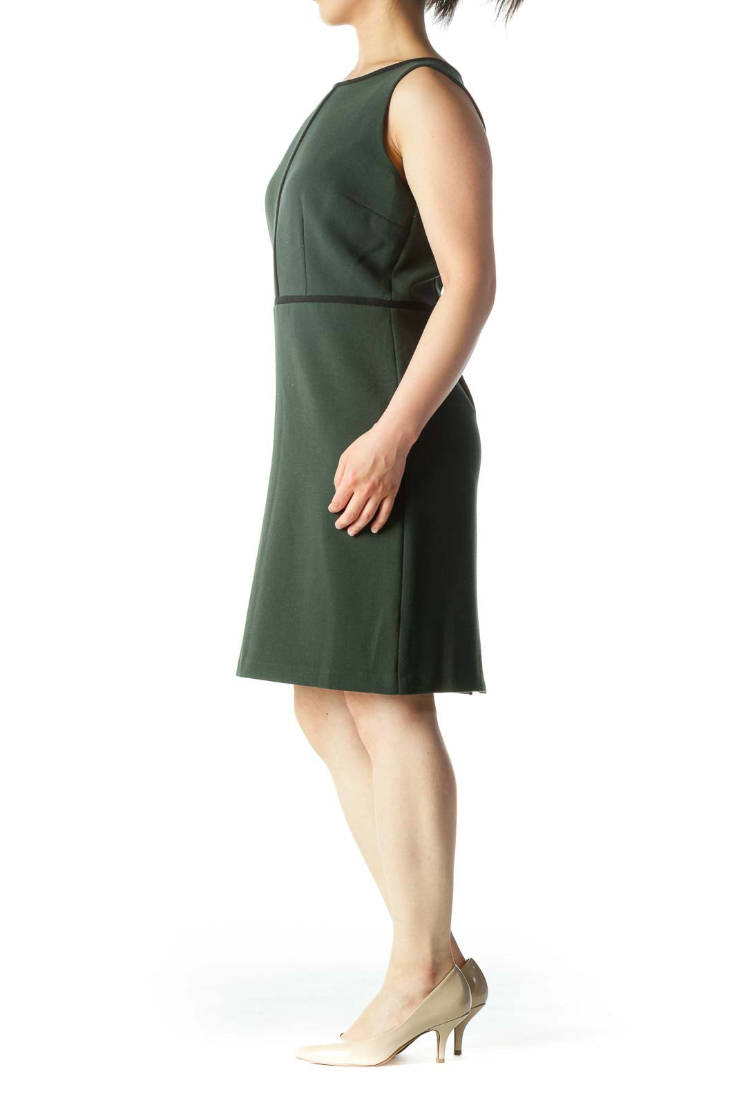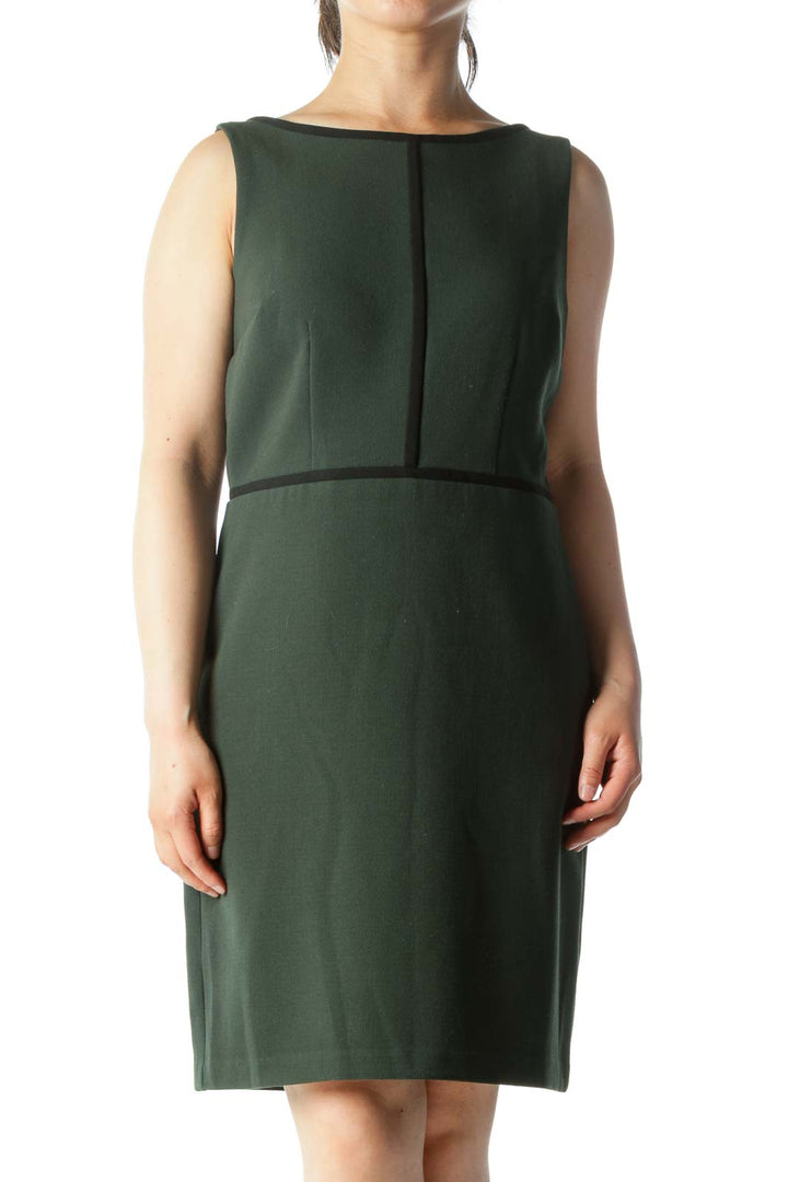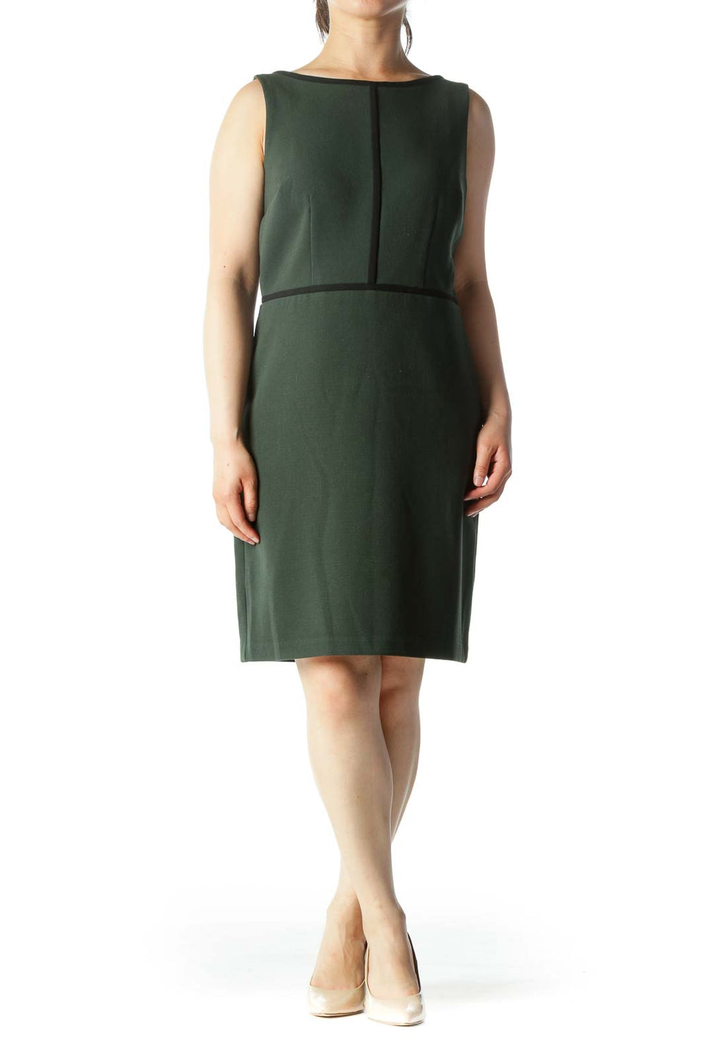 Forest Green Sleeveless Shift Dress With Navy Piping