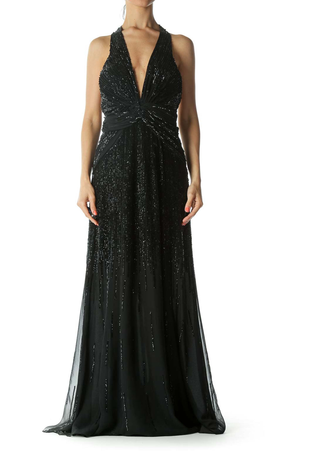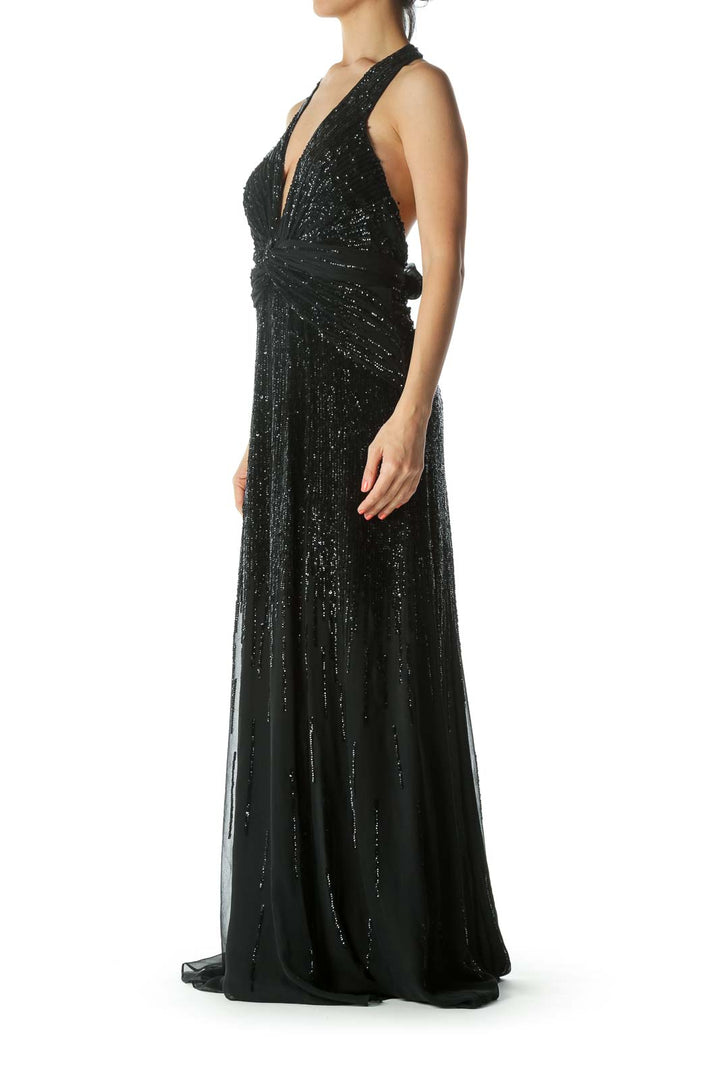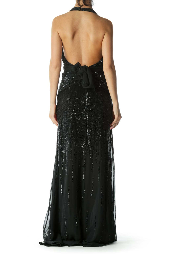 Black 100% Silk Sequined Halter-Neckline Front-Knot-Detail Evening Dress