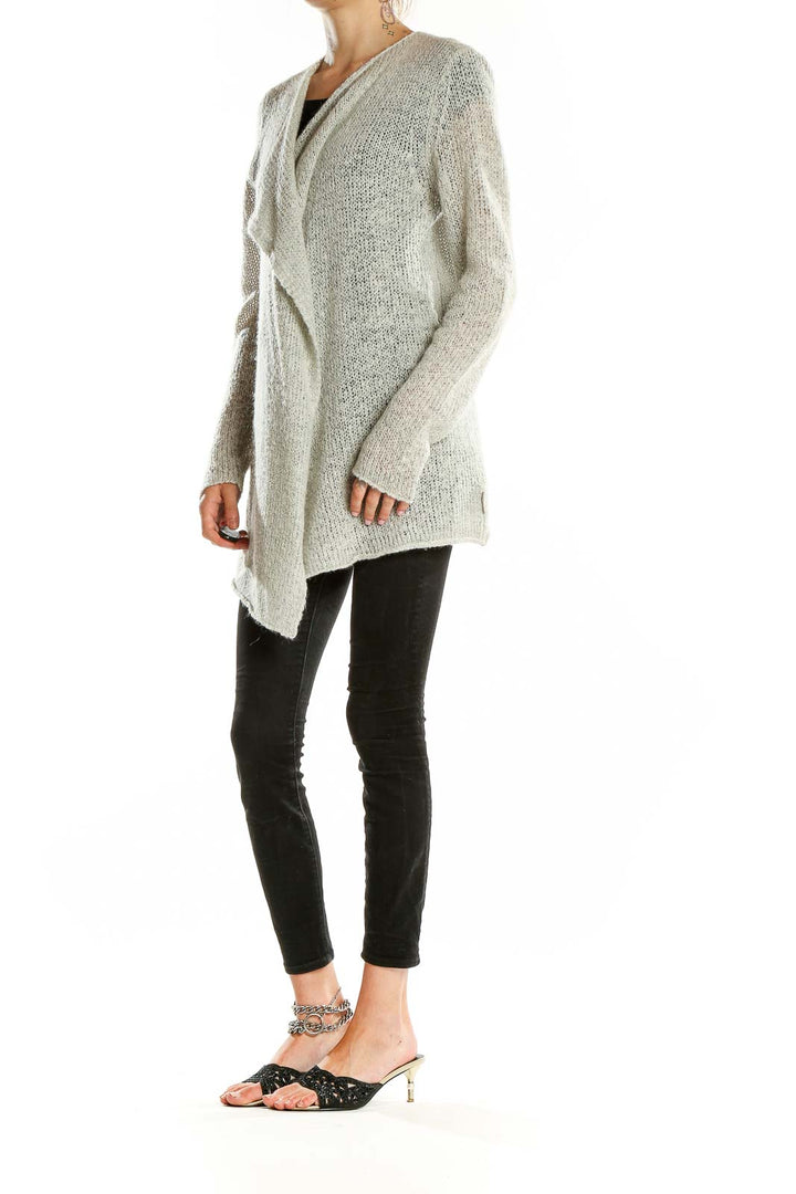 Wrap yourself in cozy elegance with this stunning gray asymmetrical knit cardigan from Calvin Klein Jeans. Crafted from a luxurious blend of acrylic, polyester, and wool, this medium-sized sweater offers both warmth and style. The unique asymmetrical design features a draped front that adds a touch of sophistication to any outfit. With a generous bust measurement of 42", this cardigan provides a comfortable, relaxed fit that's perfect for layering. The 28" length offers versatile coverage, making it ideal for pairing with jeans, leggings, or dresses. In excellent condition, this Calvin Klein Jeans cardigan is a must-have addition to your fall and winter wardrobe.