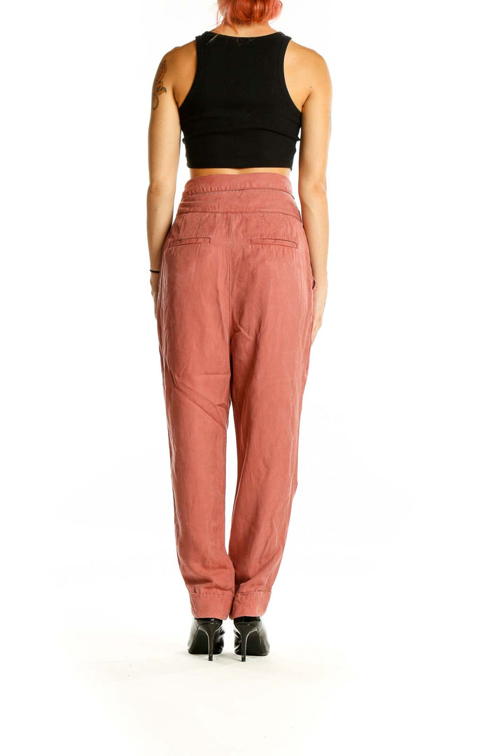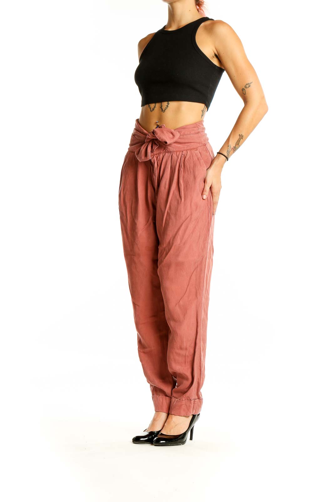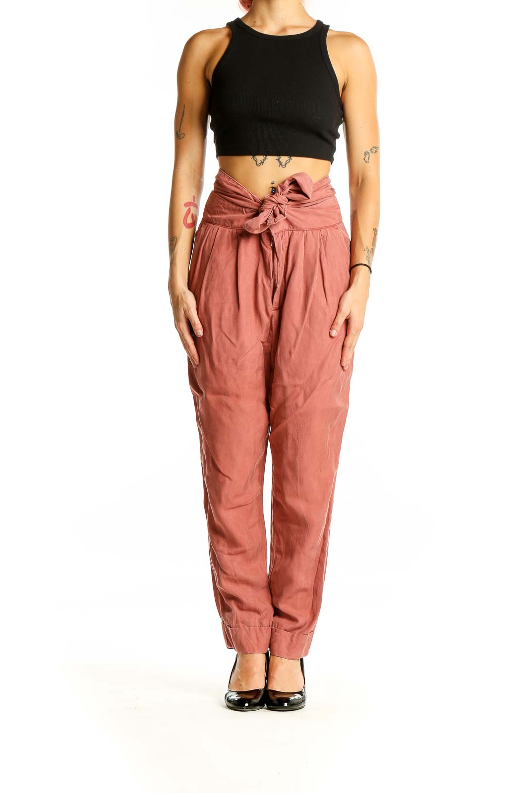 Step into effortless style with these terracotta-hued high-waisted pants from Cartonnier. Crafted from soft and sustainable Lyocell, these pants offer both comfort and eco-conscious fashion. The standout feature is the unique tie-front detail, adding a touch of feminine flair to the relaxed silhouette. With a generous hip measurement of 36" and a flattering 41" length, these pants are designed to complement various body types. The 30" waist and gathered fabric create a flattering shape, while the tapered legs end in subtle cuffs for a polished look. Perfect for both casual outings and dressed-up occasions, these versatile pants are a must-have addition to your wardrobe. In good condition, they're ready to become your new go-to piece for effortless, chic style.