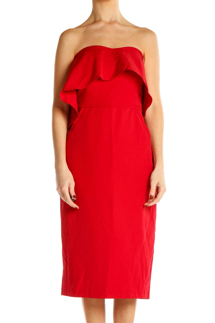 Make a stunning entrance in this vibrant red strapless midi dress by Chelsea28. The eye-catching ruffle overlay adds a touch of drama and femininity to the sleek silhouette. Crafted from a smooth, figure-flattering fabric, this dress hugs your curves in all the right places while the midi length offers a sophisticated finish. The sweetheart neckline beautifully frames your décolletage, making it perfect for special occasions or a night out on the town. With its versatile design, this dress can be easily dressed up with statement jewelry and heels or paired with a denim jacket for a more casual look. New with tags, this size Large dress is ready to become the showstopper in your wardrobe.
