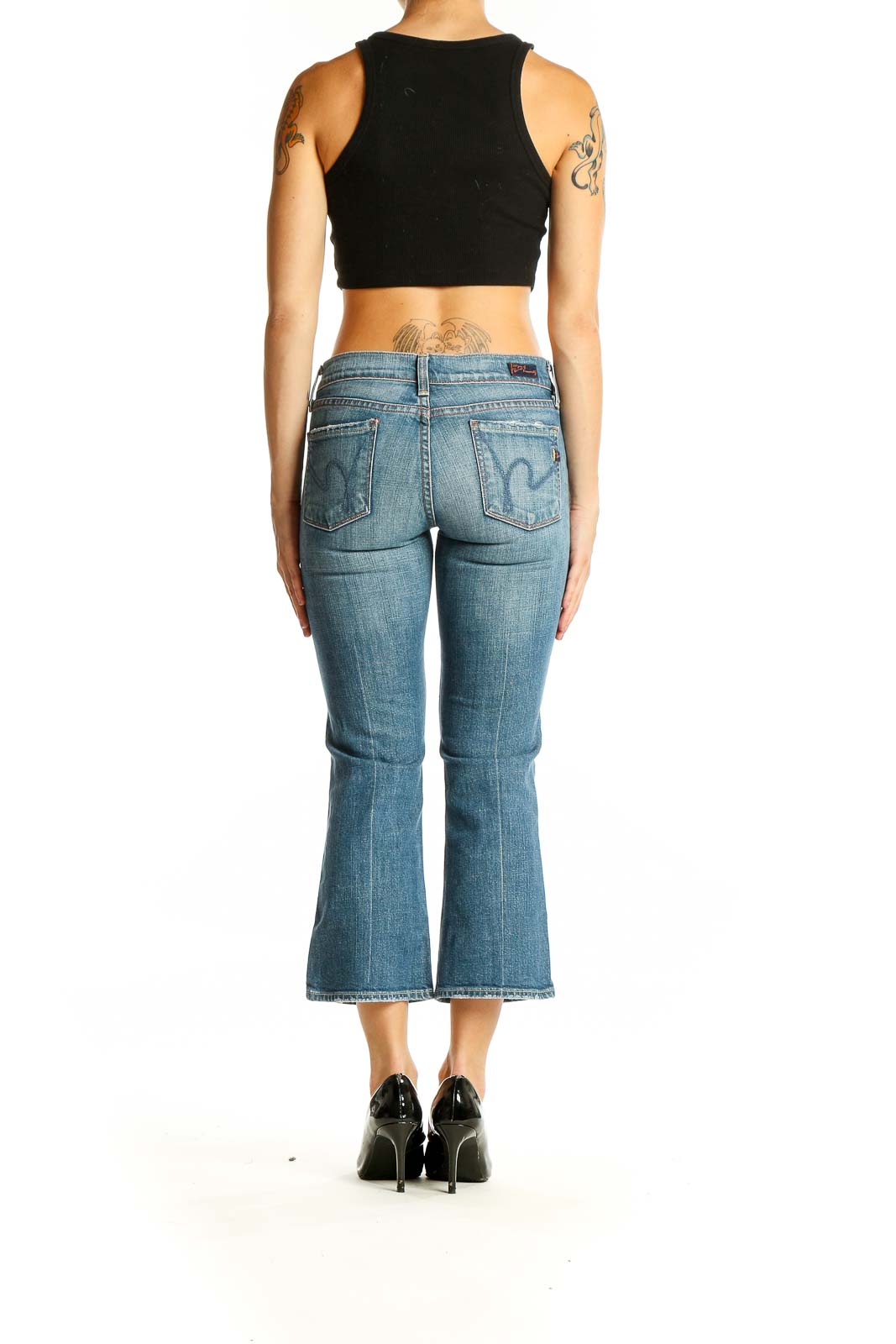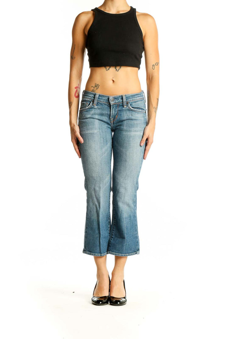 Step into effortless style with these light blue cropped flare jeans from Citizens of Humanity. Crafted from a comfortable blend of cotton and Lycra, these jeans offer both durability and stretch for all-day comfort. The cropped length hits just above the ankle, perfect for showcasing your favorite footwear. With a classic five-pocket design and subtle fading for a lived-in look, these jeans embody casual chic. The flared silhouette adds a touch of retro flair while flattering your curves. In excellent condition, these jeans are a versatile addition to any wardrobe, easily dressed up or down for various occasions.