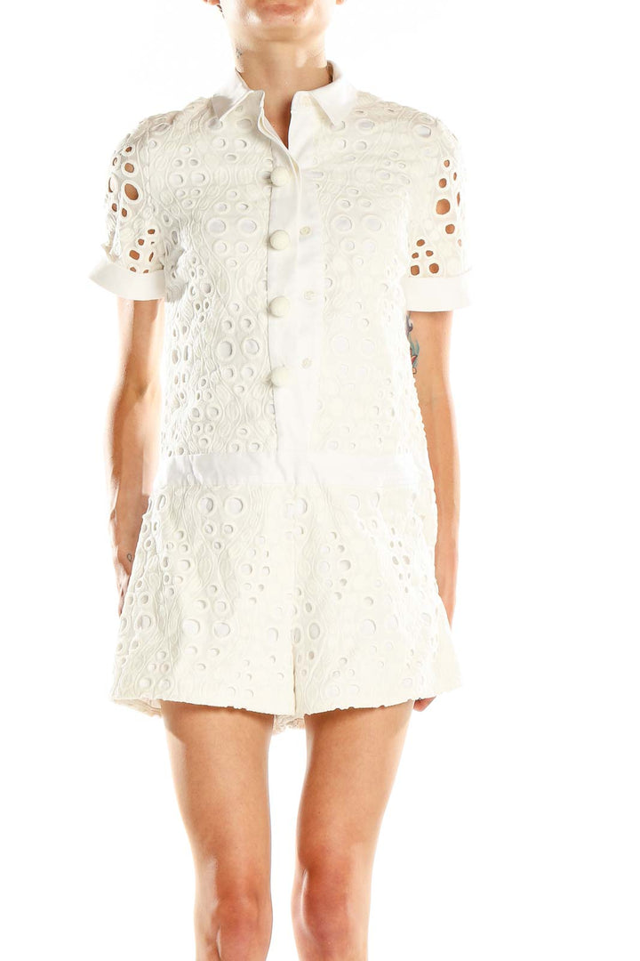 Step into summer elegance with this charming white eyelet lace romper by Alexis. Crafted from delicate cotton fabric, this all-in-one piece features an intricate eyelet pattern that adds a touch of romance and sophistication. The short sleeves and collared neckline offer a classic silhouette, while the button-down front allows for easy wear.