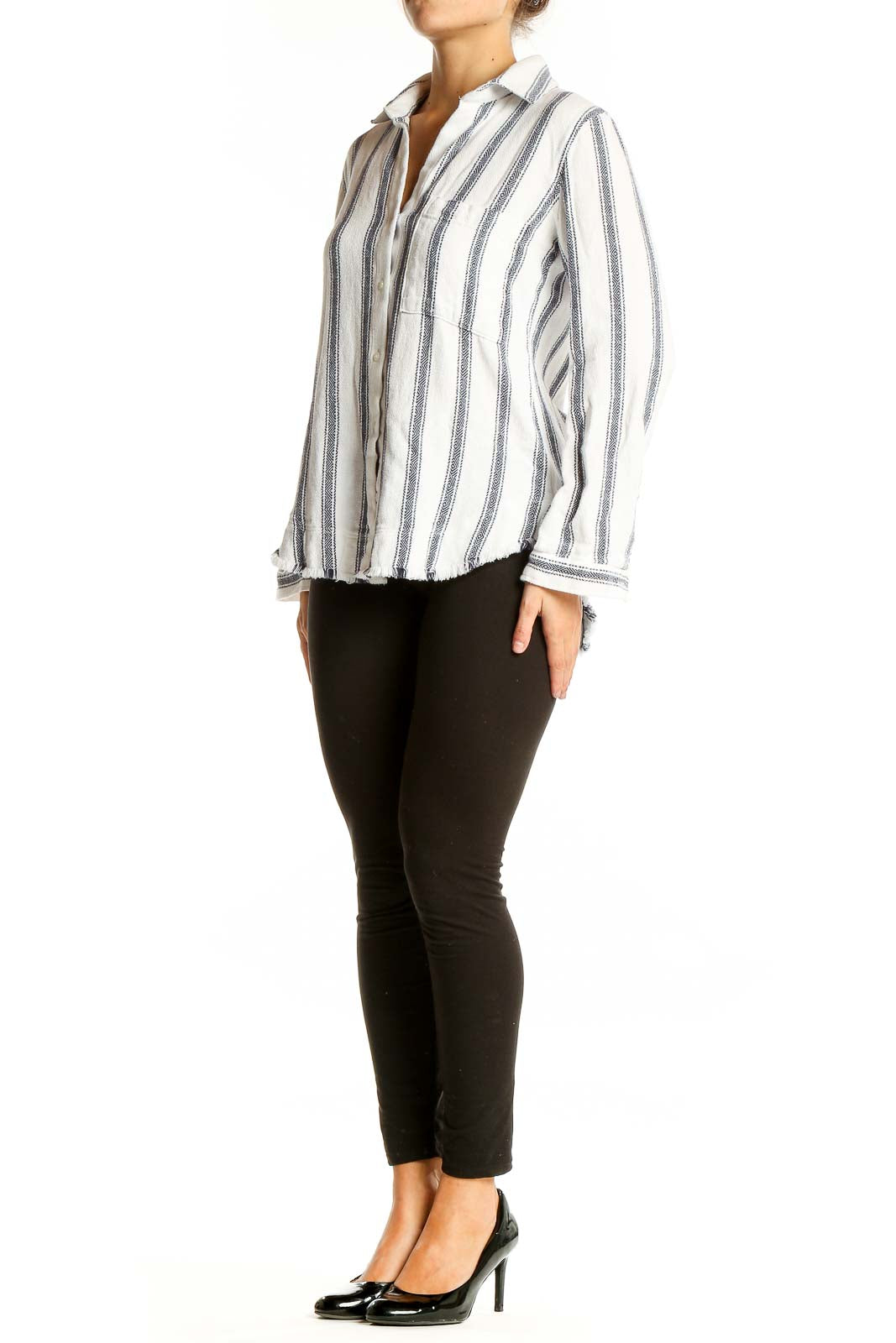 The raw, frayed hem at the bottom adds a contemporary twist to this otherwise classic piece, giving it a subtle edge that sets it apart. In excellent condition, this cloth & stone shirt is a versatile addition to your wardrobe, easily paired with jeans for a casual look or dressed up with slacks for a more polished ensemble.