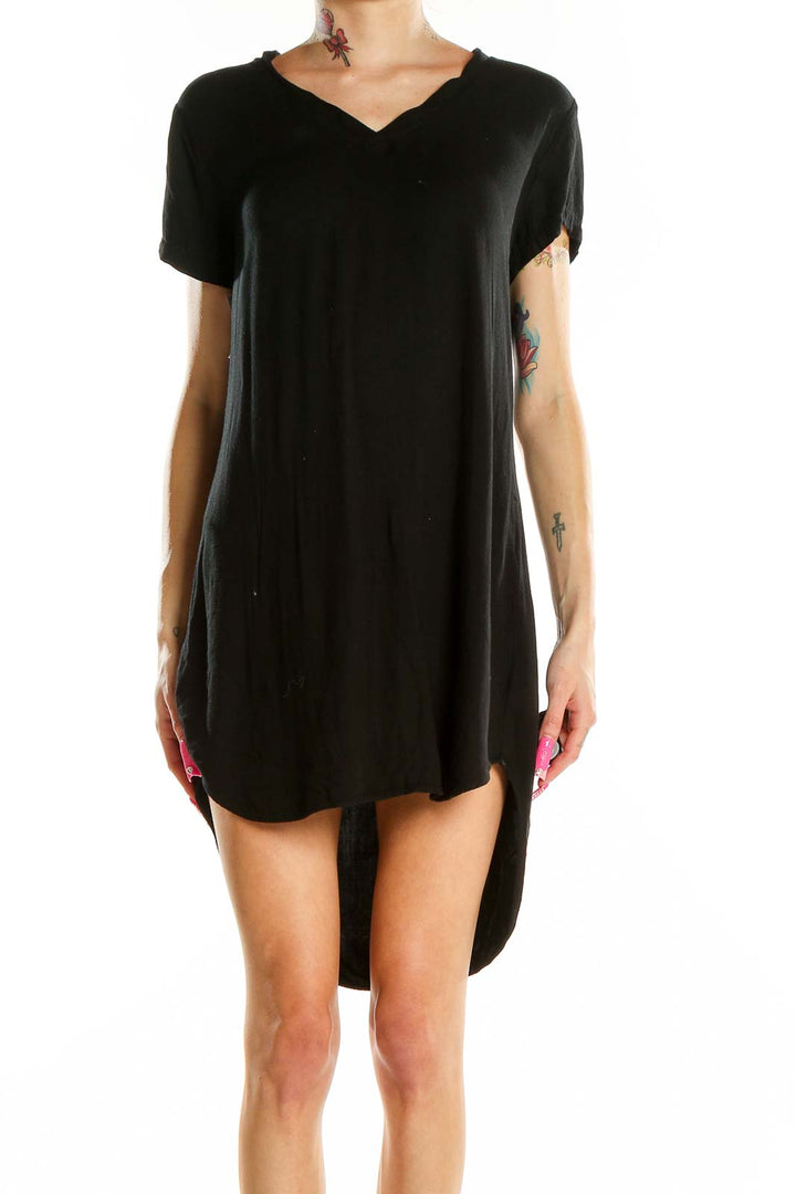 Elevate your casual wardrobe with this chic black rayon high-low dress by cloth & stone. Perfect for effortless style, this versatile piece features a flattering V-neckline and short sleeves for a comfortable fit. The flowing silhouette drapes beautifully, with a shorter front hem that gracefully curves to a longer back, creating an elegant and modern look. Crafted from soft, breathable rayon, this dress offers both comfort and style for all-day wear. The relaxed fit and curved hemline make it an ideal choice for various occasions, from casual outings to dressed-up events. In good condition, this dress is a timeless addition to your wardrobe that can be easily accessorized for any season.