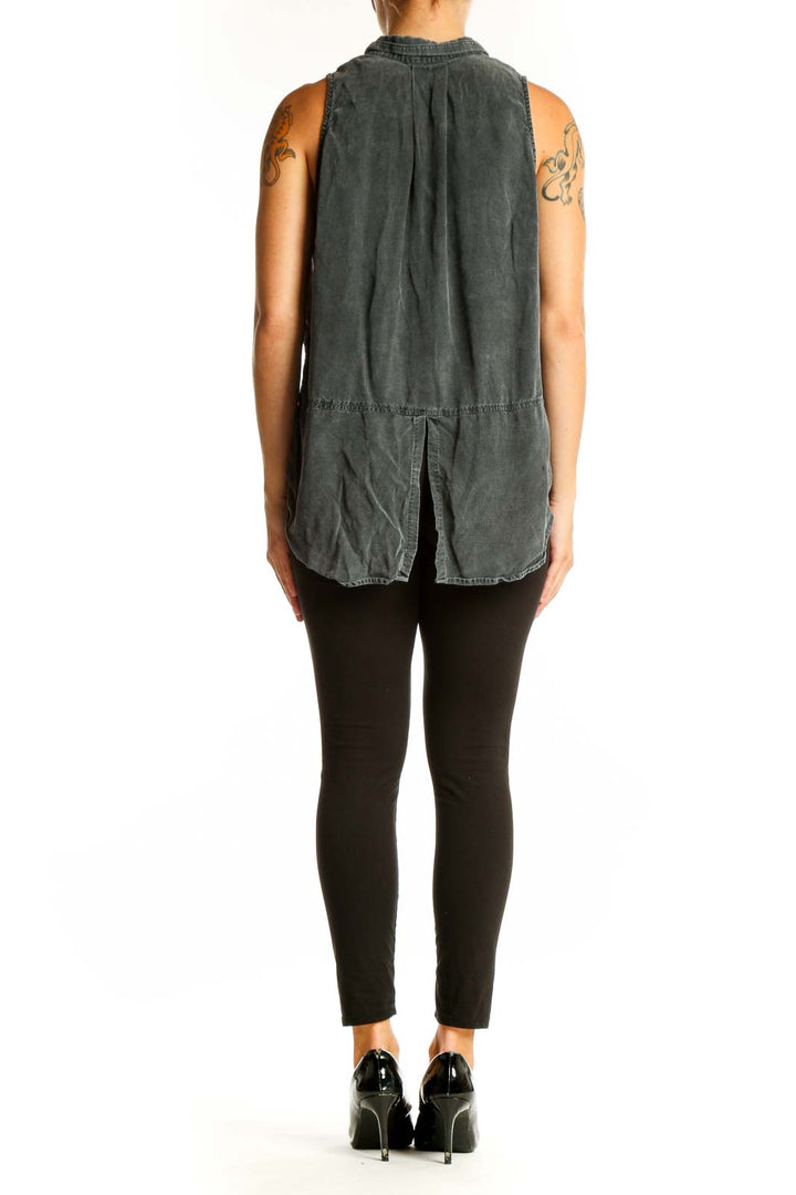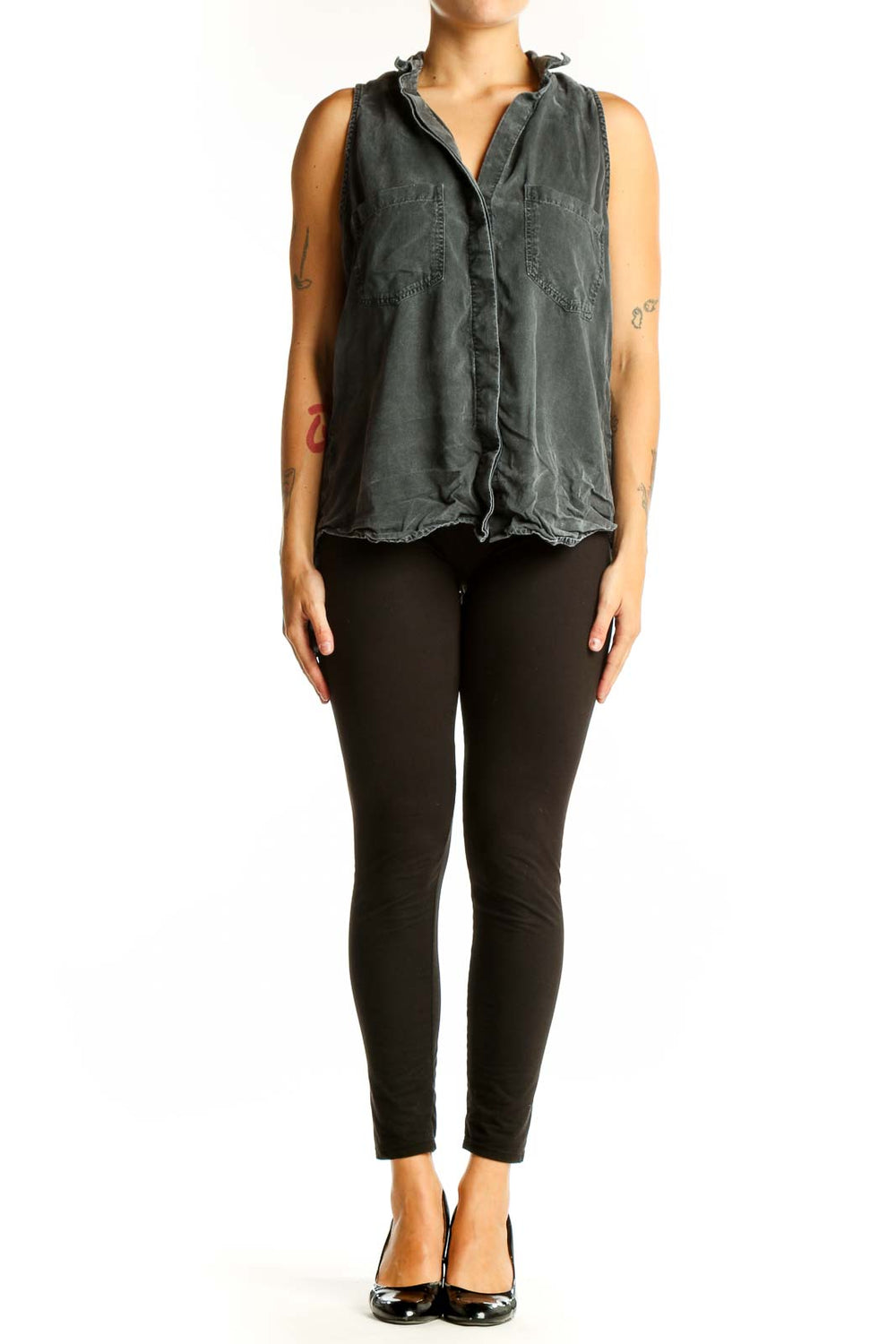 Featuring a classic collar and front button closure, this top exudes a effortlessly chic vibe. The soft, washed gray fabric gives it a lived-in look that pairs well with jeans, shorts, or skirts. Two front patch pockets add a functional touch while maintaining the top's clean lines.