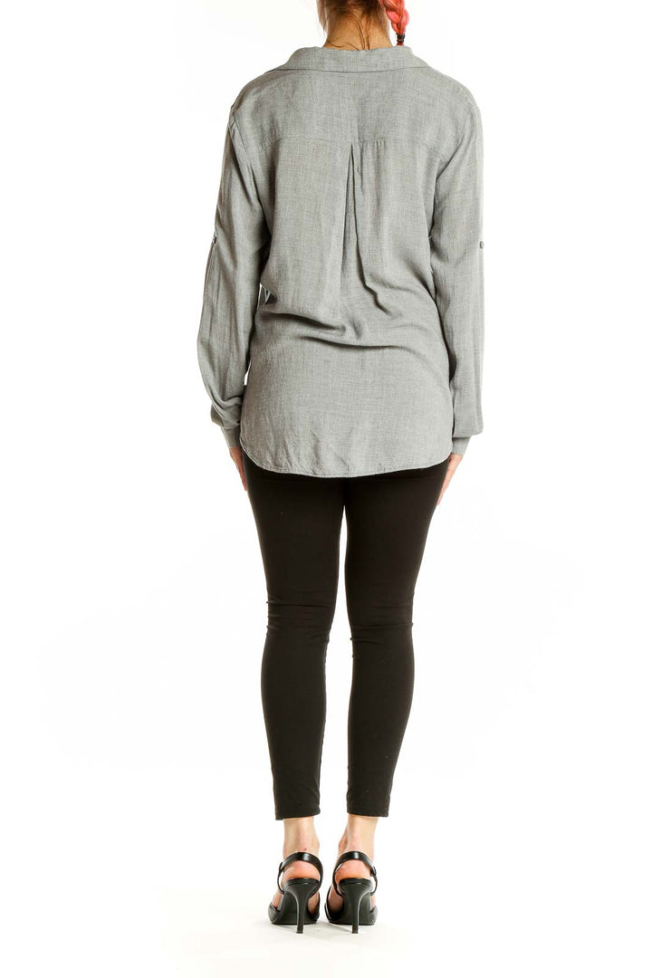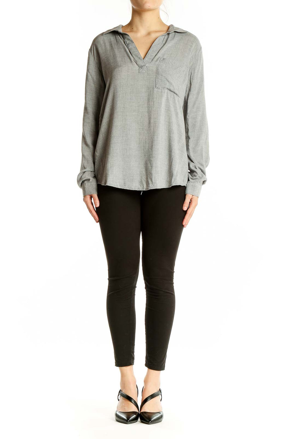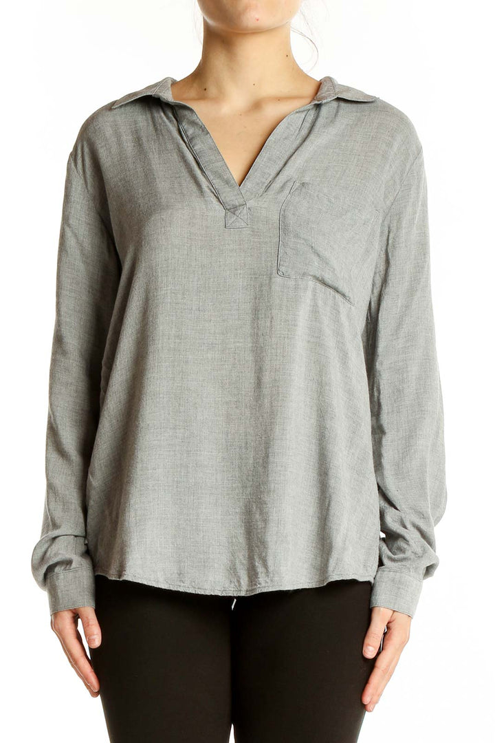 Elevate your casual wardrobe with this sophisticated gray top from cloth & stone. Crafted from soft and breathable viscose, this long-sleeve shirt offers both comfort and style. The relaxed fit and v-neck design create a flattering silhouette suitable for various body types. A convenient chest pocket adds a touch of functionality to this versatile piece. The shirt features a classic collar and a subtle pleat detail on the back, enhancing its laid-back yet polished appearance. In good condition, this top is perfect for everyday wear or can be easily dressed up for more formal occasions. With its generous measurements (Bust 42", Length 29", Waist 38"), it provides a comfortable fit for a medium size. Whether paired with jeans for a casual look or tucked into a skirt for a more refined ensemble, this cloth & stone top is sure to become a staple in your wardrobe.