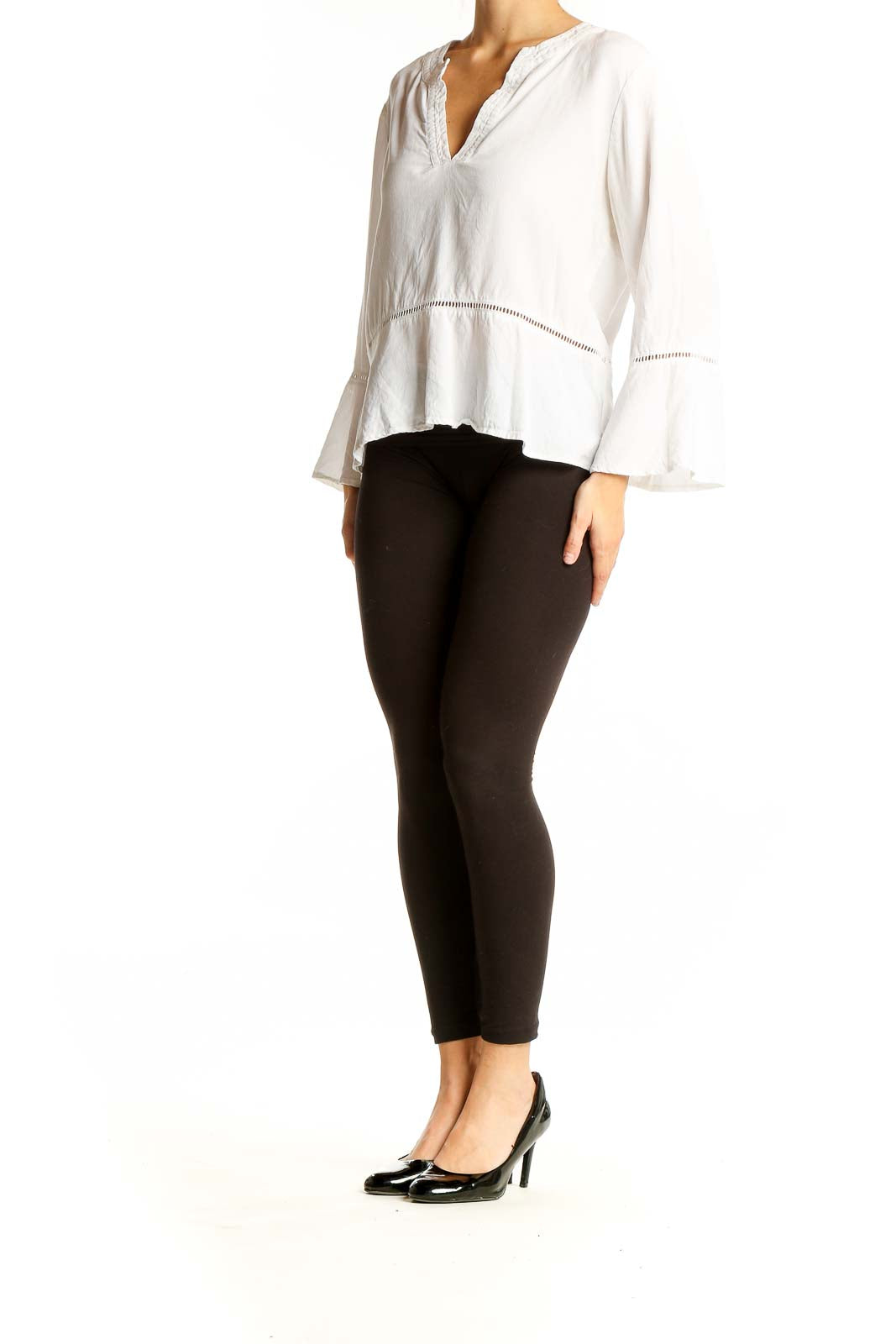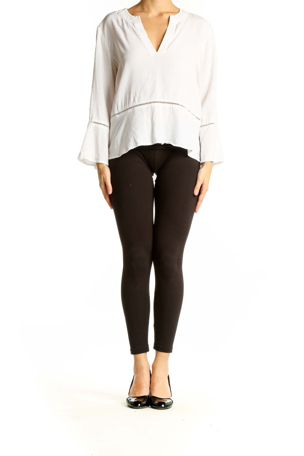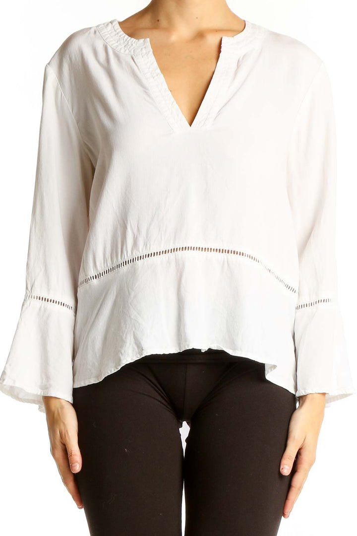 Front view of white Tencel Lyocell V-neck blouse with bell sleeves by cloth & stone