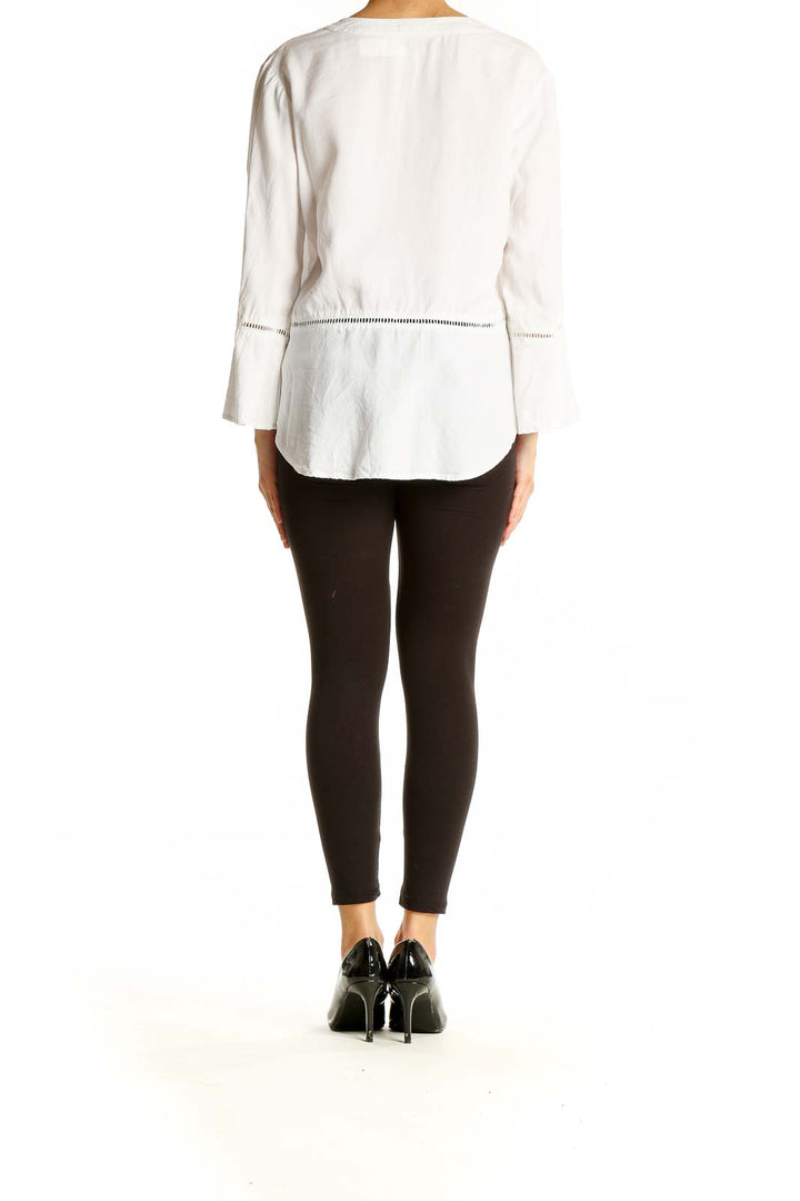 In excellent condition, this size Small blouse offers a relaxed fit with measurements of 40" in the bust and hips, a 36" waist, and a flattering 26" length. The pristine white color makes it a timeless addition to any fashion-forward closet.