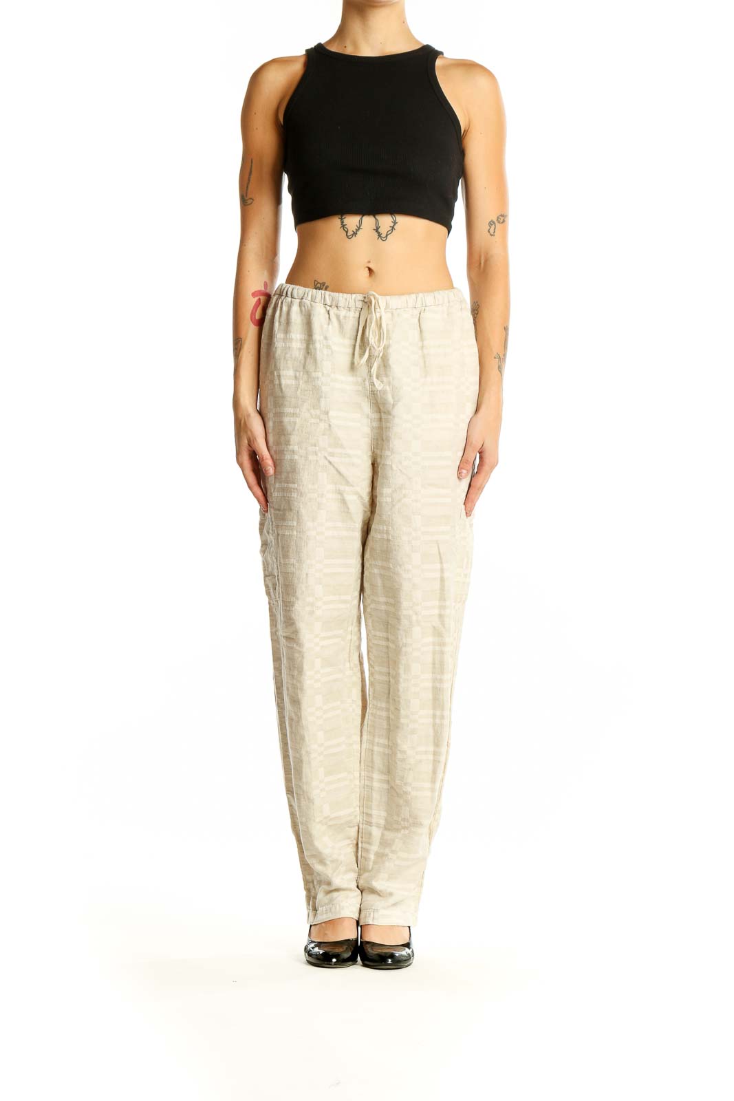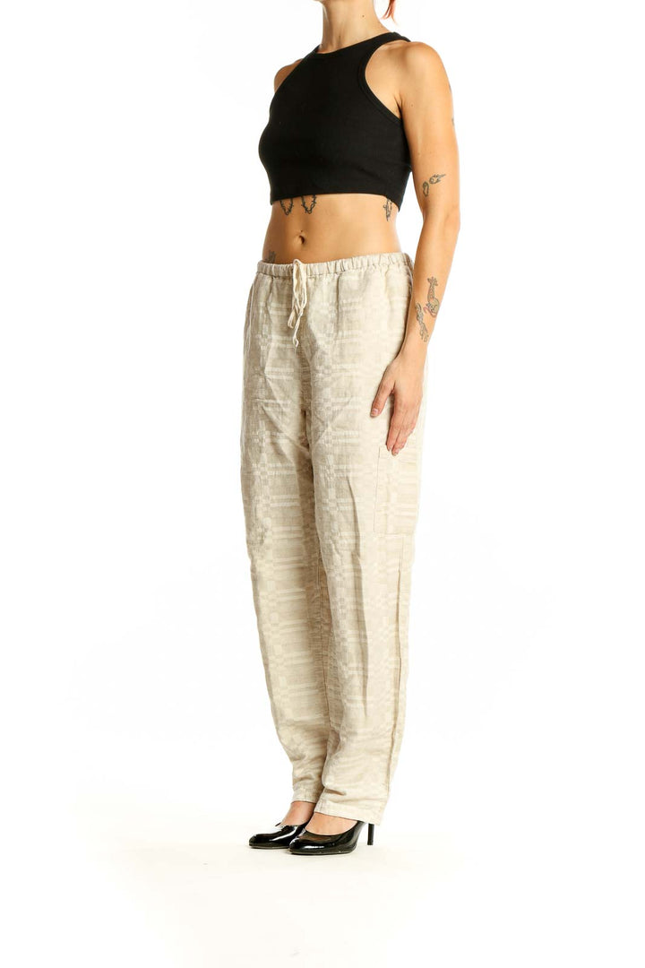 Step into comfort and style with these beige cotton-linen blend pants from Coldwater Creek. Perfect for casual outings or relaxed workdays, these pants offer a breezy, lightweight feel that's ideal for warmer weather. The relaxed fit and elastic waistband with drawstring ensure all-day comfort, while the full-length design provides versatile styling options. Made from a quality blend of cotton and linen, these pants offer breathability and durability. The neutral beige color makes them easy to pair with a variety of tops and accessories. In good condition, these pants are a great addition to your wardrobe for effortless, laid-back style.