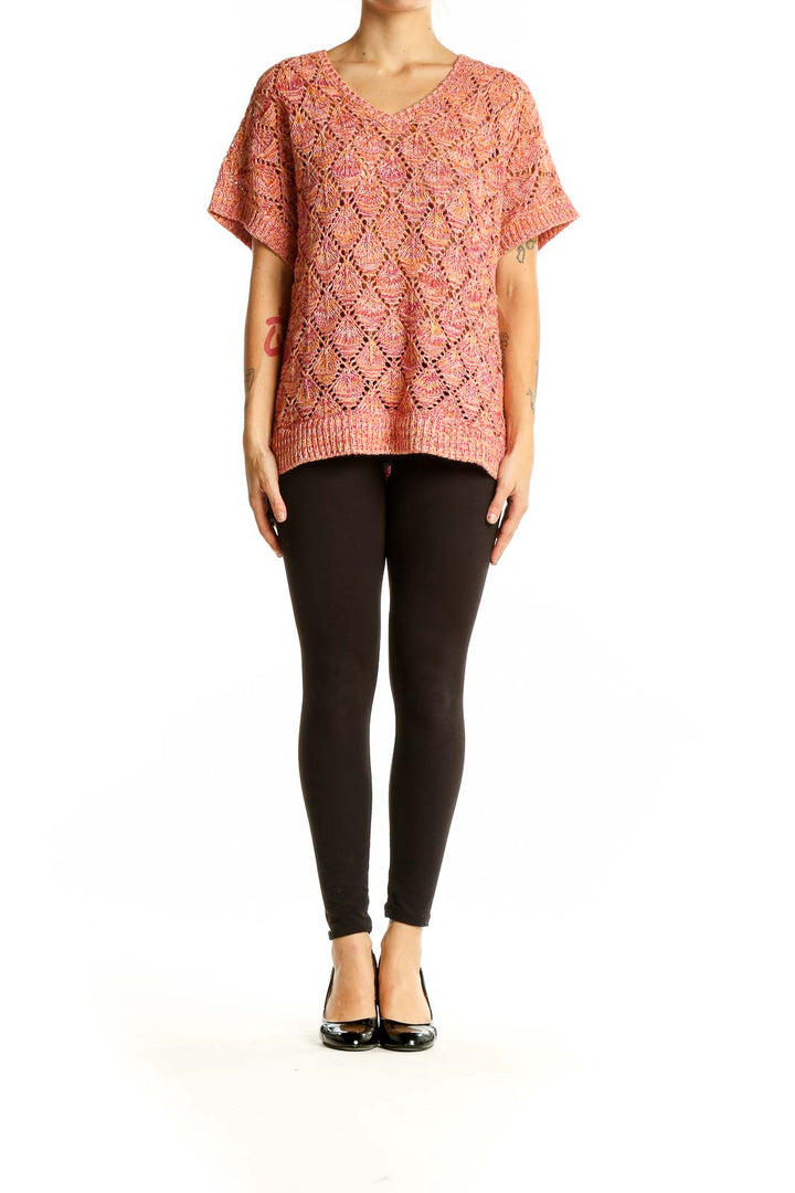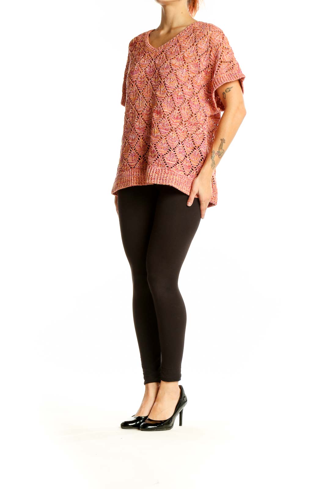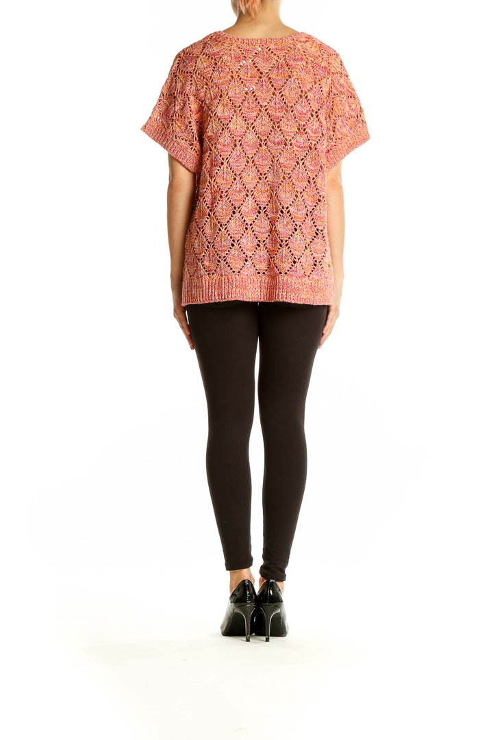 Elevate your casual wardrobe with this stunning coral openwork knit sweater from Coldwater Creek. This exquisite piece features a delicate diamond pattern throughout, creating an airy and feminine look perfect for layering or wearing on its own. The short sleeves and relaxed fit offer versatility and comfort for various occasions.