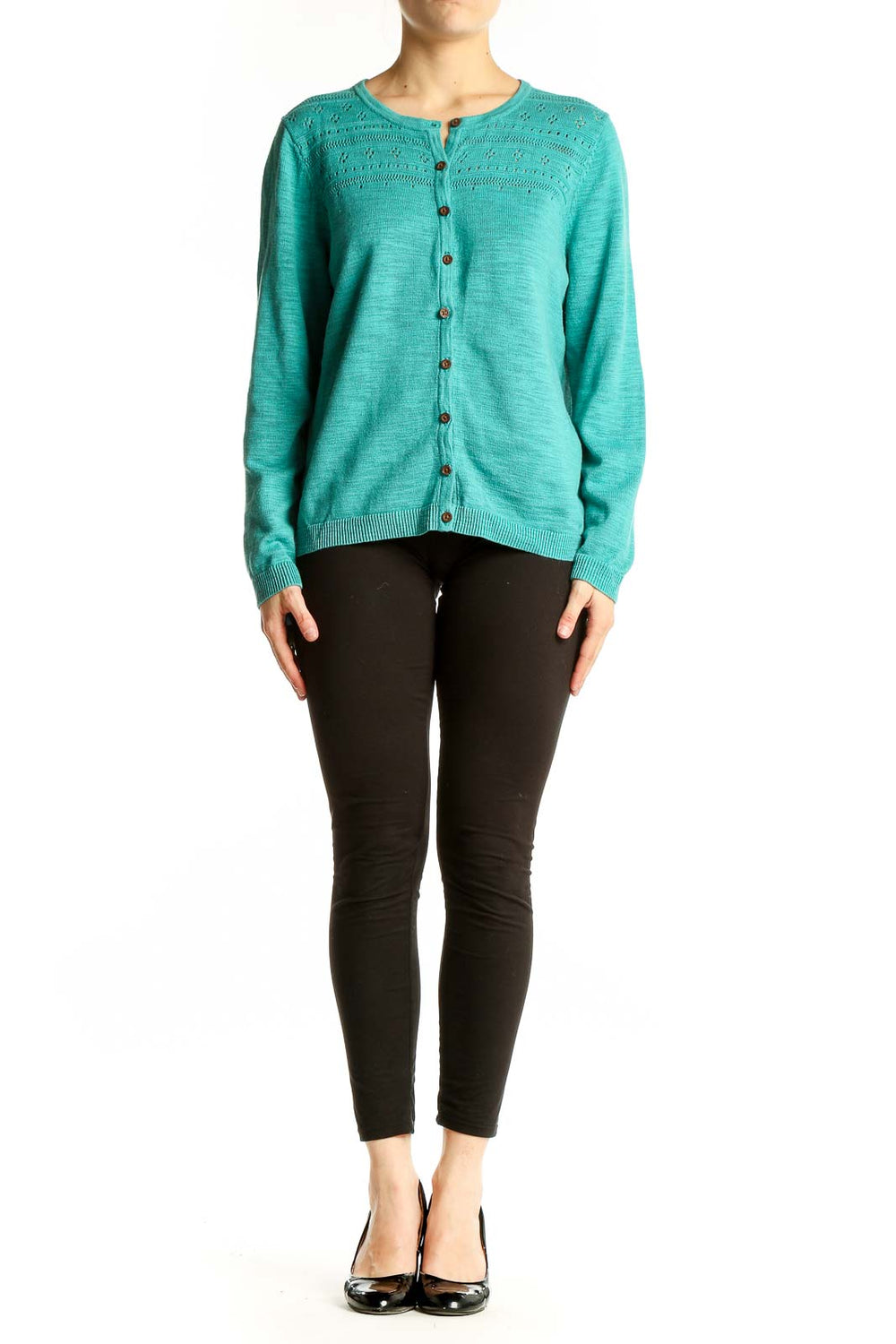 Featuring a delicate eyelet pattern across the yoke, this cardigan combines classic design with a touch of femininity. The button-up front allows for versatile styling, whether worn open as a light layer or buttoned up for a more polished look. With a comfortable fit measuring 34" in the bust, 32" in the waist, and 22" in length, it's ideal for a range of body types.