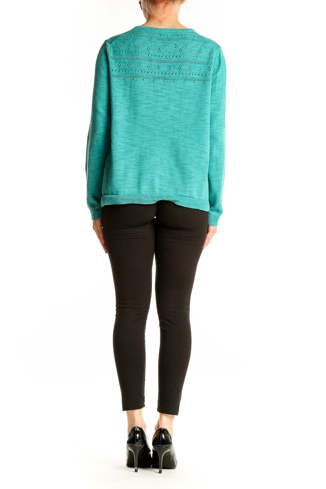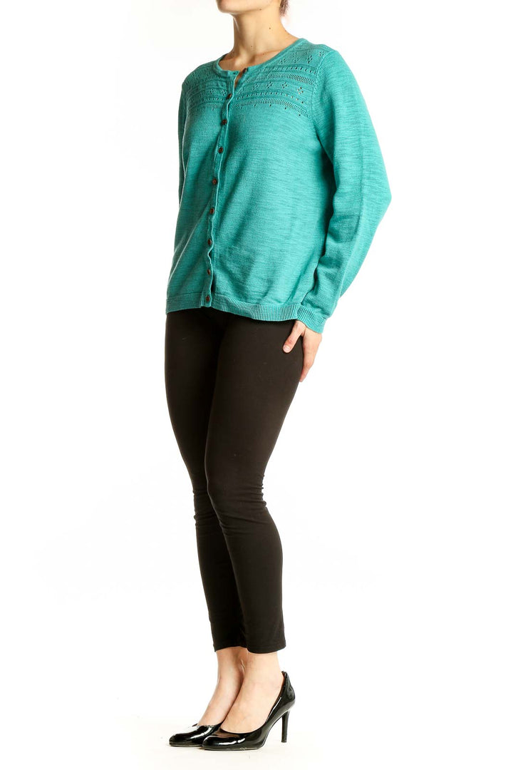 Elevate your casual wardrobe with this charming teal knit cardigan from Coldwater Creek. Crafted from a cozy blend of acrylic and cotton, this medium-sized sweater offers both comfort and style. The eye-catching teal hue is perfect for adding a pop of color to your outfit.
