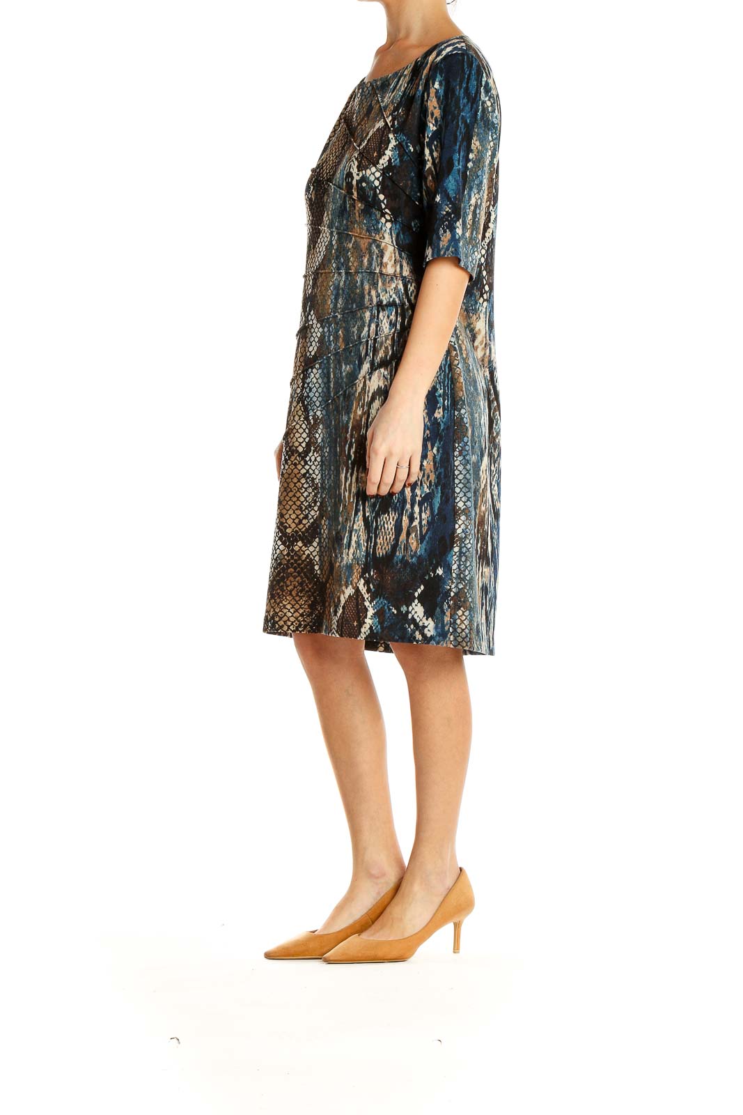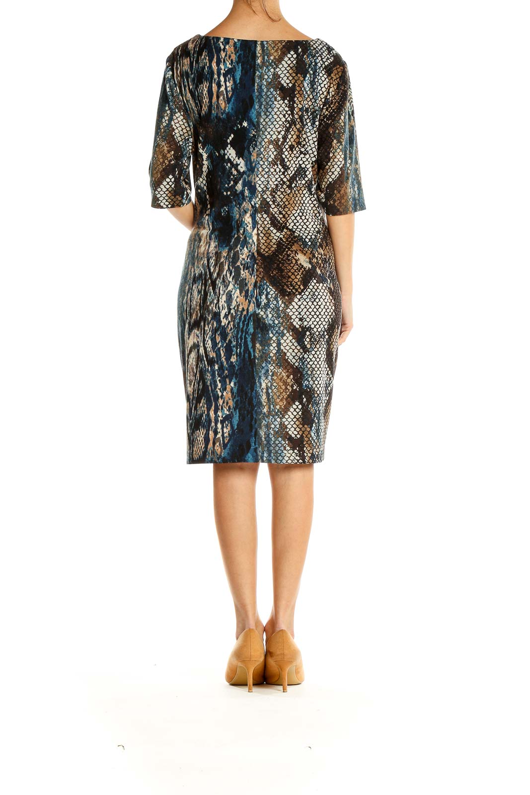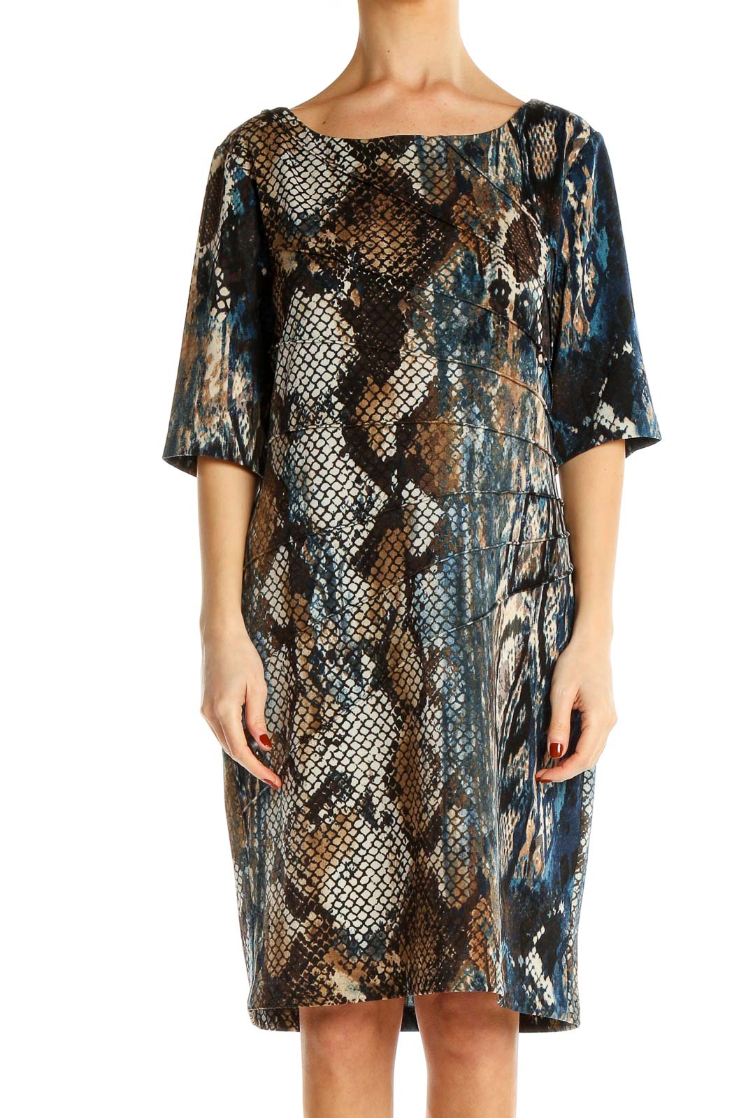 Make a statement with this eye-catching Blue & Brown Snake Print Shift Dress from Connected Apparel. This versatile piece features a captivating reptilian pattern in rich shades of blue, brown, and black, perfect for adding a touch of wild sophistication to your wardrobe. The relaxed shift silhouette offers both comfort and style, making it suitable for various occasions.