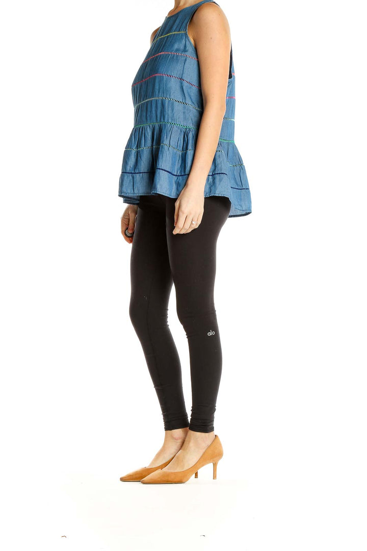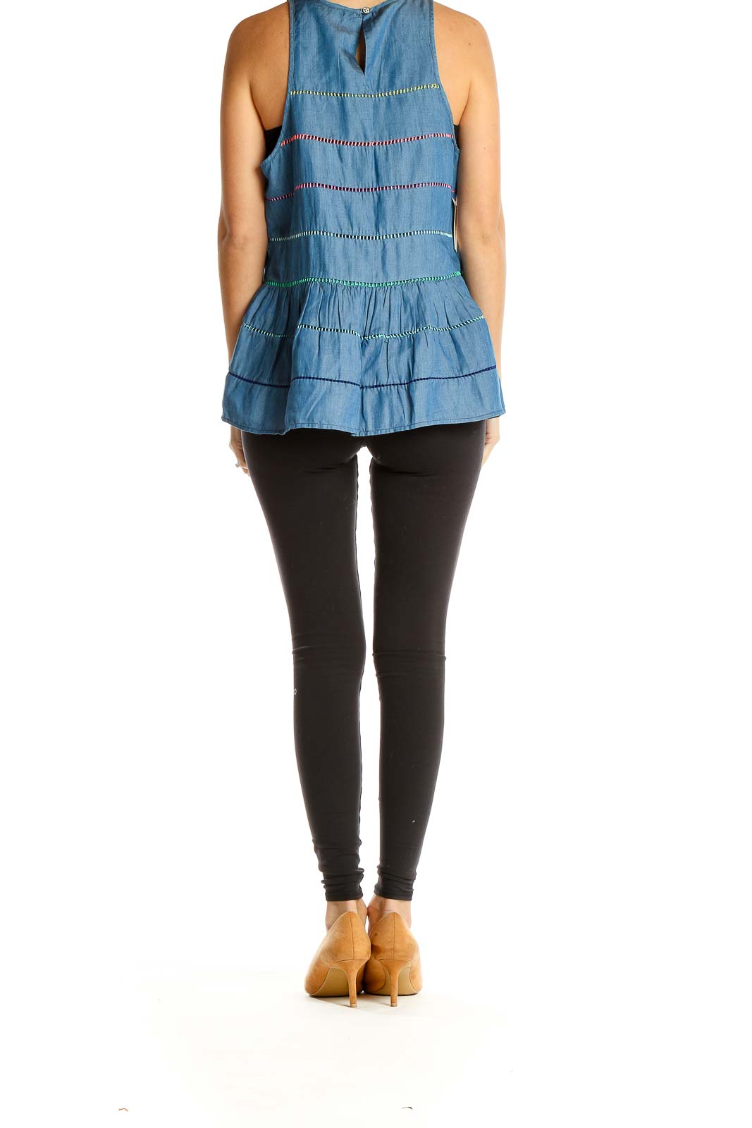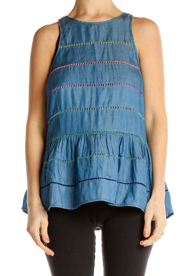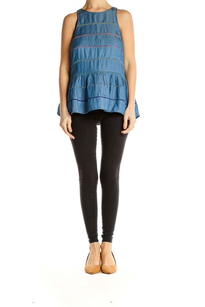 Elevate your casual wardrobe with this charming Blue Tiered Sleeveless Chambray Top from Crown & Ivy. This breezy top features a unique tiered design with colorful embroidered details, adding a playful touch to the classic chambray fabric. The sleeveless cut and round neckline offer a flattering silhouette, perfect for warm weather or layering.