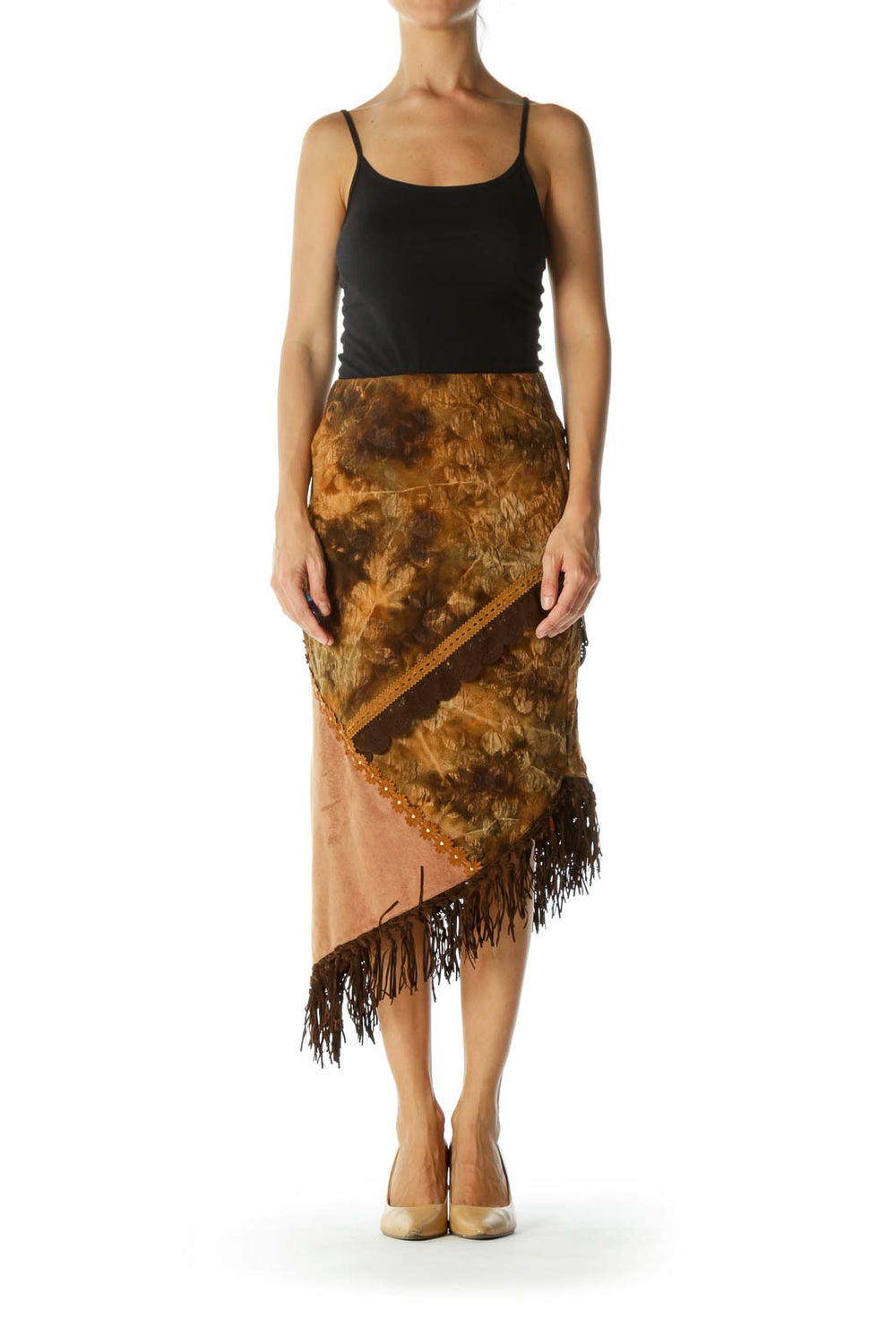 Brown Beige Fringe Floral Jacquard Faux-Suede Mixed-Media Stretch Asymmetrical Skirt