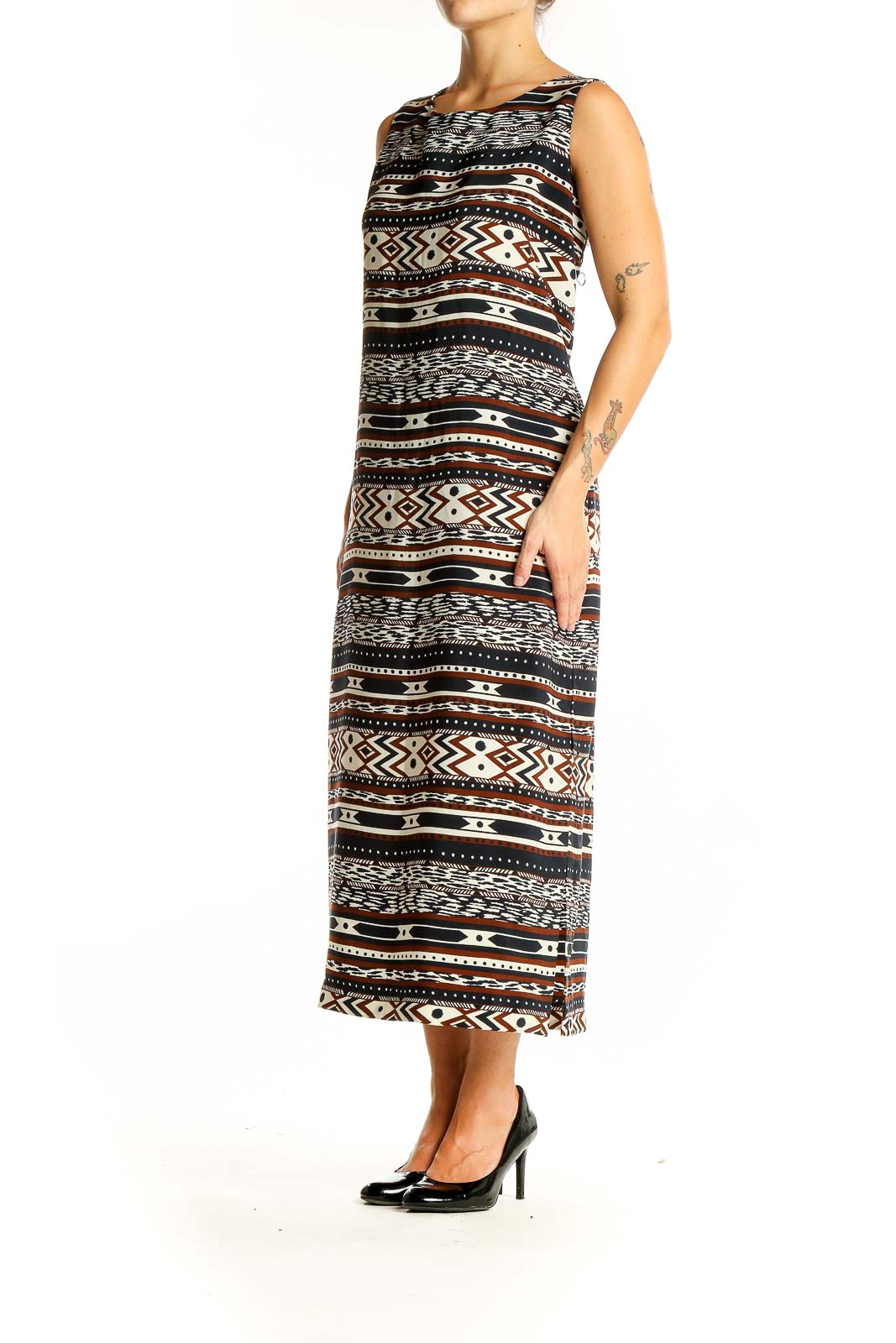 Make a statement with this eye-catching Brown Tribal Print Maxi Dress by Danny & Nicole. This sleeveless dress features a striking geometric pattern in shades of brown, black, and white, creating a bold and stylish look. The polyester fabric ensures comfort and easy care, while the maxi length offers elegant coverage.