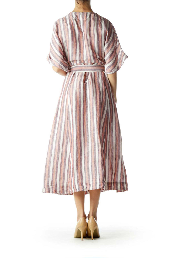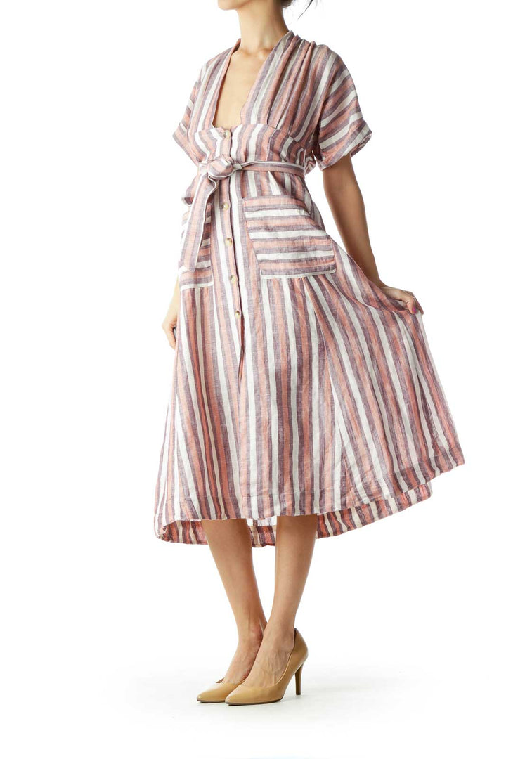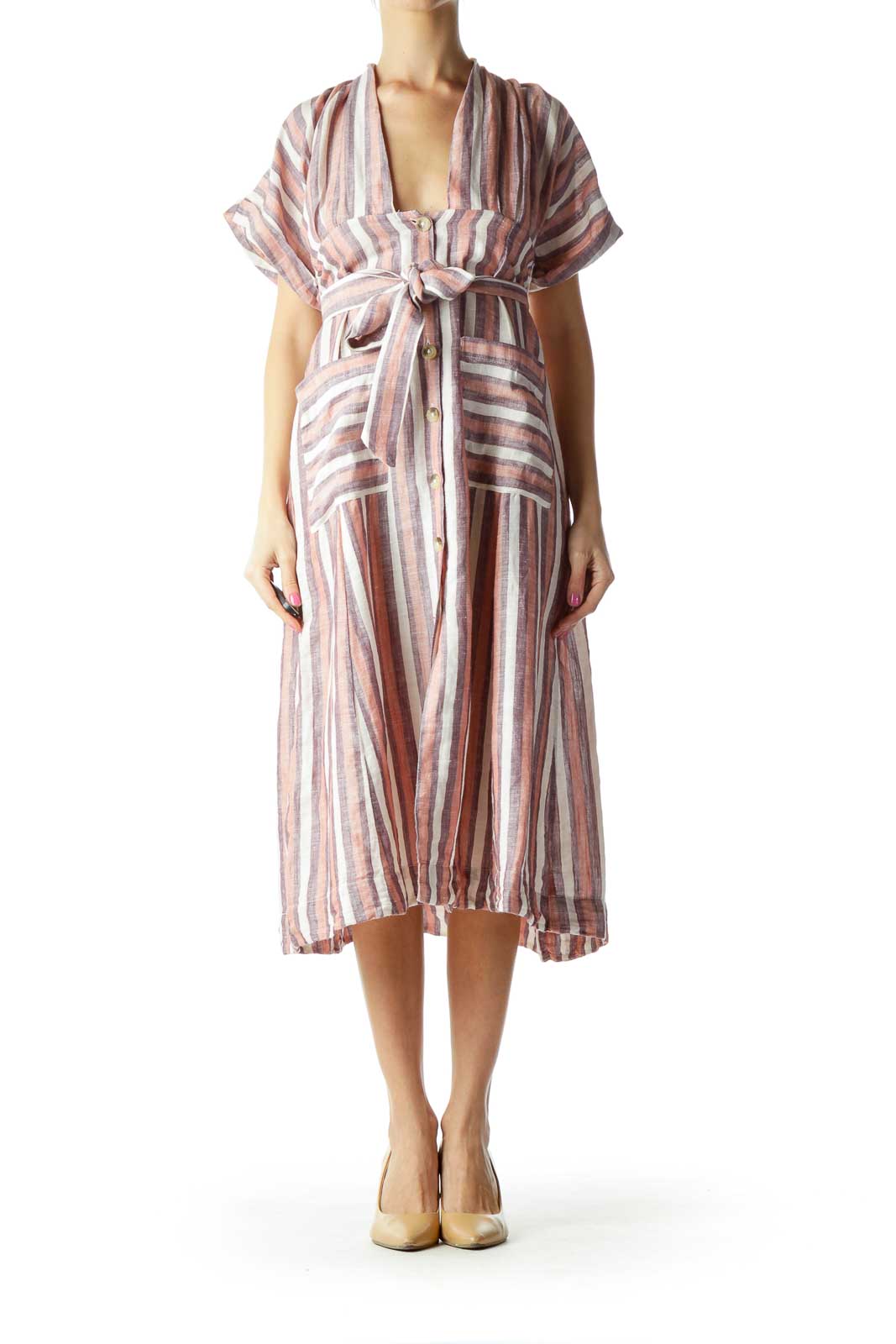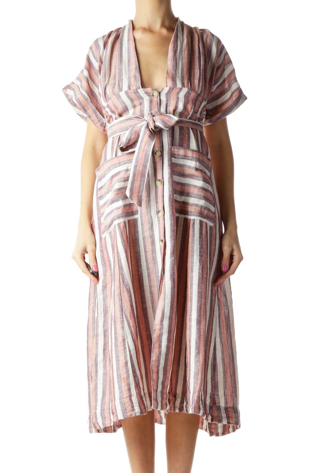 Step into effortless style with this charming pink striped midi dress from Free People. The breezy silhouette features a plunging V-neckline and short kimono-style sleeves, perfect for warm summer days. A button-down front adds a touch of vintage charm, while the tie waist allows for a customizable fit. The dress is adorned with vertical stripes in shades of pink, white, and gray, creating a flattering and elongating effect. Made from a lightweight fabric, this dress offers both comfort and elegance. In excellent condition, it's an ideal choice for casual outings or dressed up for special occasions. The midi length and flowy skirt provide graceful movement with every step. Pair with sandals for a day look or dress it up with heels for an evening out.