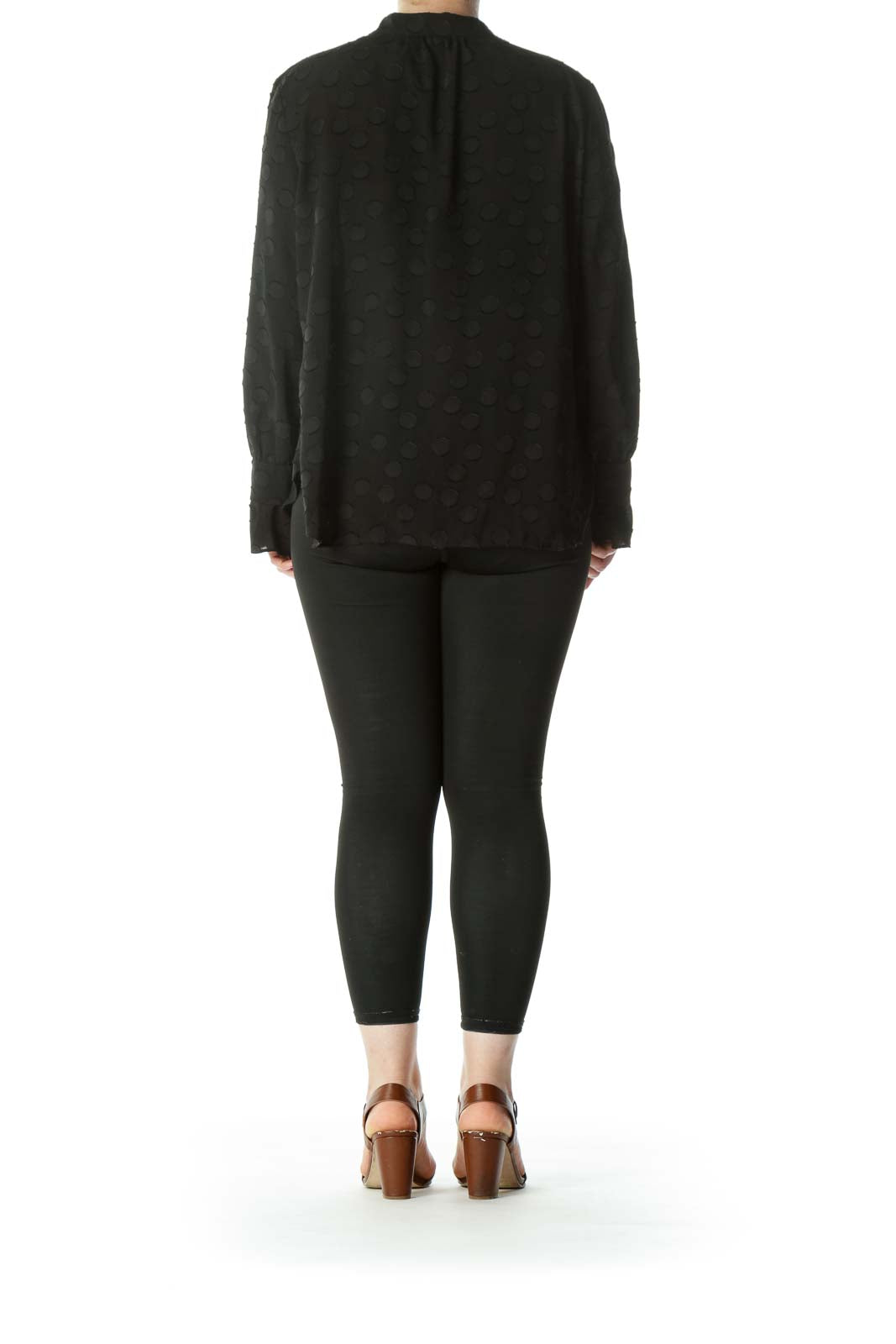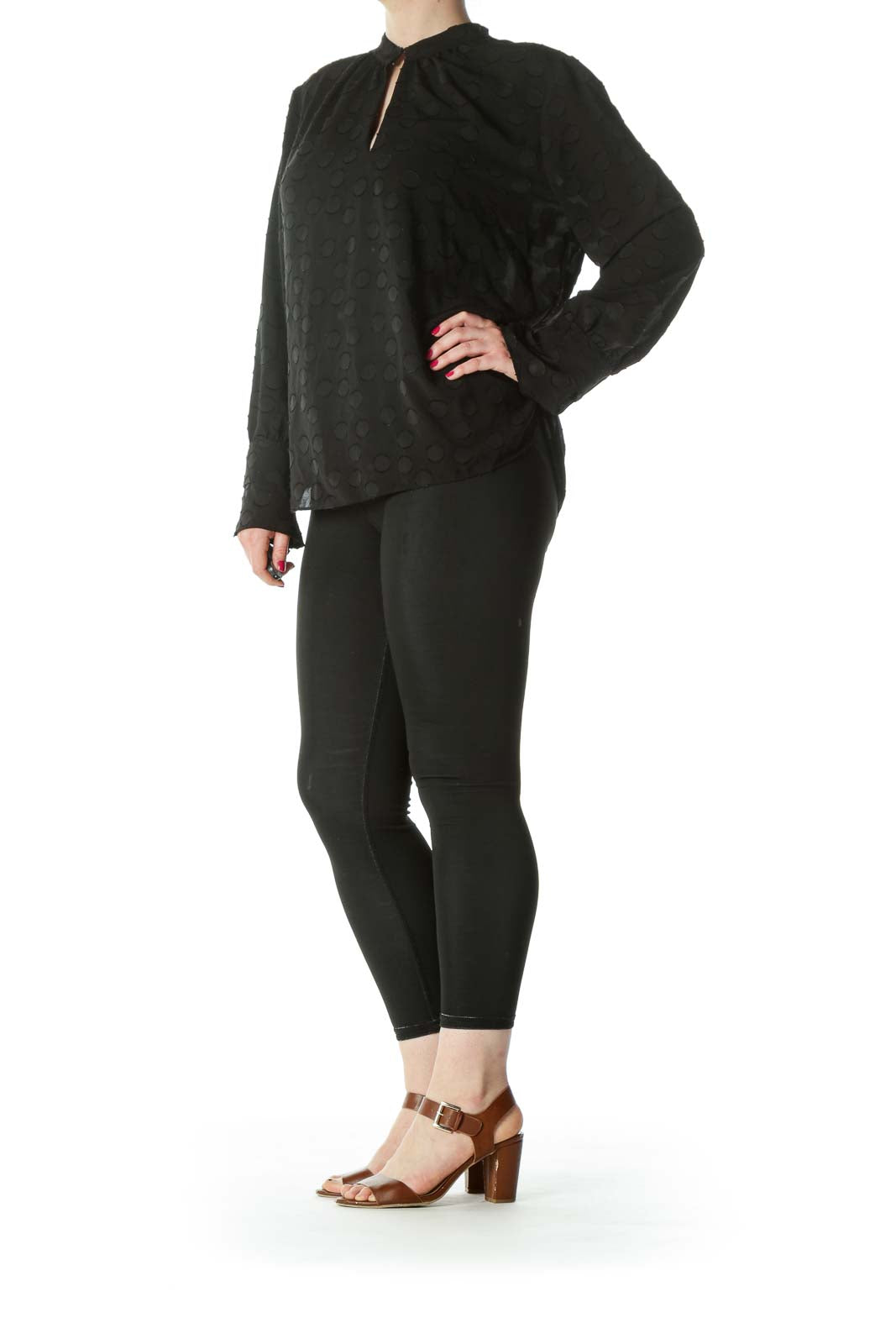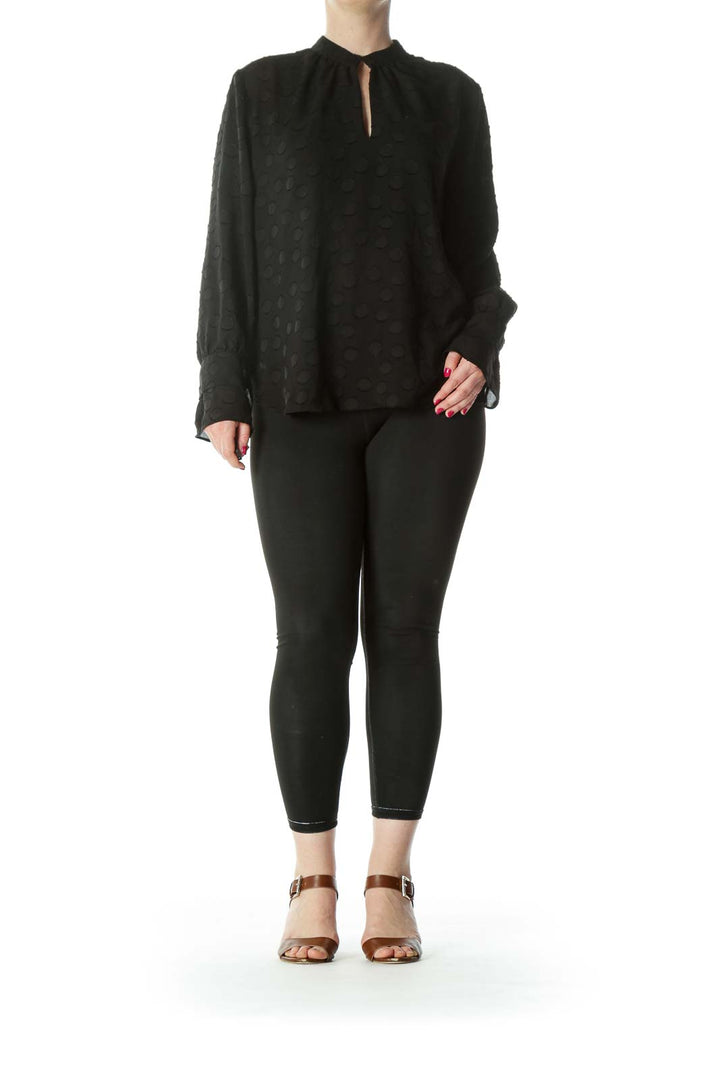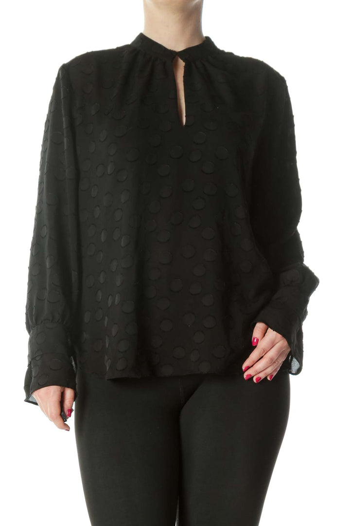 Black Keyhole Circles-Textured-Appliques High-Neck Long-Sleeve Blouse