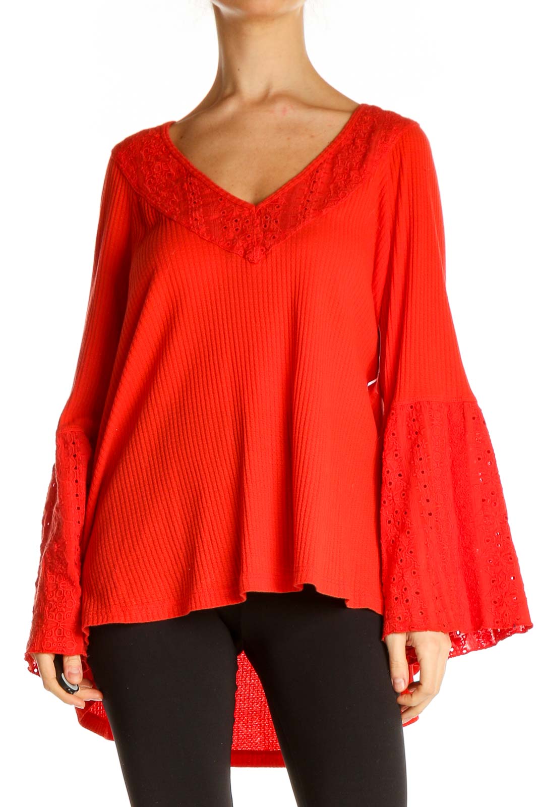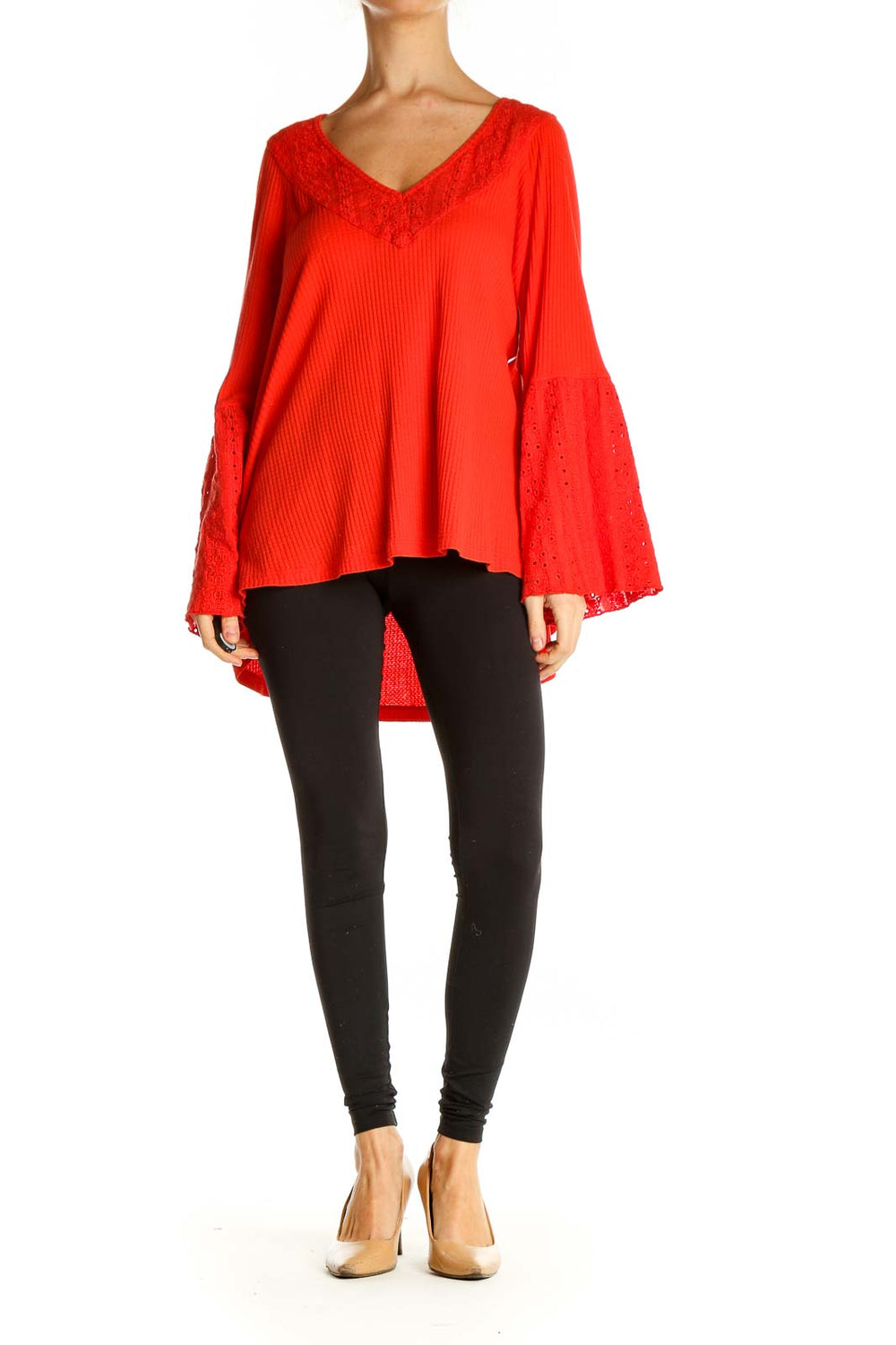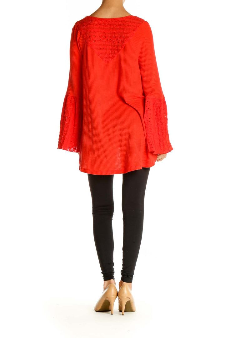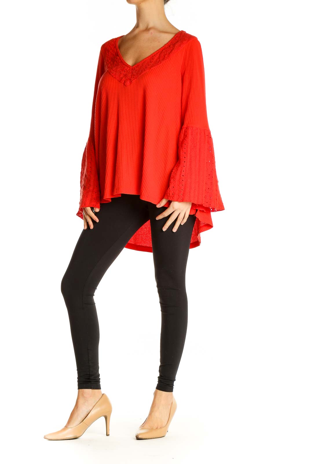 Make a bold statement with this stunning red tunic top from Free People. Crafted with a flowy silhouette, this eye-catching piece features a flattering V-neckline adorned with delicate lace trim. The standout element is the dramatic bell sleeves, also embellished with intricate lace detailing, adding a touch of bohemian elegance to your outfit.