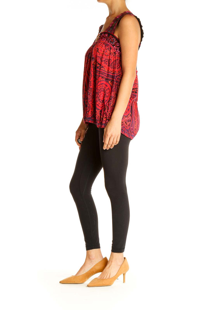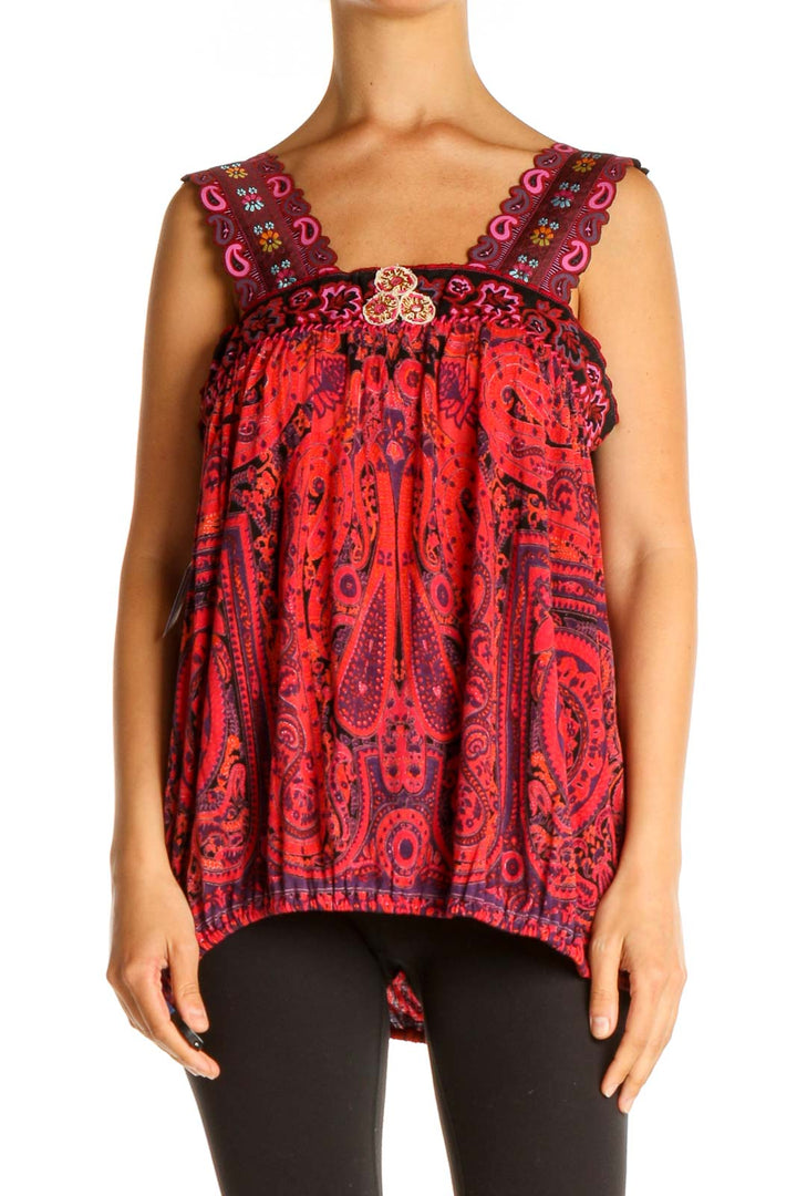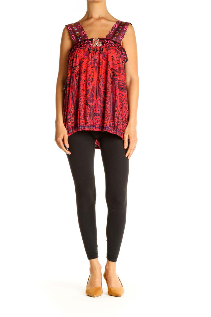 Make a statement with this vibrant red paisley tank top from Free People. The eye-catching design features an intricate paisley print in shades of red and purple, creating a bold and bohemian look. Delicate embellishments adorn the wide shoulder straps, adding a touch of glamour to this casual piece.