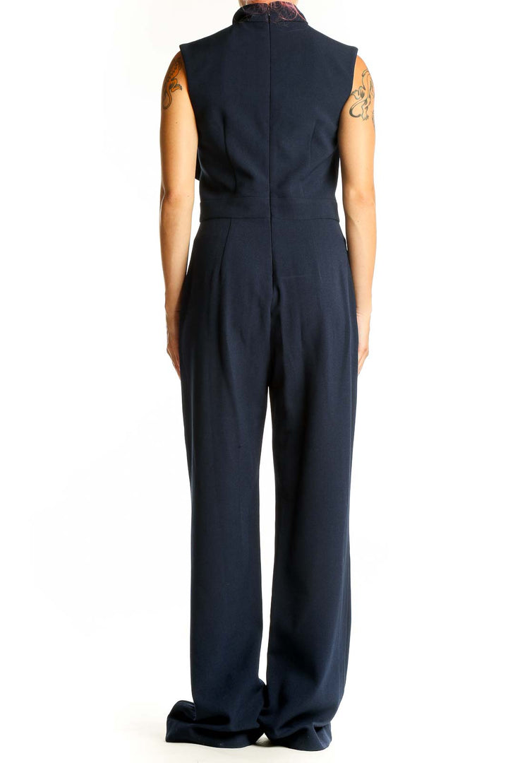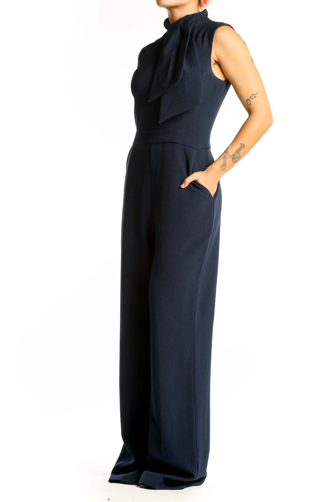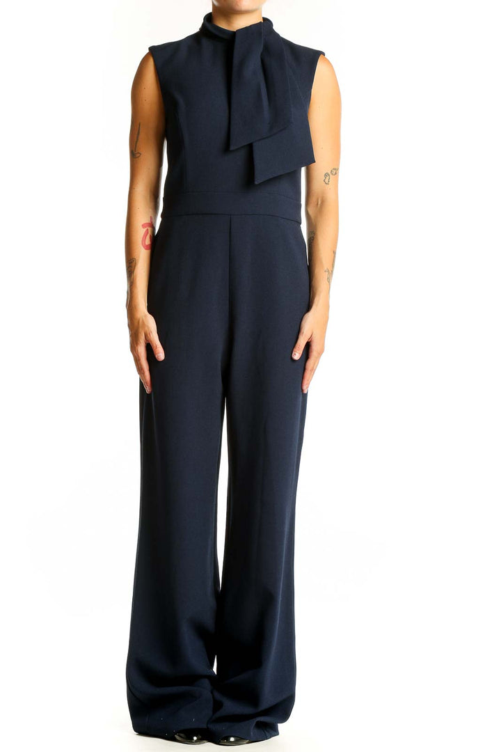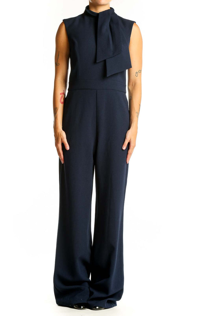 Make a statement with this sophisticated navy jumpsuit from Harper Rose. Designed for the modern woman, this all-in-one piece features a sleek, sleeveless silhouette that exudes confidence and style. The high neck is adorned with a graceful draped detail, adding a touch of elegance to the overall look.