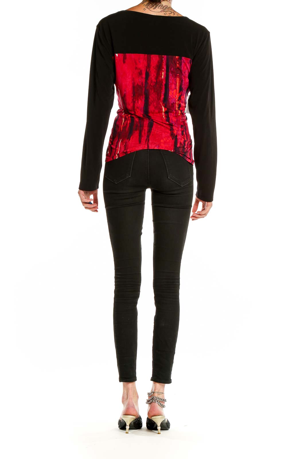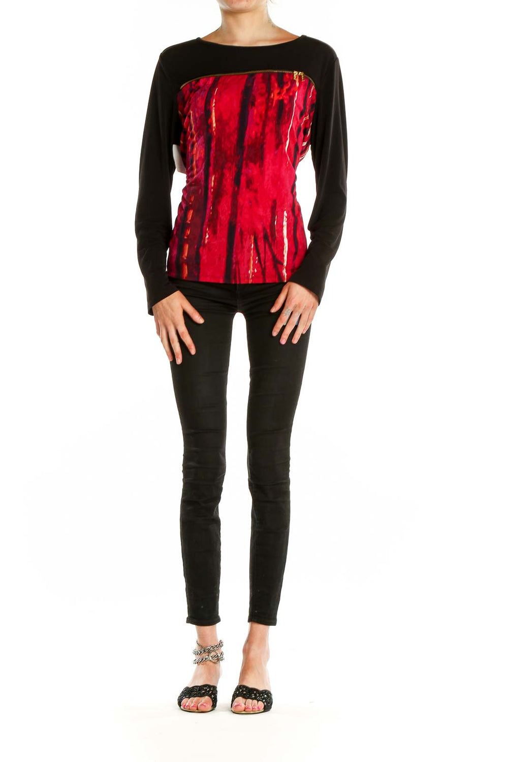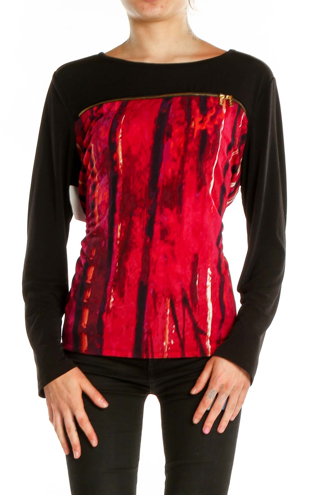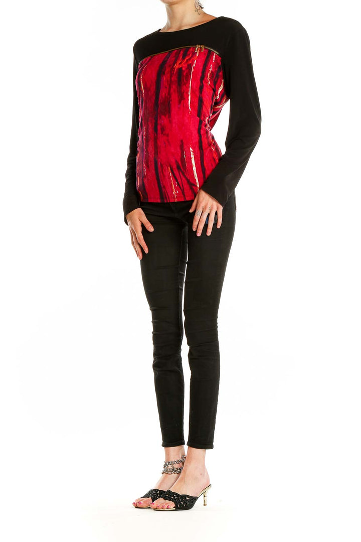 Make a bold statement with this eye-catching Calvin Klein top. The vibrant red abstract print on the front panel creates a striking contrast against the solid black long sleeves and back. Crafted from a soft, stretchy fabric, this top offers both comfort and style. The boat neckline adds a touch of elegance, while the relaxed fit through the body ensures ease of movement. Perfect for both casual outings and dressier occasions, this versatile piece can be easily paired with your favorite jeans or dressed up with a sleek skirt. In excellent condition, this size Large top features a generous cut with a 40" bust, 38" waist, and 25" length, making it ideal for a range of body types. Elevate your wardrobe with this unique and fashionable Calvin Klein creation.