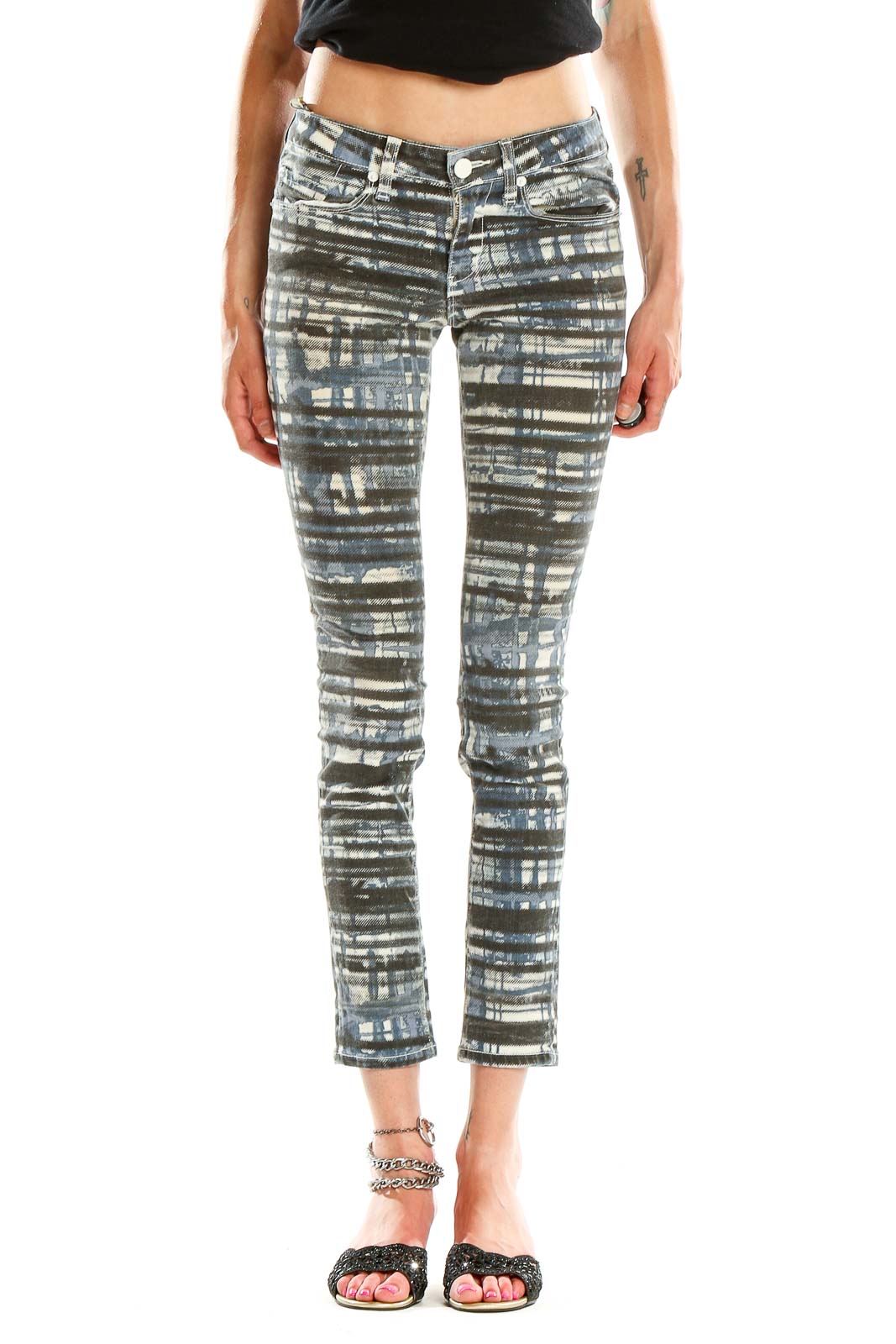 Make a bold statement with these eye-catching David Kahn skinny jeans. Featuring a unique blue and gray striped pattern, these denim pants offer a modern twist on classic jeans. The slim fit hugs your curves, while the cropped length adds a touch of contemporary style. Made from a comfortable and durable denim fabric, these jeans are perfect for all-day wear. The good condition ensures you'll look fresh and stylish. With a 27-inch waist and 27-inch length, these size Small jeans are ideal for a sleek, fitted look. The 30-inch hip measurement provides a flattering silhouette. Elevate your casual wardrobe with these distinctive David Kahn skinny jeans.