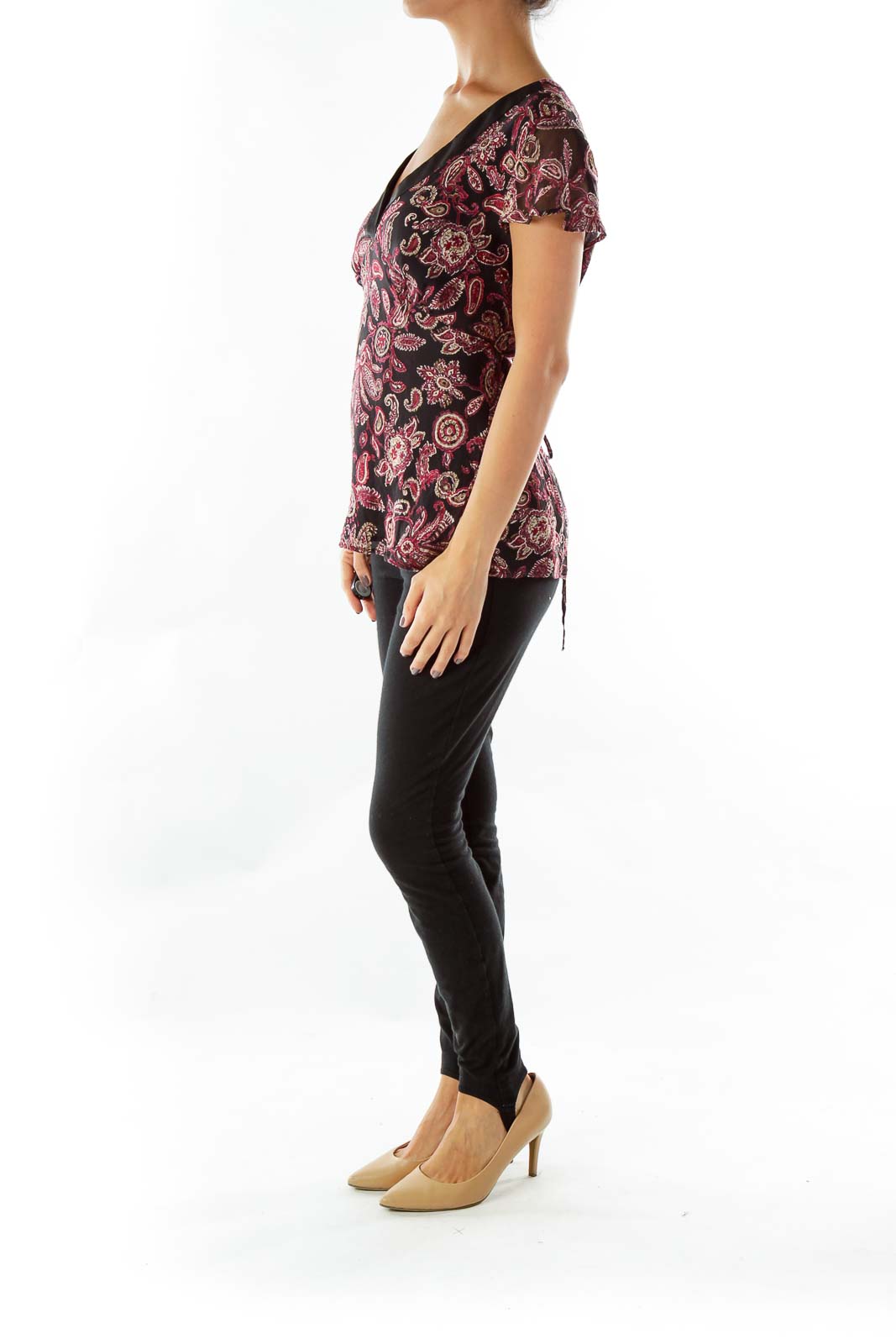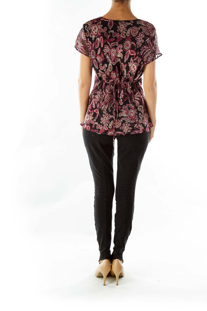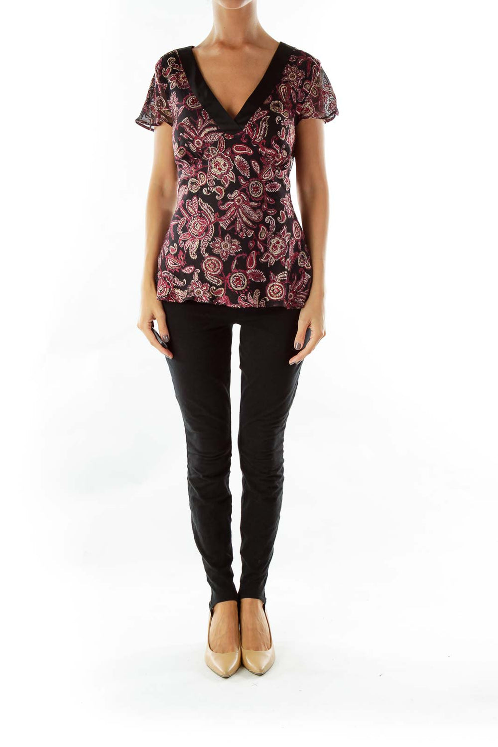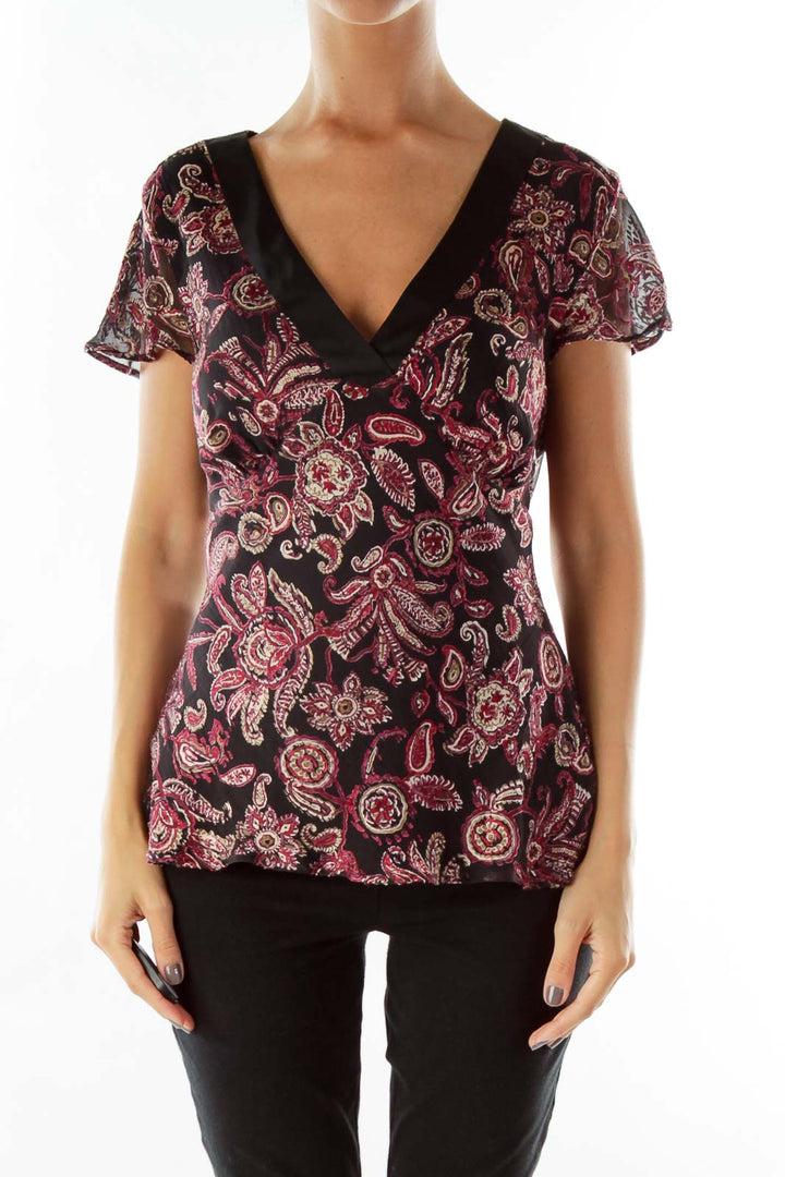 Black Petite Pink Velvet Pattern V-neck Blouse