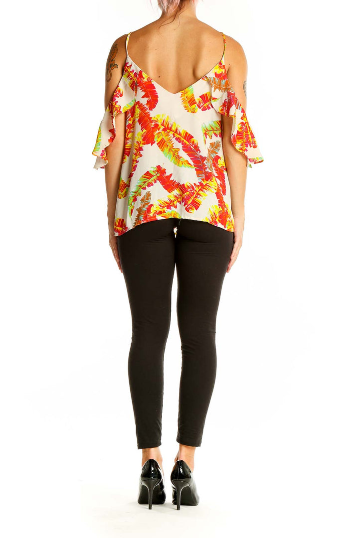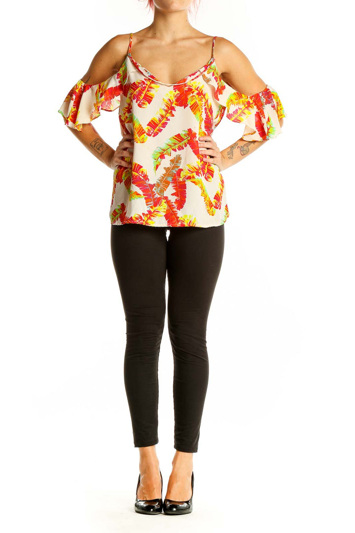 Make a vibrant statement with this eye-catching Tropical Floral Cold-Shoulder Camisole by Collective Concepts. The striking print features bold red, yellow, and green palm leaf motifs on a crisp white background, perfect for adding a pop of color to your summer wardrobe. The flowy polyester fabric ensures comfort and easy care, while the cold-shoulder design with ruffled sleeves adds a trendy, feminine touch. The spaghetti straps and relaxed fit through the body create a flattering silhouette suitable for various body types. In excellent condition, this versatile top can be dressed up or down for multiple occasions, from beach outings to casual dinners. With its eye-catching design and comfortable fit, this camisole is sure to become a go-to piece in your warm-weather rotation.