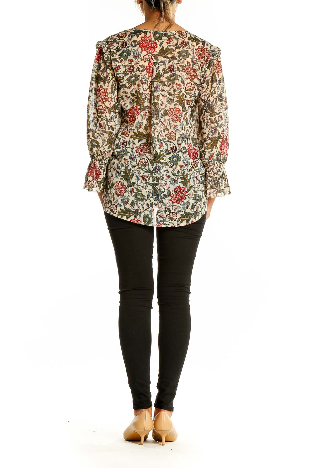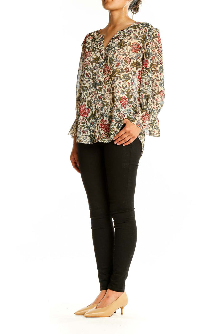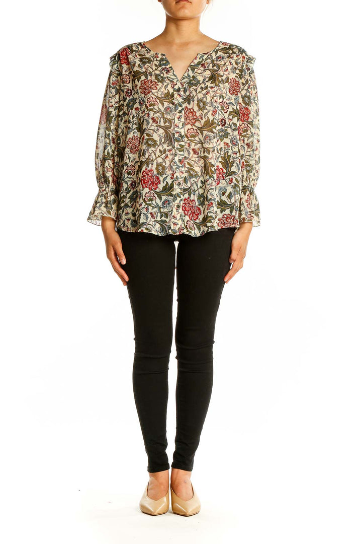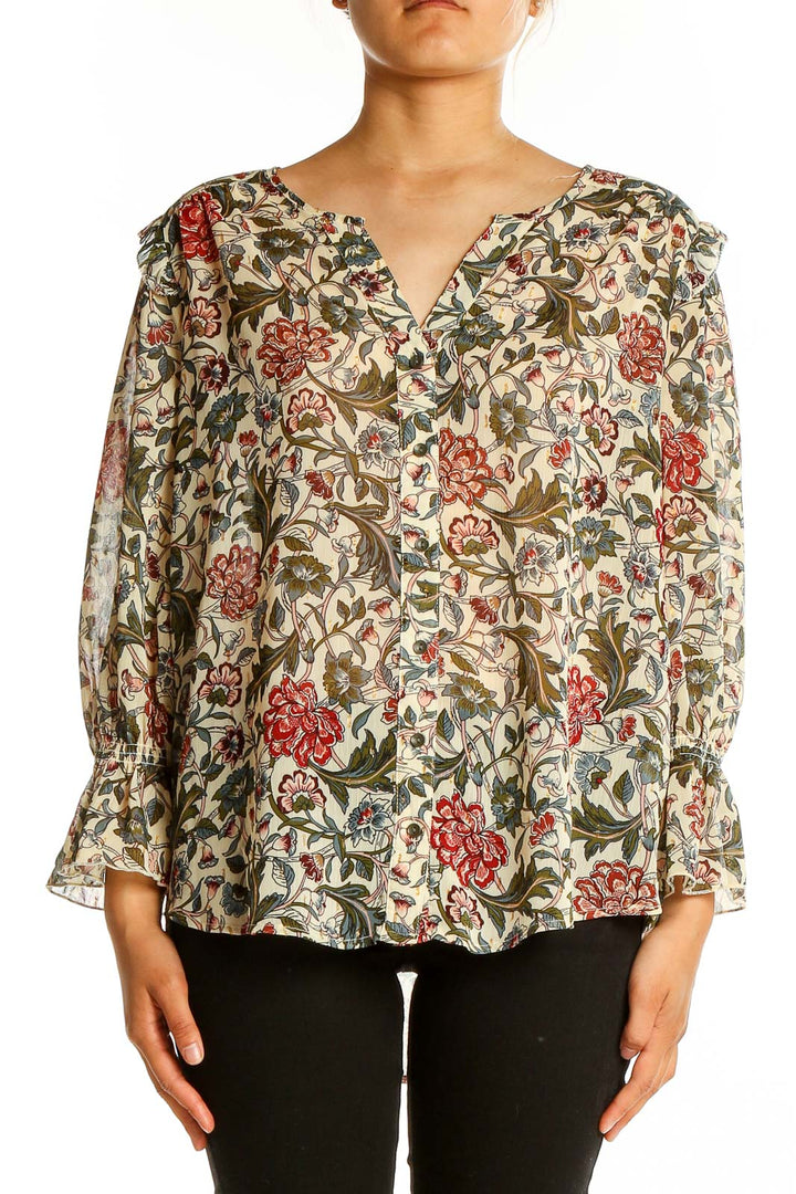 Embrace effortless elegance with this stunning beige floral print blouse by Democracy. Crafted from lightweight polyester, this top features a beautiful all-over floral pattern in shades of red, olive green, and blue, creating a charming vintage-inspired look. The ruffle details along the v-neckline and shoulders add a touch of feminine flair, while the long sleeves with gathered cuffs provide a graceful silhouette. The relaxed fit and flowy fabric make this blouse both comfortable and flattering for various body types. In excellent condition, this versatile piece can easily transition from day to night, pairing perfectly with your favorite jeans or a sleek skirt for a more dressed-up ensemble.