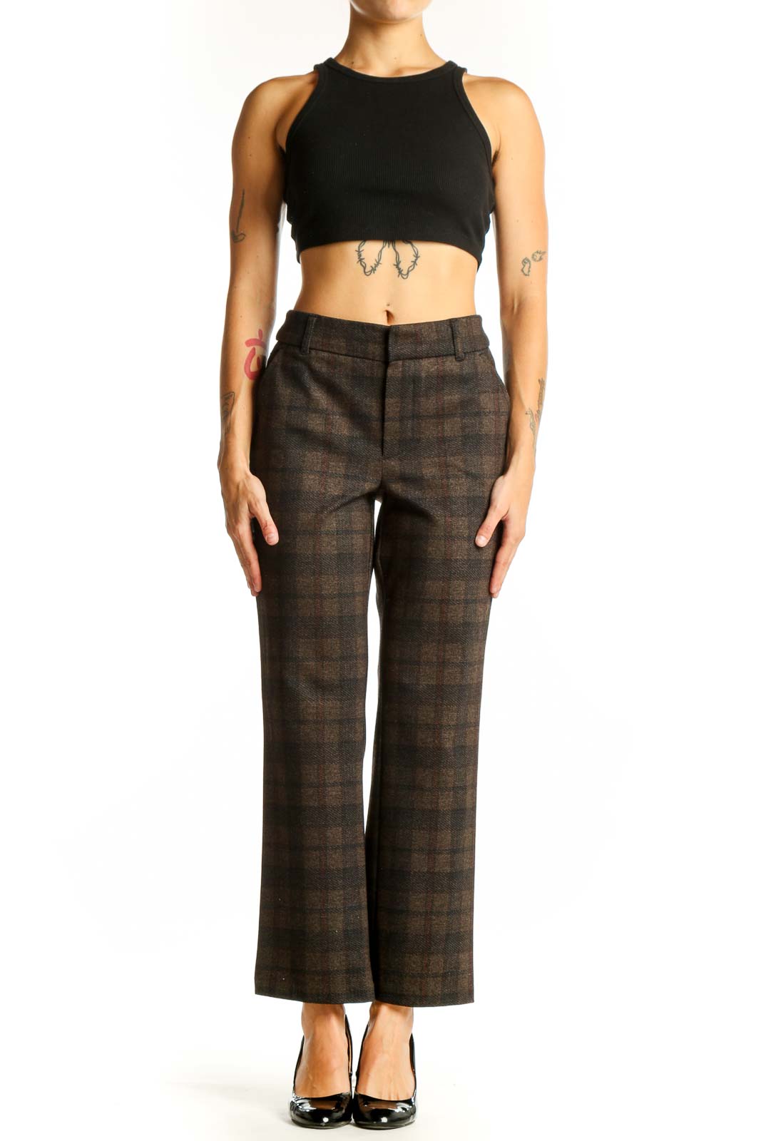 Step into sophistication with these exquisite brown plaid trousers from Democracy. Crafted from a luxurious blend of cotton, rayon, and spandex, these pants offer both comfort and style. The classic plaid pattern in rich earth tones adds a touch of timeless elegance to your wardrobe. With a flattering straight-leg cut and a mid-rise waist, these trousers are designed to complement various body types. The excellent condition speaks to their quality and durability. Featuring practical side pockets and a sleek flat front, these pants are perfect for both office wear and casual outings. The versatile 35" length allows for easy pairing with your favorite heels or flats. Embrace the perfect balance of comfort and chic with these must-have plaid trousers.