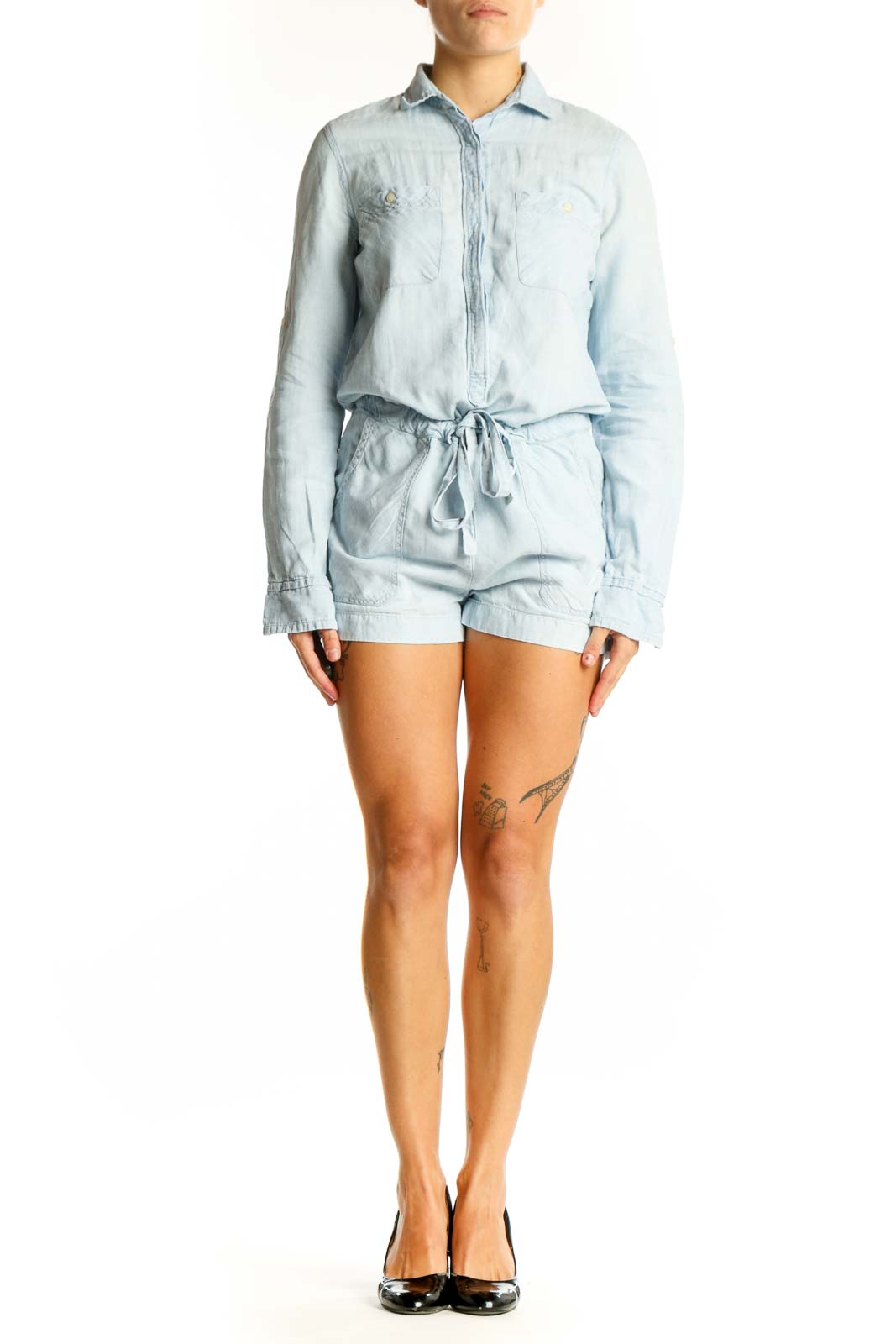 Step into effortless style with this light blue cotton-linen romper from Denim Supply by Ralph Lauren. This all-in-one piece combines comfort and chic design, perfect for casual outings or relaxed weekends. The soft, breathable fabric blend ensures all-day comfort, while the drawstring waist allows for a customizable fit. Front pockets add practicality to this already versatile garment. The button-up front and collared neckline give a classic shirt-inspired touch to this modern silhouette. In excellent condition, this romper is a must-have addition to your summer wardrobe.