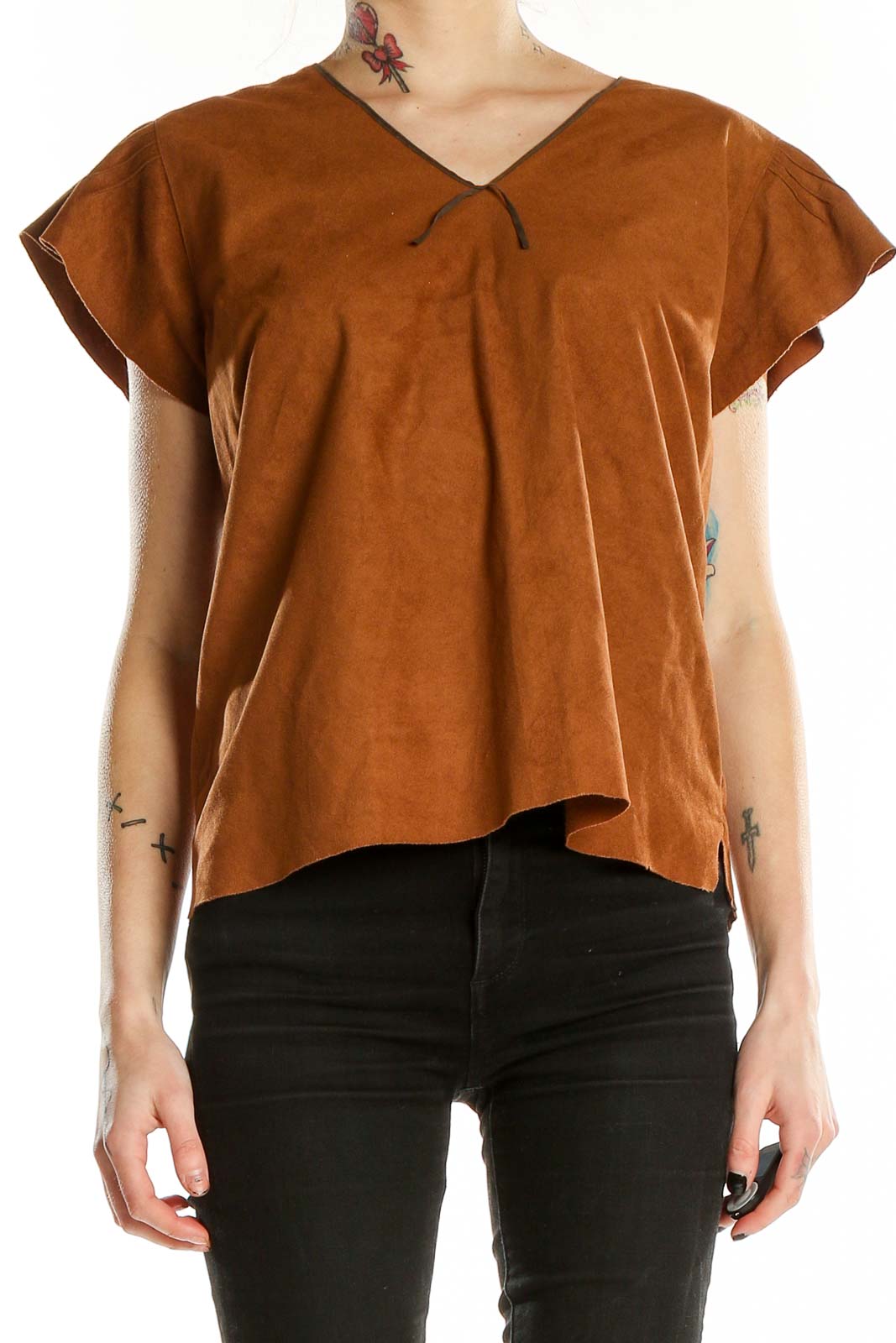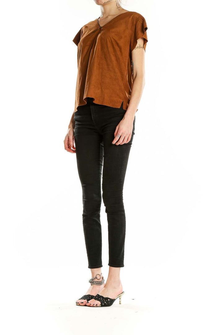 Elevate your casual wardrobe with this stunning rust-colored suede top from Uniform / John Paul Richard. The luxurious polyester fabric mimics the look and feel of suede, offering a touch of elegance to your everyday style. Featuring a flattering V-neckline and charming flutter sleeves, this top strikes the perfect balance between comfort and sophistication.