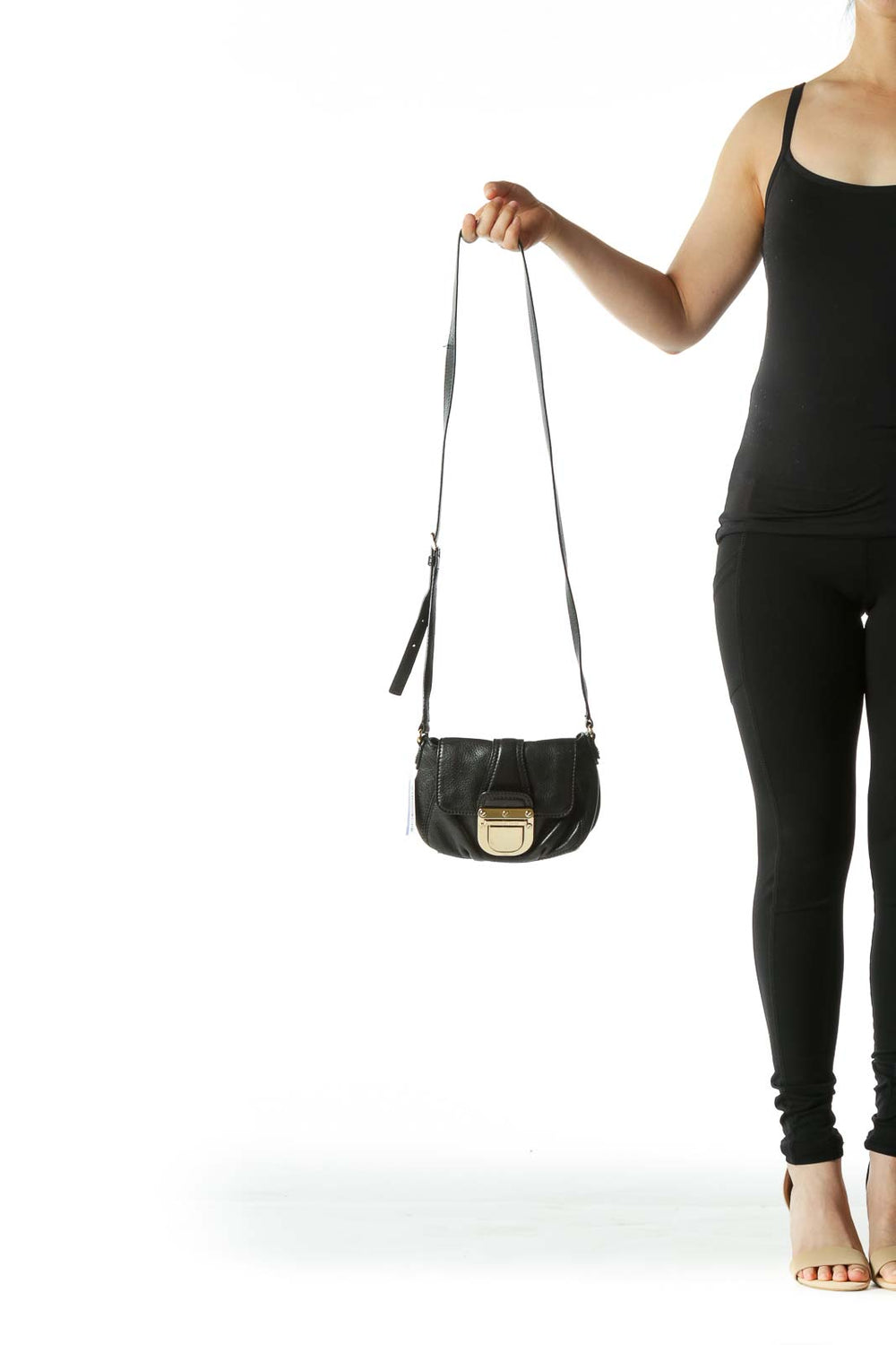 Black Small Leather Cross-Body Bag with Gold Push Button Clasp Closure