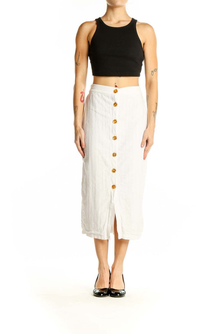 Elevate your summer wardrobe with this chic white cotton midi skirt from DL1961. Featuring a stylish button-front design, this skirt offers both elegance and versatility. The lightweight cotton fabric ensures breathability and comfort, perfect for warm weather outings.