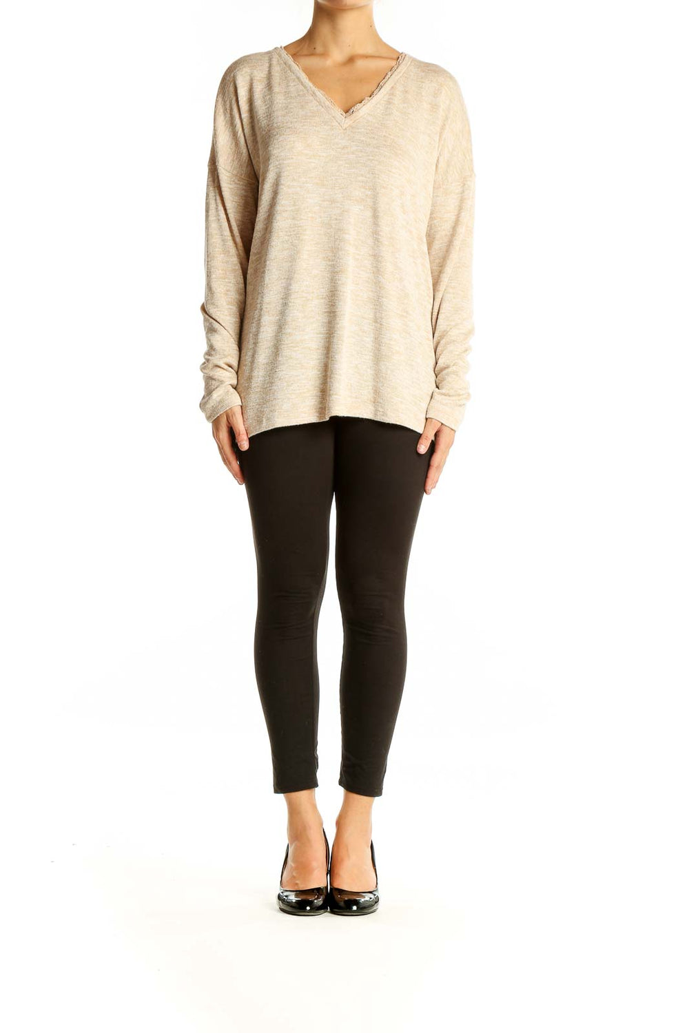 Elevate your casual wardrobe with this sophisticated beige V-neck sweater from Doe & Rae. Crafted from a soft blend of polyester and rayon, this knit top offers both comfort and style for everyday wear. The relaxed fit and dropped shoulders create a laid-back silhouette, perfect for pairing with your favorite jeans or leggings.