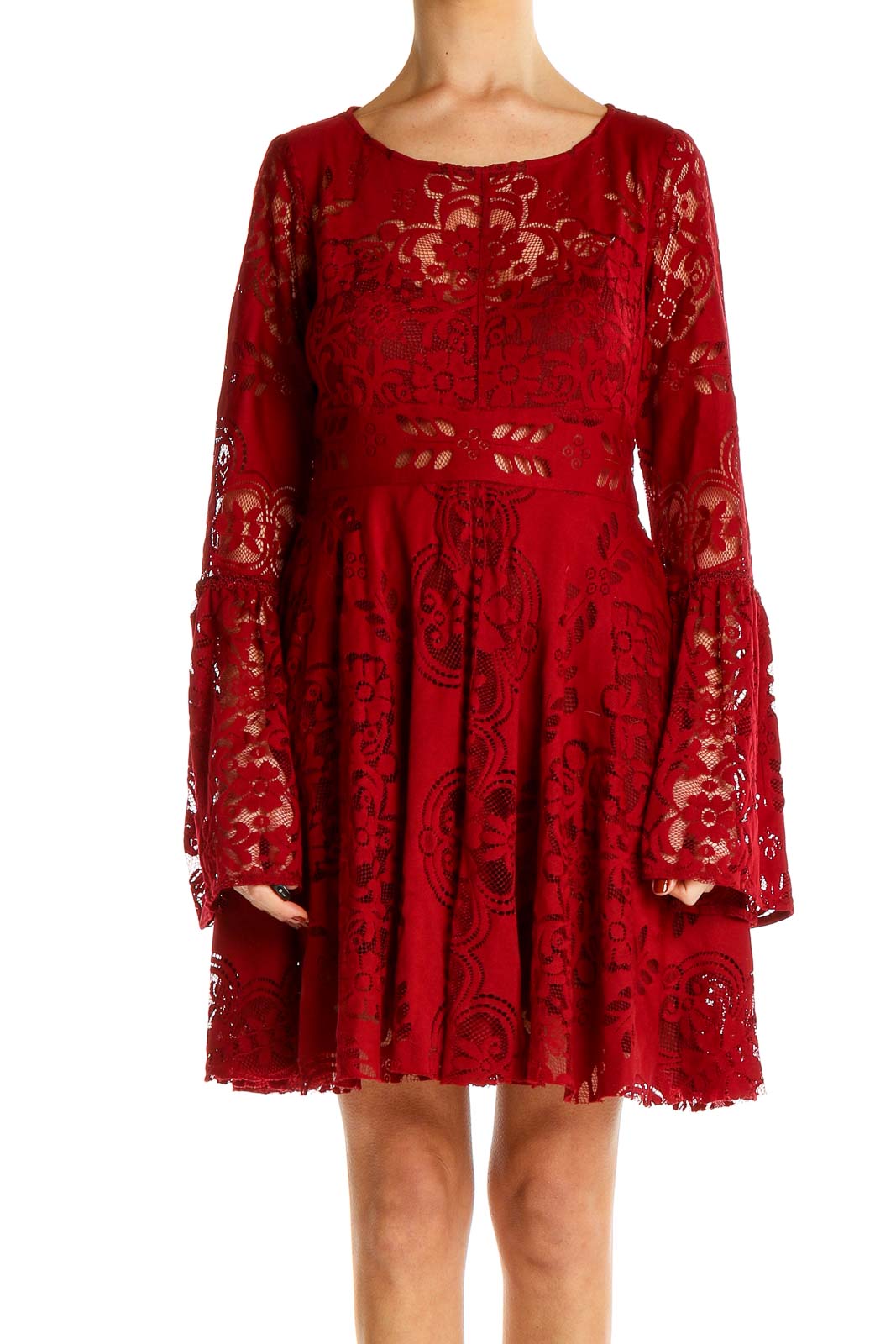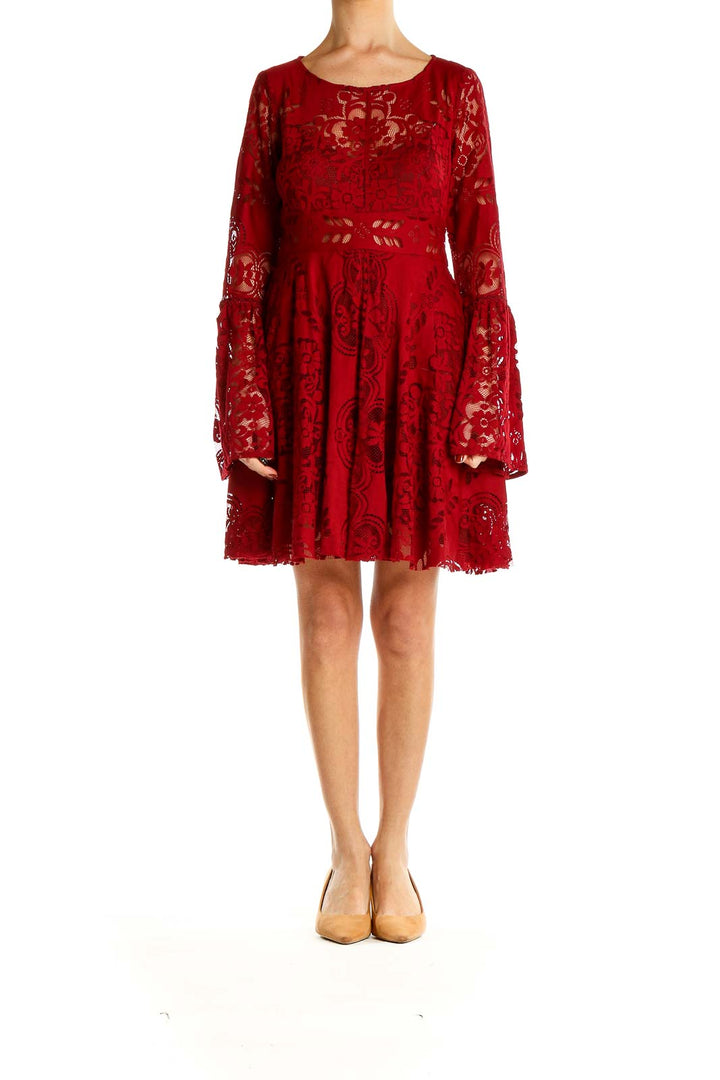 Make a statement in this stunning red lace mini dress from Free People. This eye-catching piece features an intricate all-over lace pattern that adds a touch of romance and elegance. The bell sleeves with scalloped edges create a dramatic, bohemian-inspired silhouette that's perfect for special occasions or a night out.