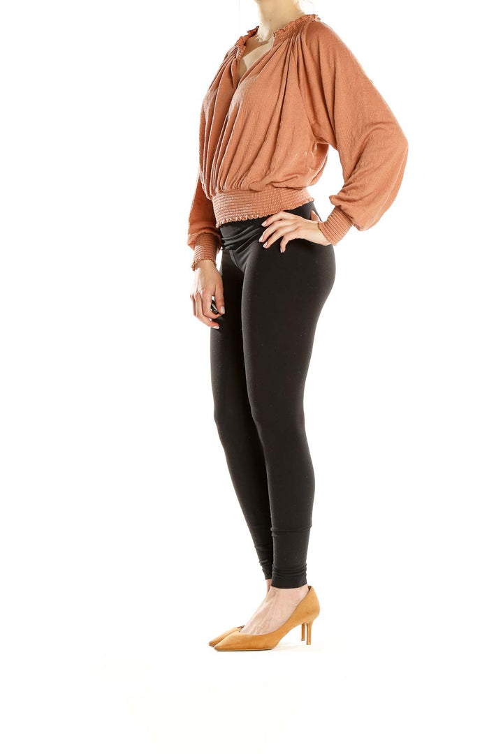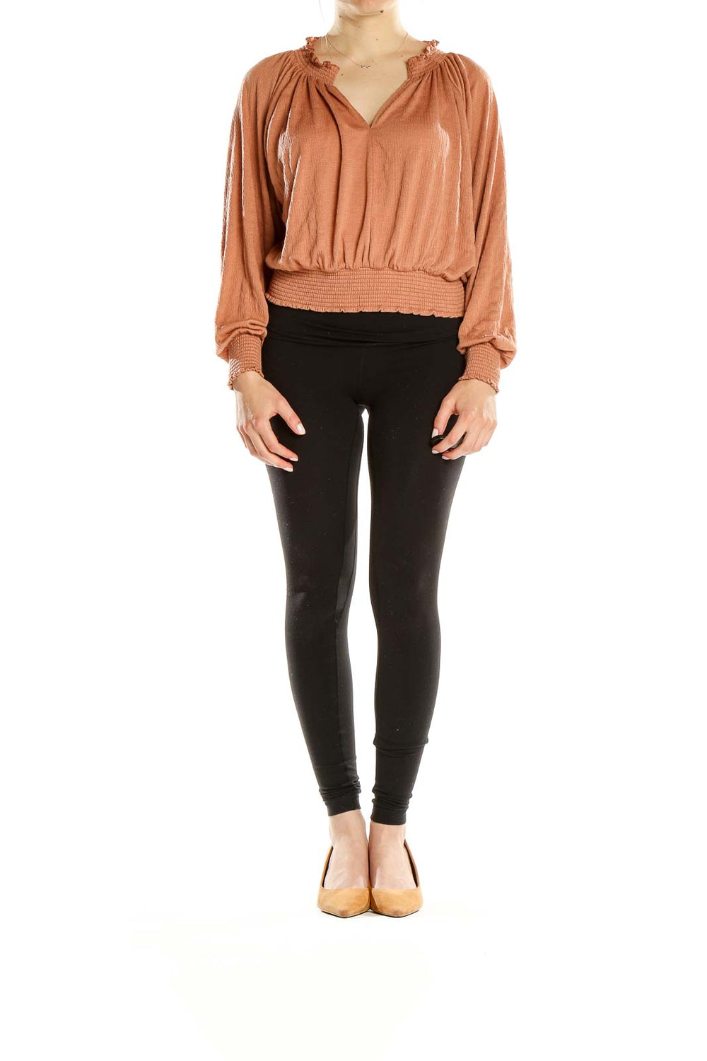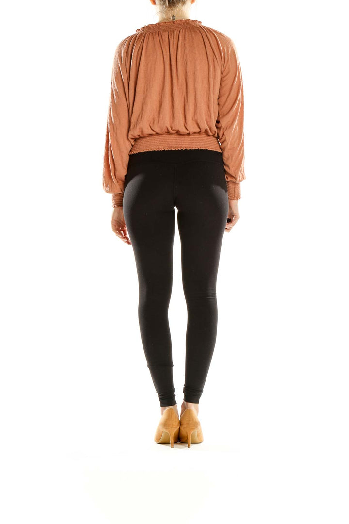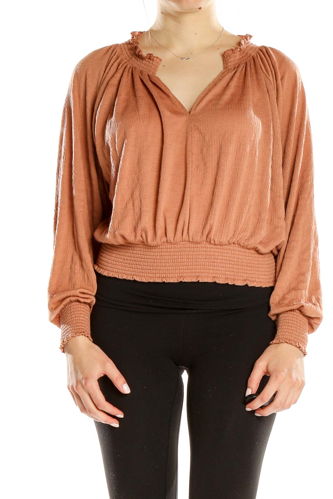 Elevate your casual wardrobe with this charming terracotta peasant blouse by Gentle Fawn. Crafted from a soft and stretchy blend of polyester, rayon, and spandex, this top offers both comfort and style. The smocked waistband creates a flattering silhouette, while the billowy sleeves and gathered neckline add a touch of bohemian flair. Perfect for pairing with your favorite jeans or skirts, this versatile piece transitions effortlessly from day to night. The excellent condition ensures you'll enjoy this beautiful blouse for seasons to come.