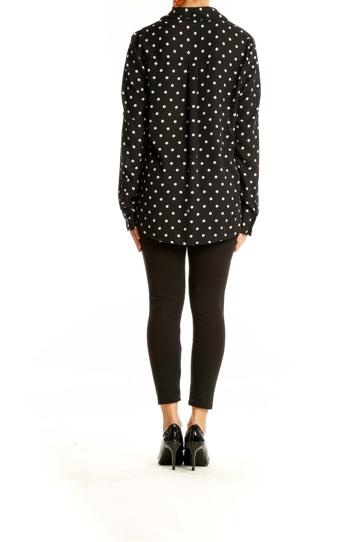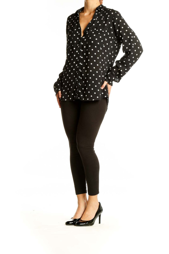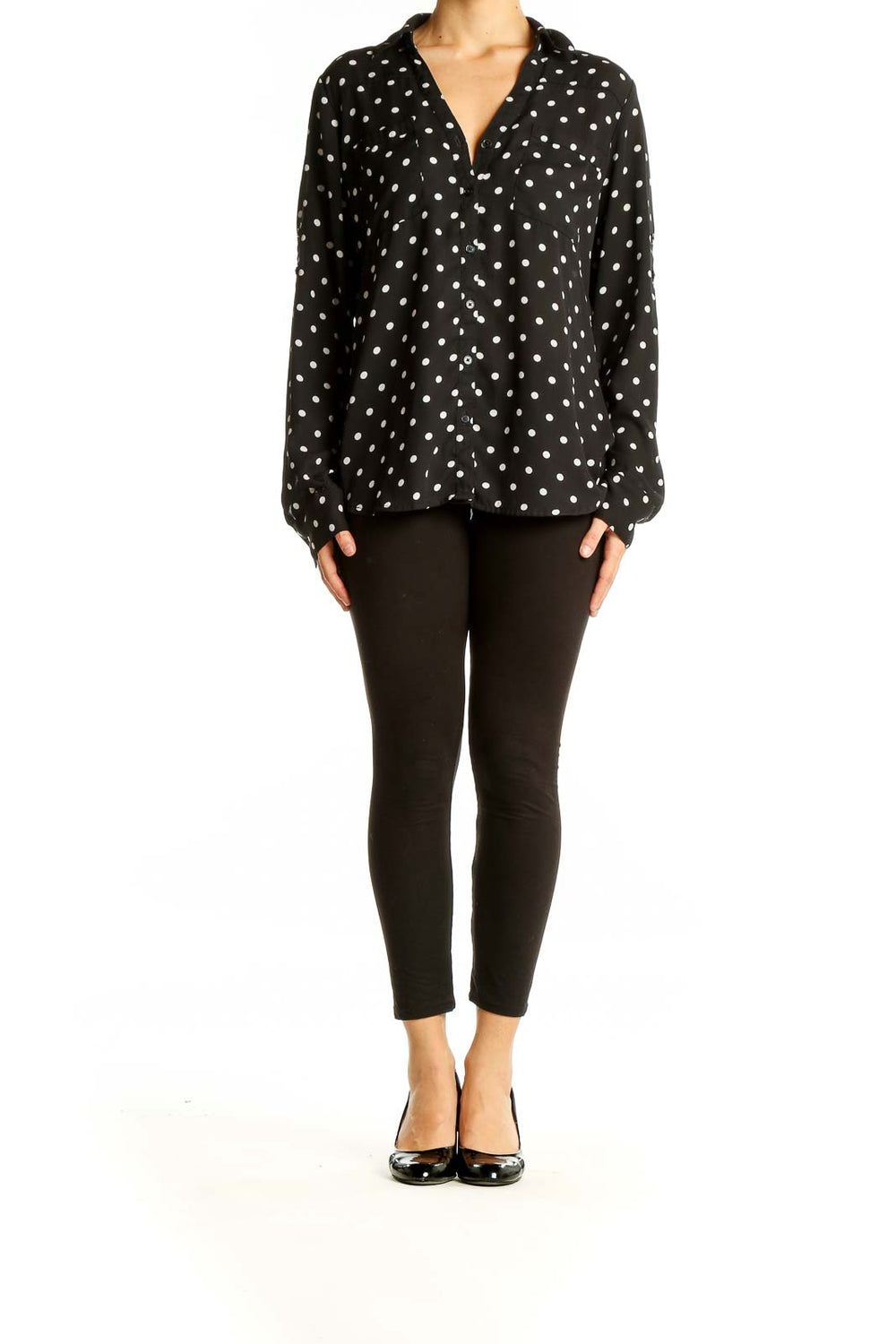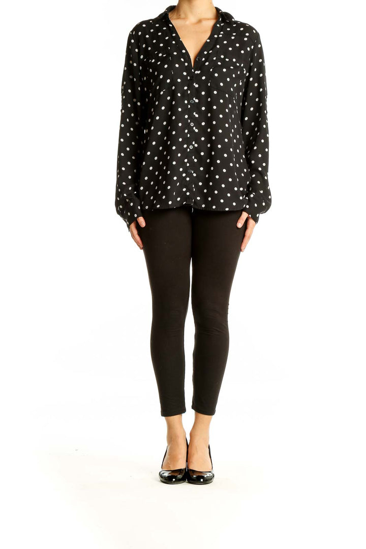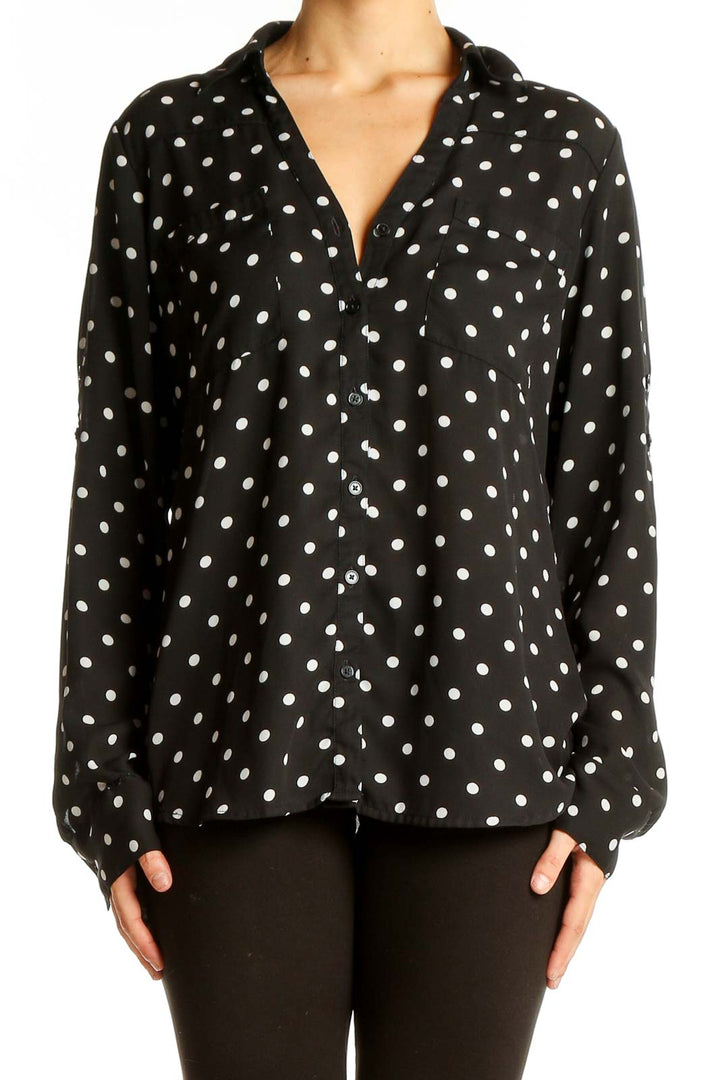 Make a stylish statement with this charming black polka dot blouse from Express. The classic button-up design features a playful white dot pattern that adds a touch of whimsy to your wardrobe. Crafted from soft and lightweight polyester, this top offers both comfort and durability for all-day wear. The relaxed fit and long sleeves make it perfect for layering or wearing on its own. With a flattering v-neckline and a versatile silhouette, this blouse easily transitions from office to evening. In excellent condition, this Express top is a must-have addition to your collection of chic essentials.
