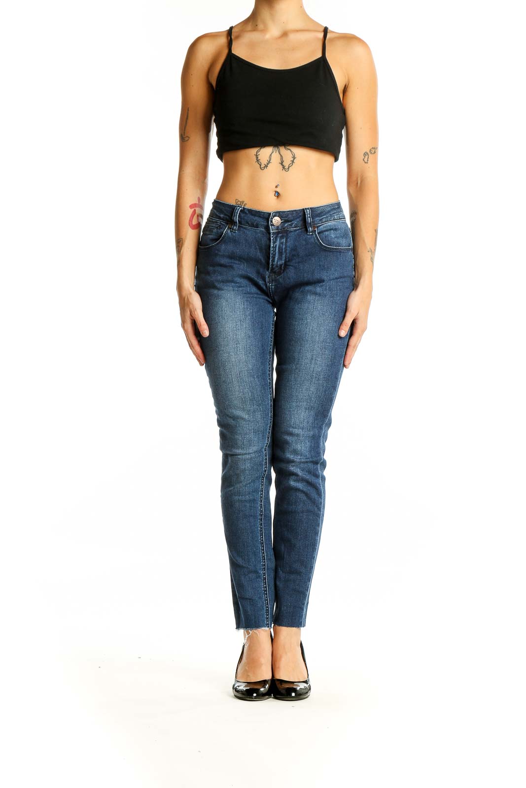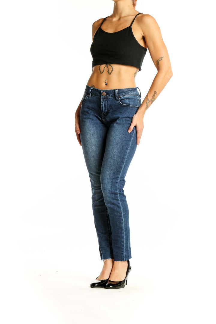 These jeans feature a classic five-pocket design and a versatile medium wash that pairs effortlessly with any top. The raw hem adds a modern touch, perfect for showcasing your favorite shoes. With a waist measurement of 26" and hips of 29", these size Small jeans are ideal for a fitted look.