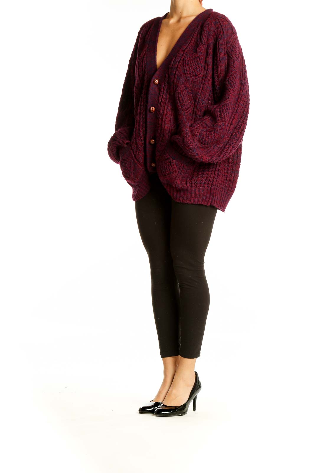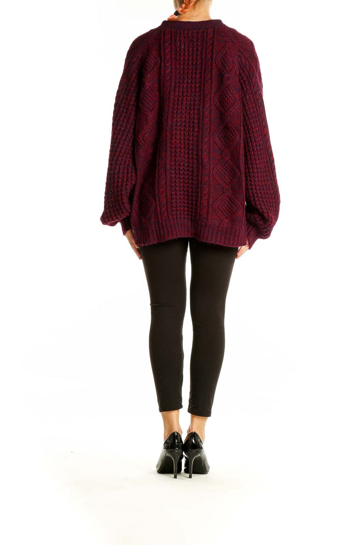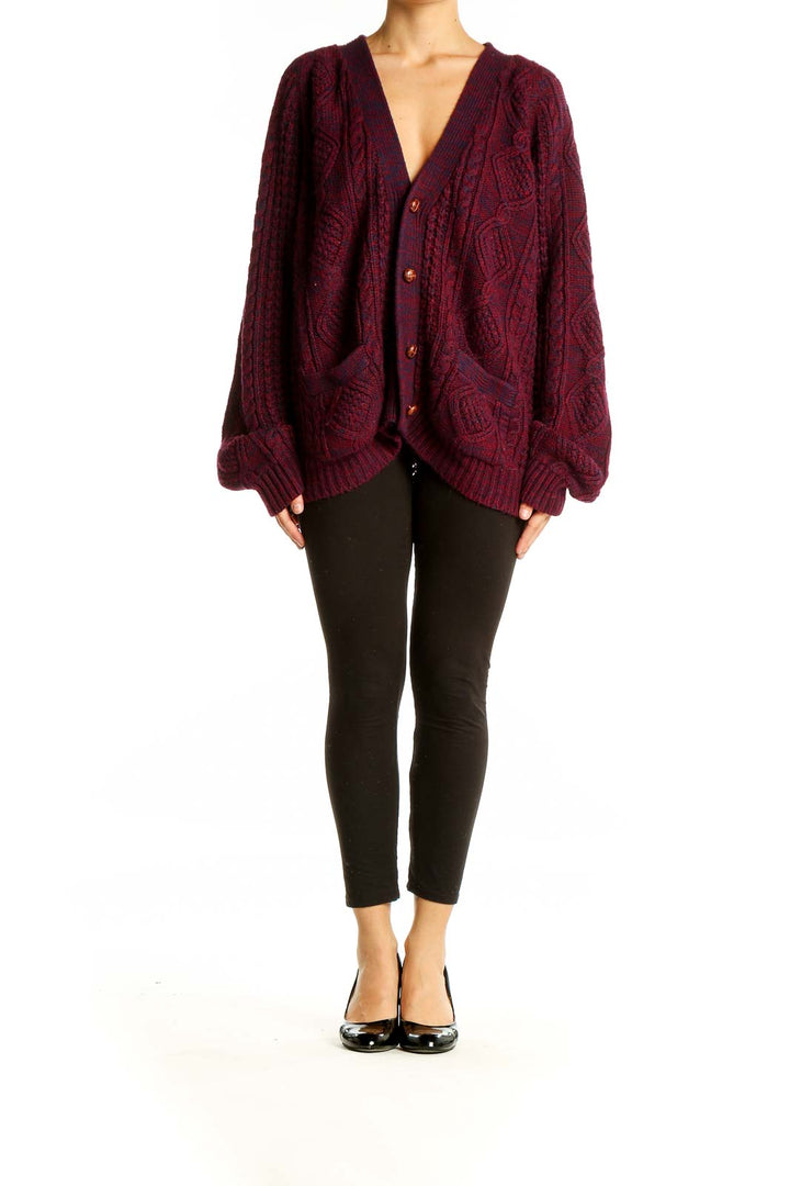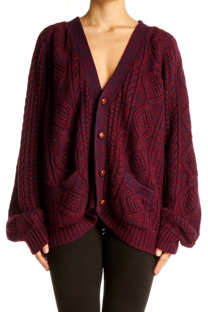Wrap yourself in cozy elegance with this stunning burgundy oversized cable knit cardigan from SilkRoll. Crafted from a luxurious blend of organic and Pima cotton, this cardigan offers both comfort and style. The intricate cable knit pattern adds a touch of sophistication, while the deep V-neck and button-front closure provide versatility in styling. With its generous fit and voluminous balloon sleeves, this cardigan is perfect for layering over your favorite outfits. The rich burgundy hue adds a pop of color to any ensemble, making it a standout piece in your wardrobe. In excellent condition, this cardigan is a testament to quality craftsmanship and timeless design.