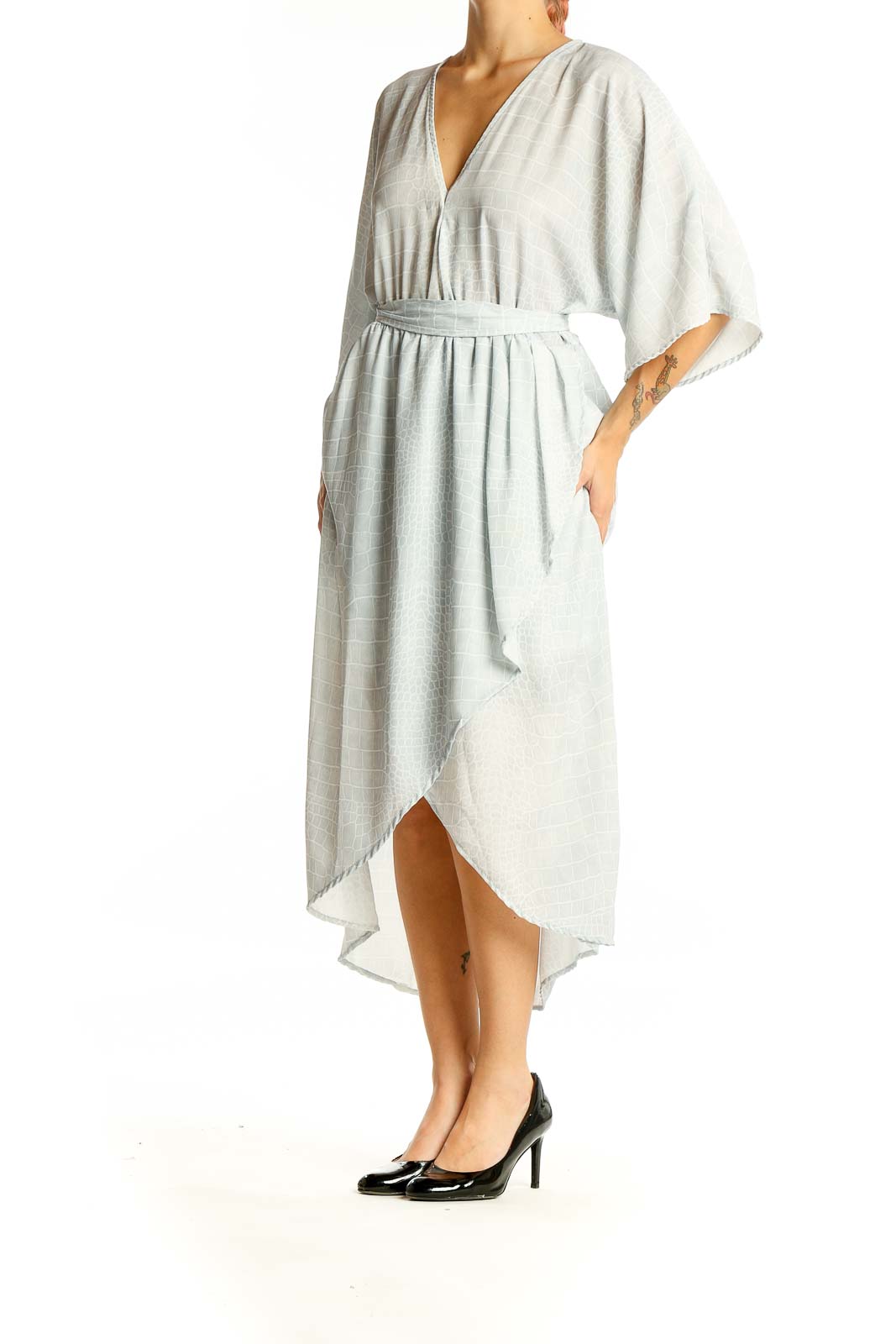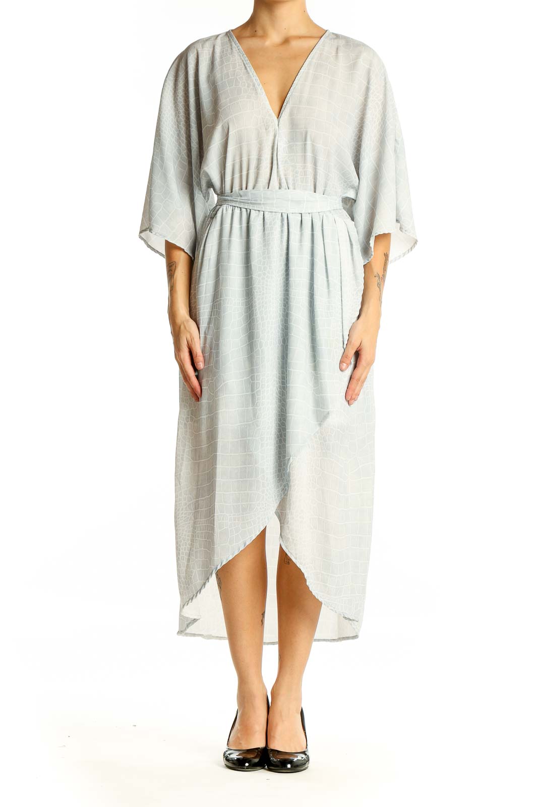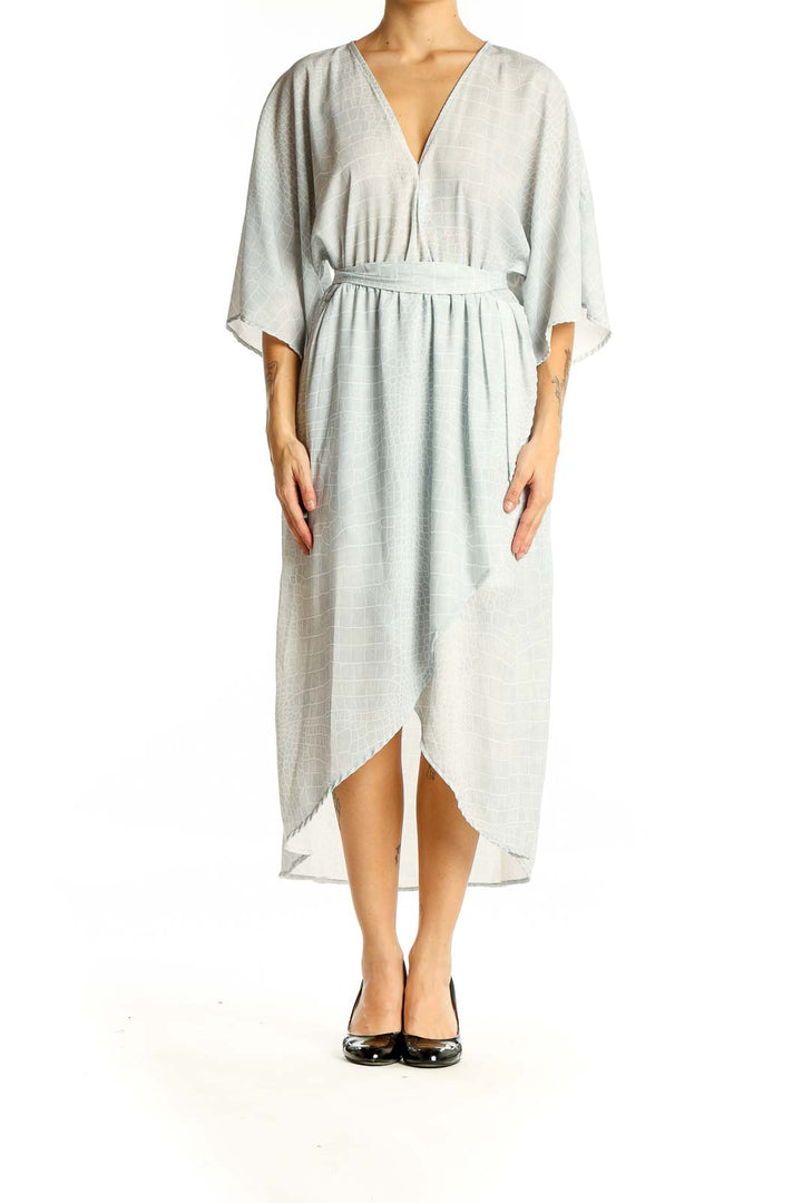 Elevate your wardrobe with this stunning light gray wrap midi dress from Peach Love California. This versatile piece features a flattering V-neckline and a wrap-style silhouette that cinches at the waist, creating an elegant and feminine look. The flowy kimono-style sleeves add a touch of bohemian charm, perfect for both casual outings and dressier occasions.
