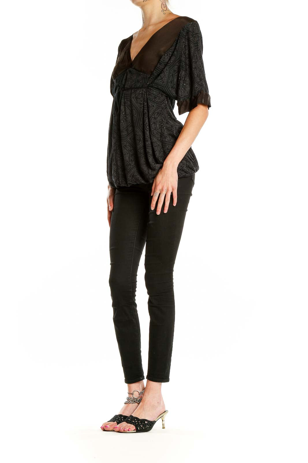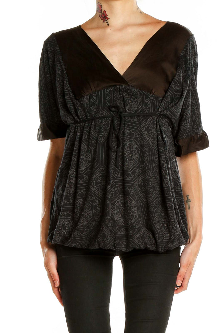Elevate your style with this sophisticated black patterned top from Ella Moss. The empire waist design creates a flattering silhouette, while the V-neckline adds a touch of elegance. The top features a unique geometric pattern in subtle tones, adding depth and interest to the overall look.