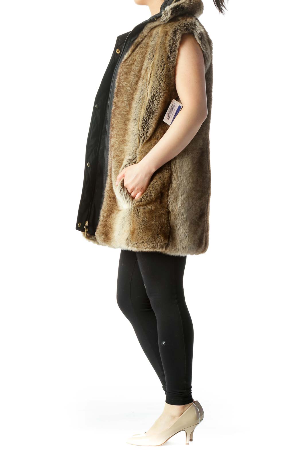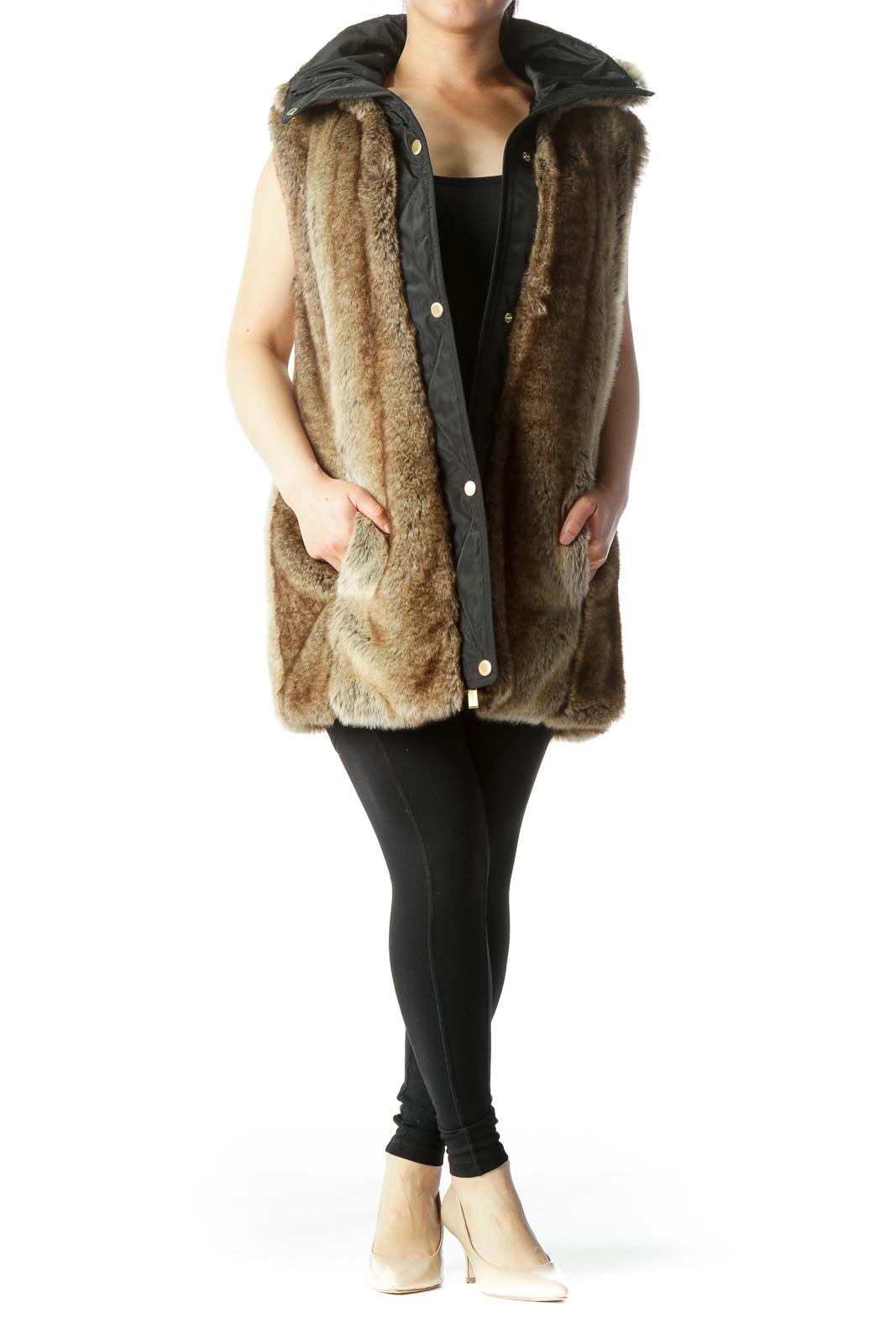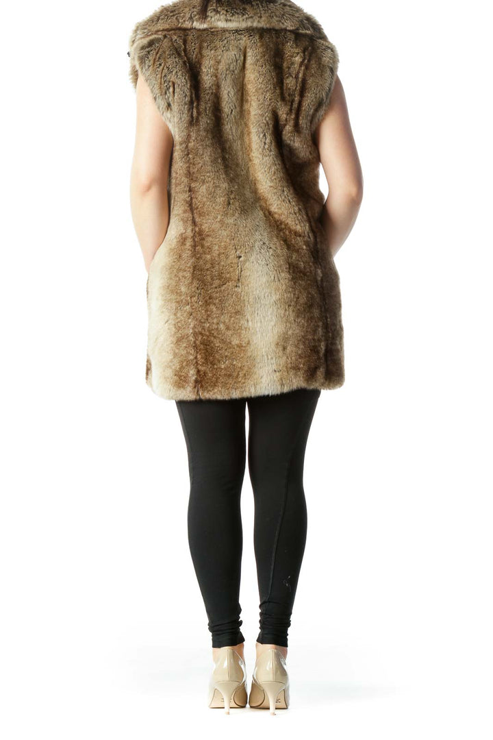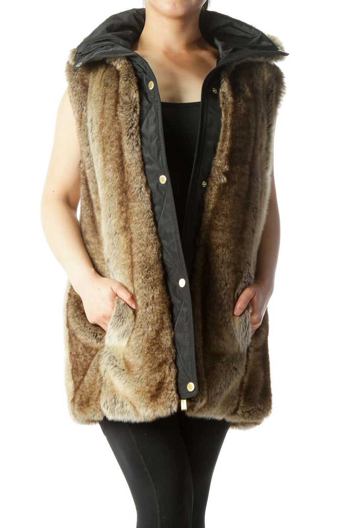 Black Brown Faux-Fur Hidden Hood in Zipper Vest
