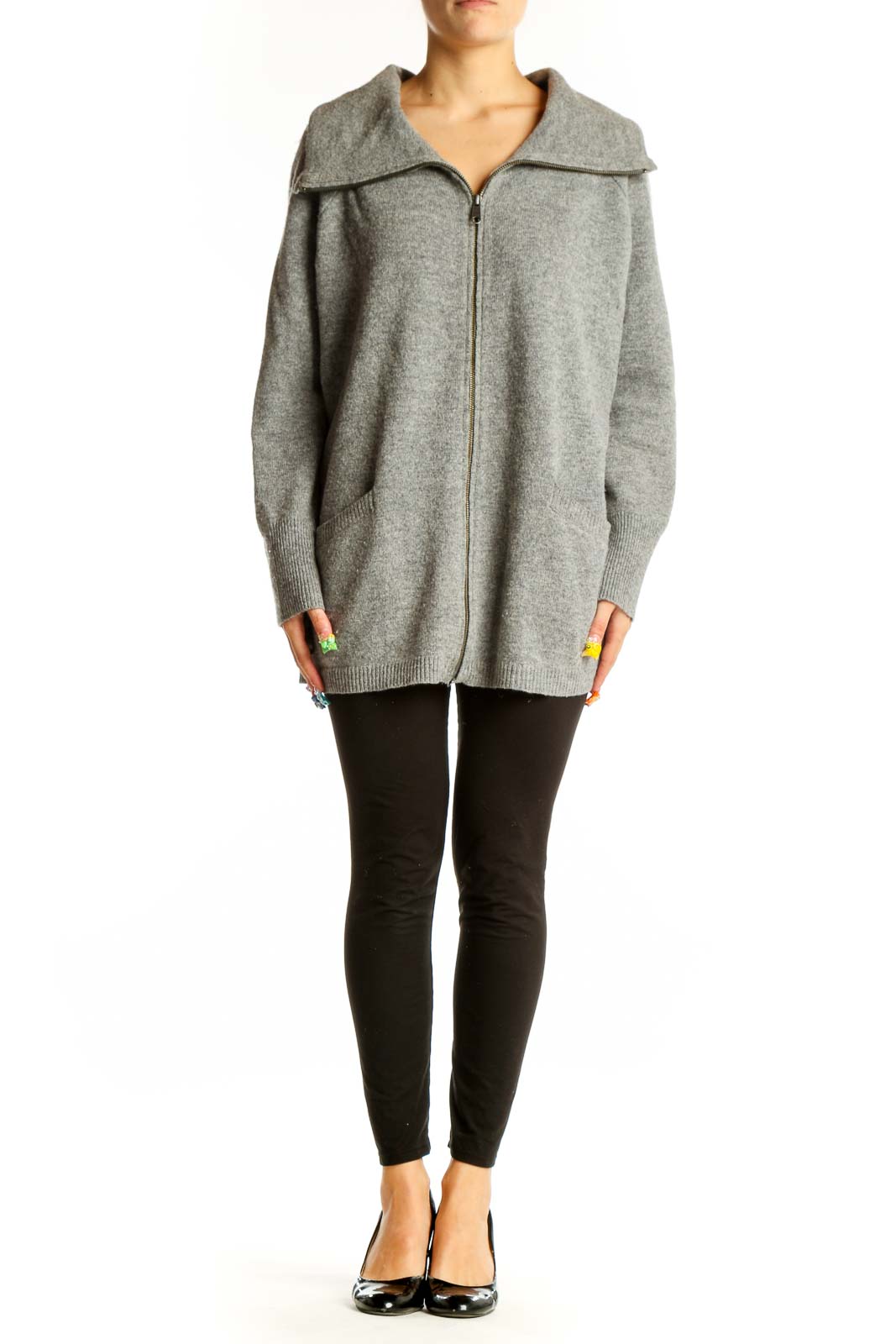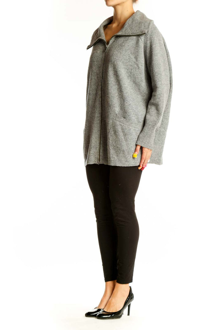 Wrap yourself in cozy comfort with this oversized gray knit cardigan from Ellen Tracy. Crafted from a soft blend of cotton and polyester, this versatile piece offers both warmth and style. The relaxed fit and generous collar create a laid-back silhouette perfect for casual outings or lounging at home. Featuring a full-length zipper for easy wear and convenient front pockets, this cardigan combines practicality with effortless chic. The ribbed cuffs and hem add a touch of texture and ensure a snug fit. In excellent condition, this medium-sized cardigan boasts impressive measurements with a 52" bust, 49" waist, and 33" length, making it an ideal layering piece for various body types. Whether paired with jeans for a weekend look or over a dress for added warmth, this Ellen Tracy cardigan is sure to become a go-to item in your wardrobe.