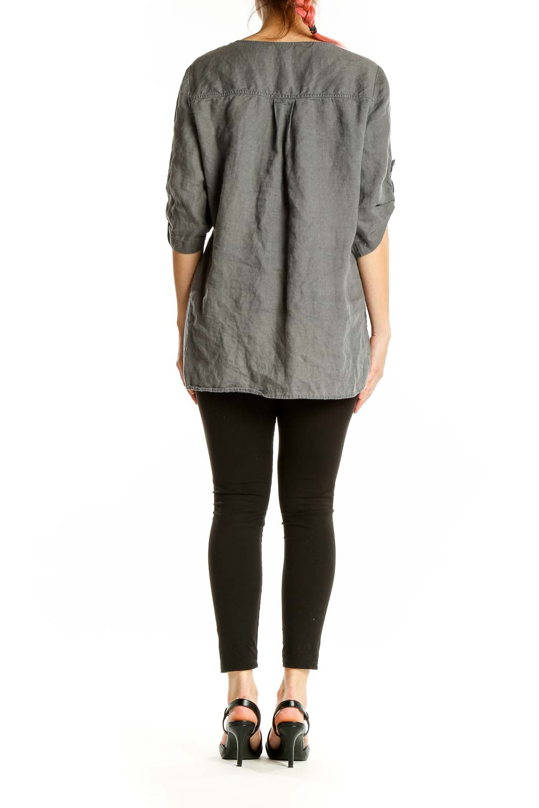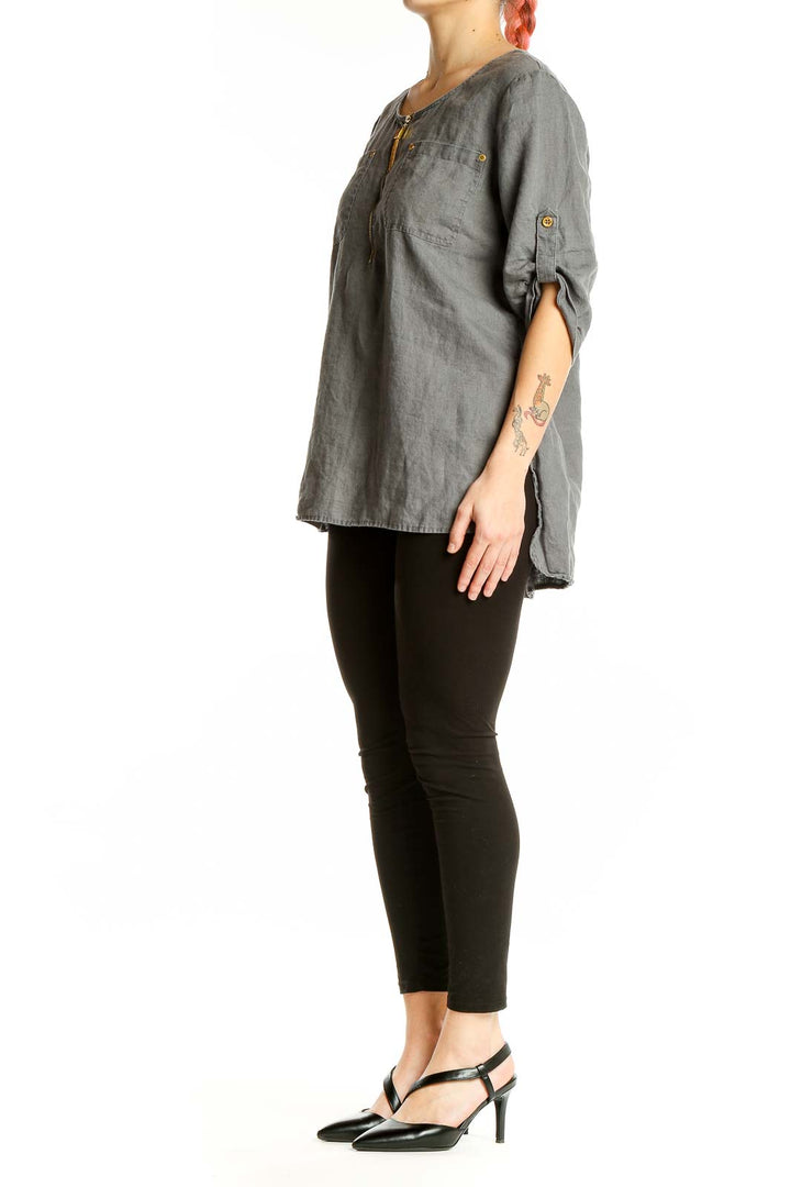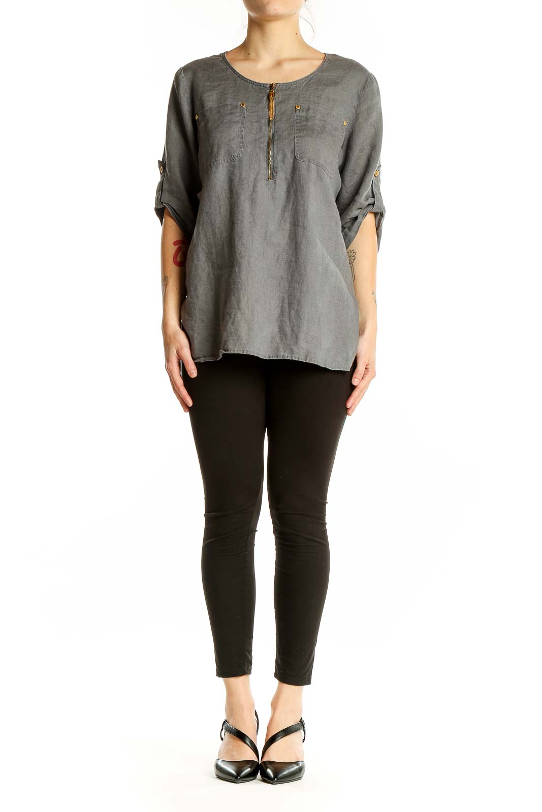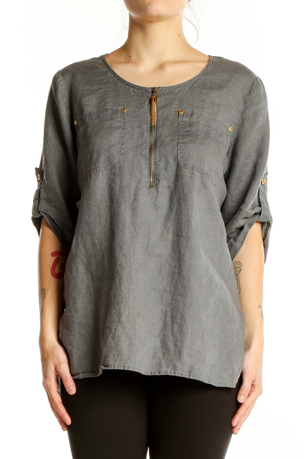 Elevate your casual wardrobe with this chic gray linen tunic top from Ellen Tracy. Perfect for warm weather, this versatile piece features a flattering scoop neckline and a convenient front zip closure. The relaxed fit and roll-tab sleeves offer adjustable comfort, while the two front pockets add a touch of functionality. Crafted from breathable linen, this top ensures you stay cool and comfortable all day long. The soft gray hue makes it easy to pair with various bottoms, from jeans to skirts. In good condition, this medium-sized tunic is a must-have addition to your summer collection.