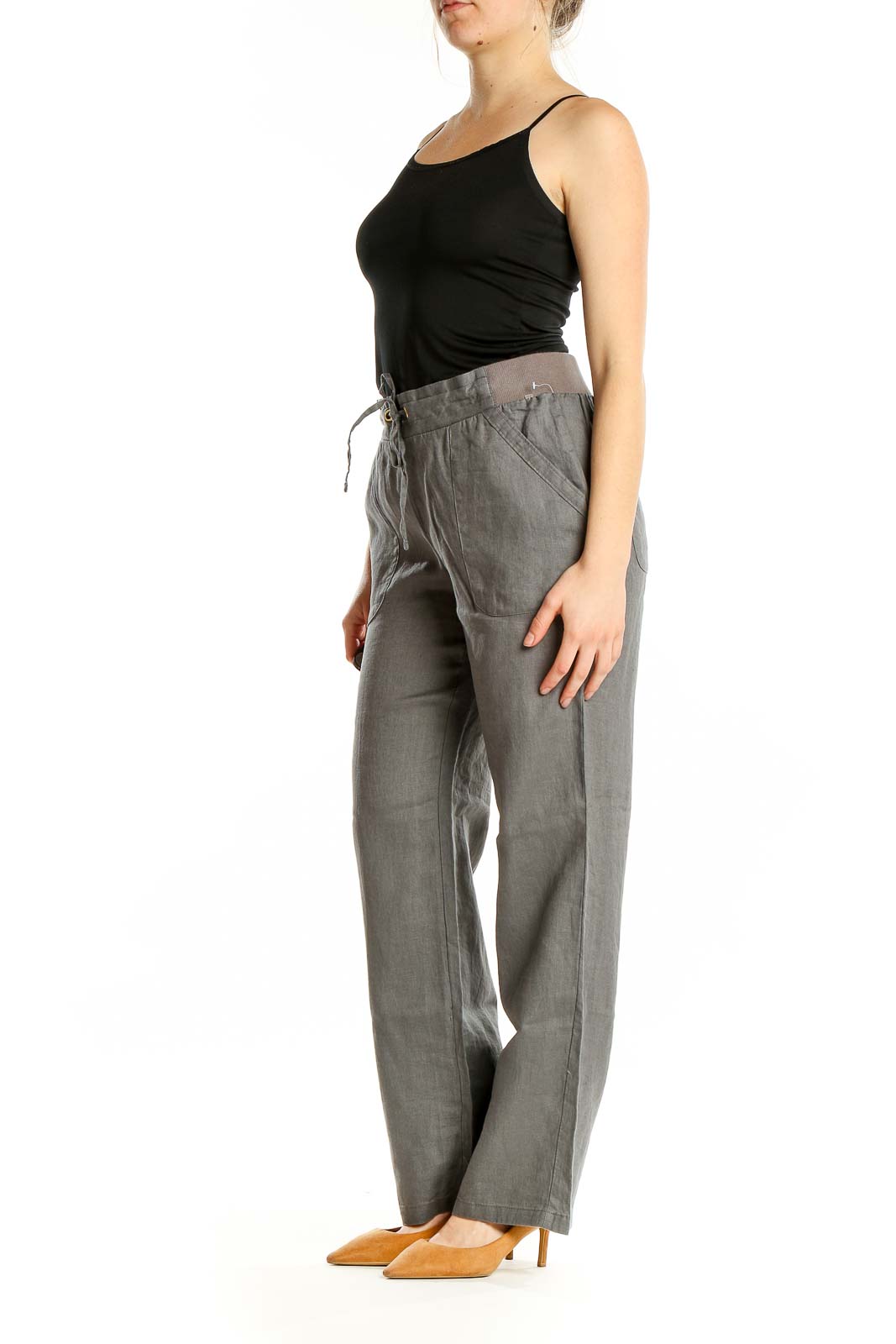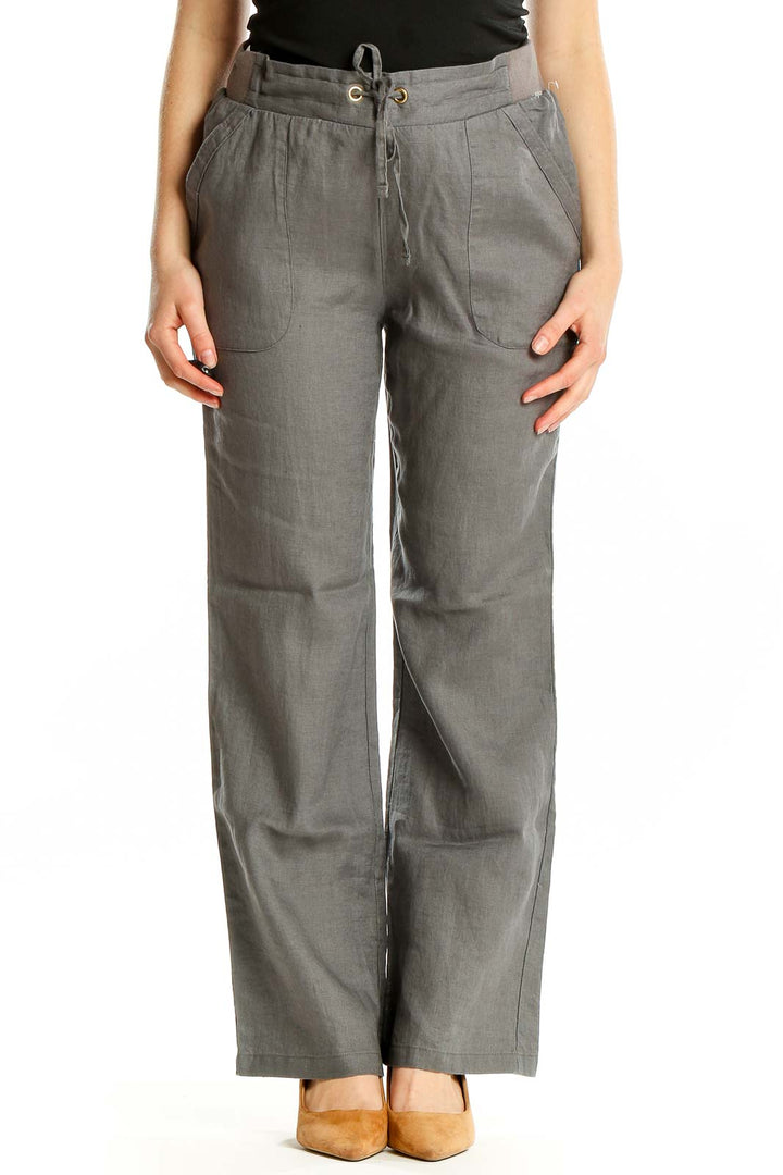 Front view of Ellen Tracy gray linen wide-leg pants with drawstring waist