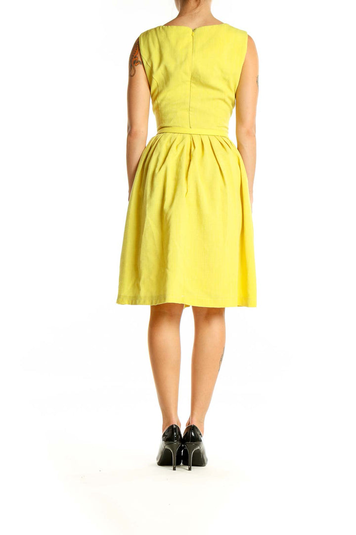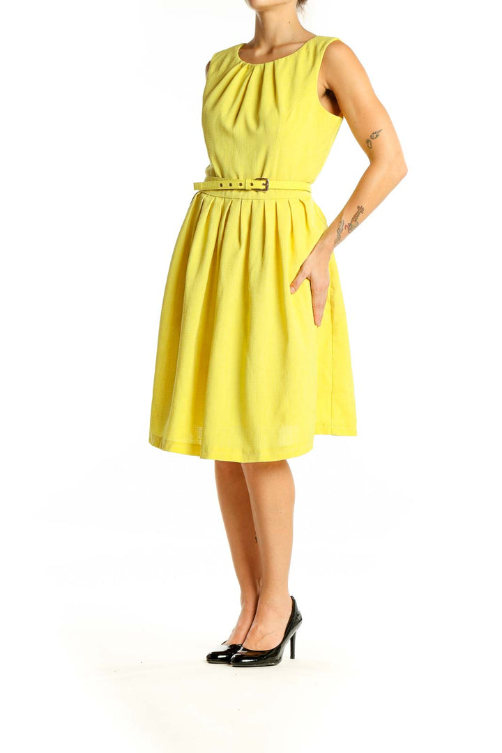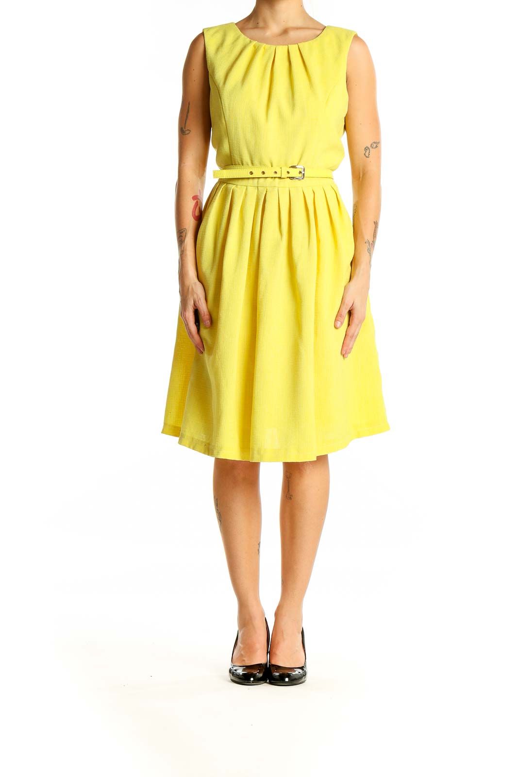 Brighten up your wardrobe with this stunning yellow sleeveless dress from Ellen Tracy. This eye-catching piece features a classic A-line silhouette with elegant pleating at the neckline and waist, creating a flattering and feminine shape. The vibrant yellow hue is perfect for making a statement at summer events or adding a pop of color to your office attire.